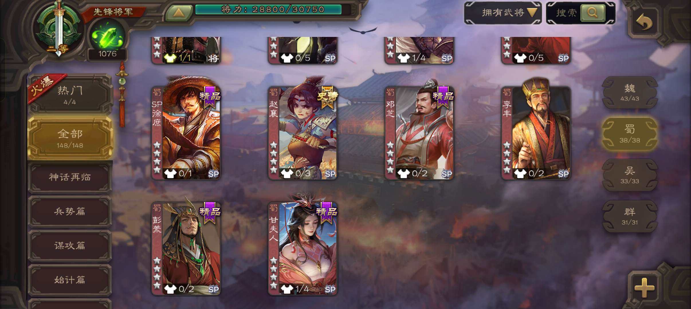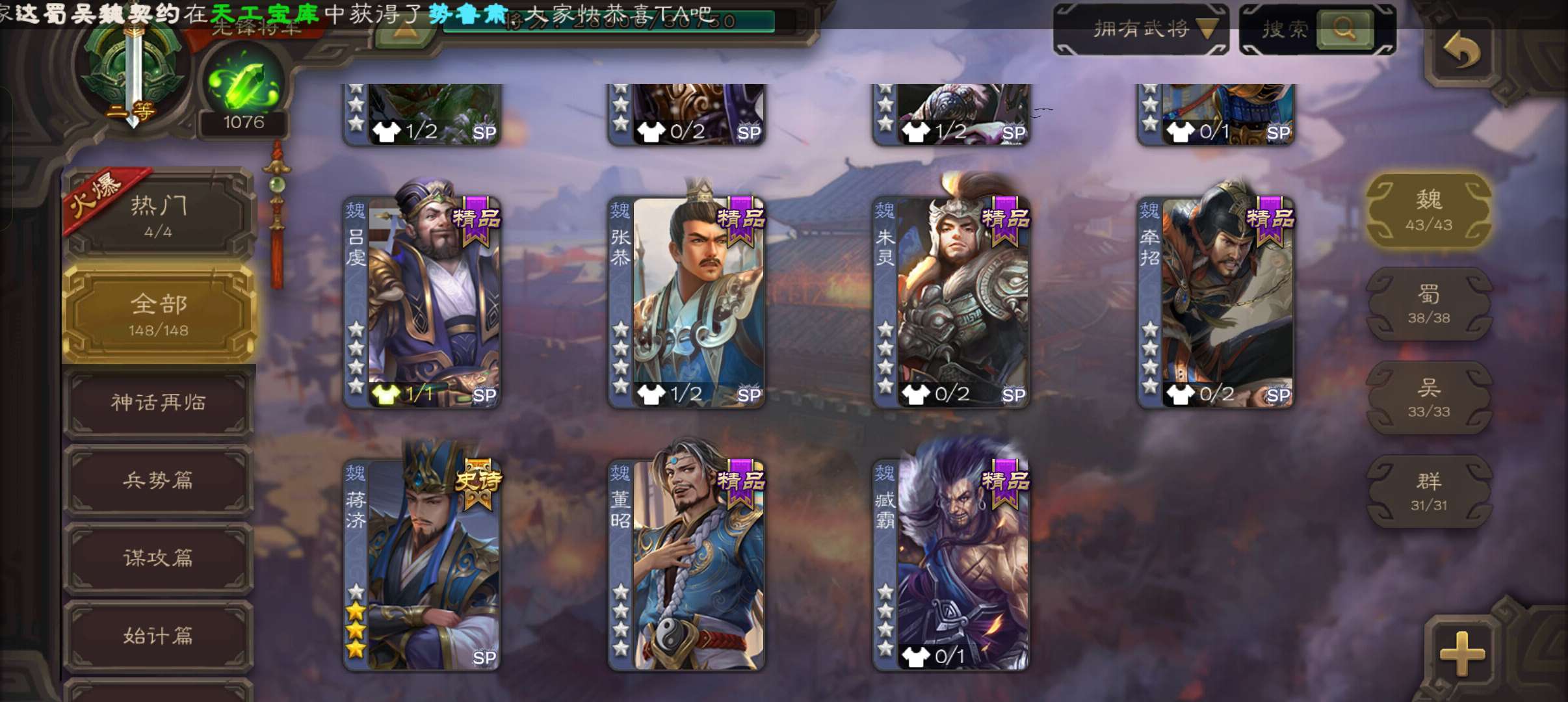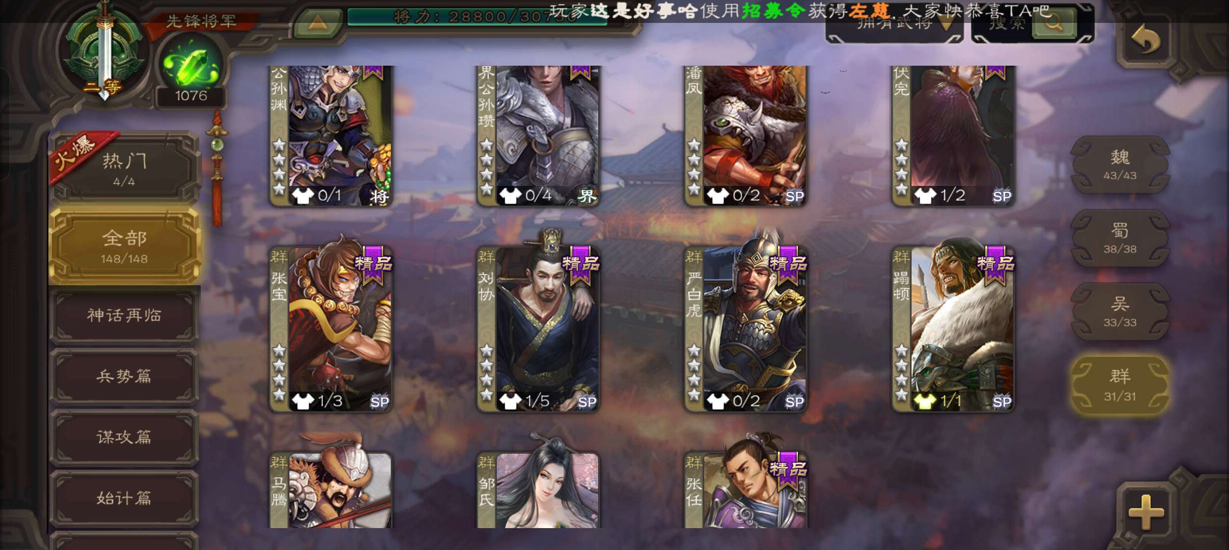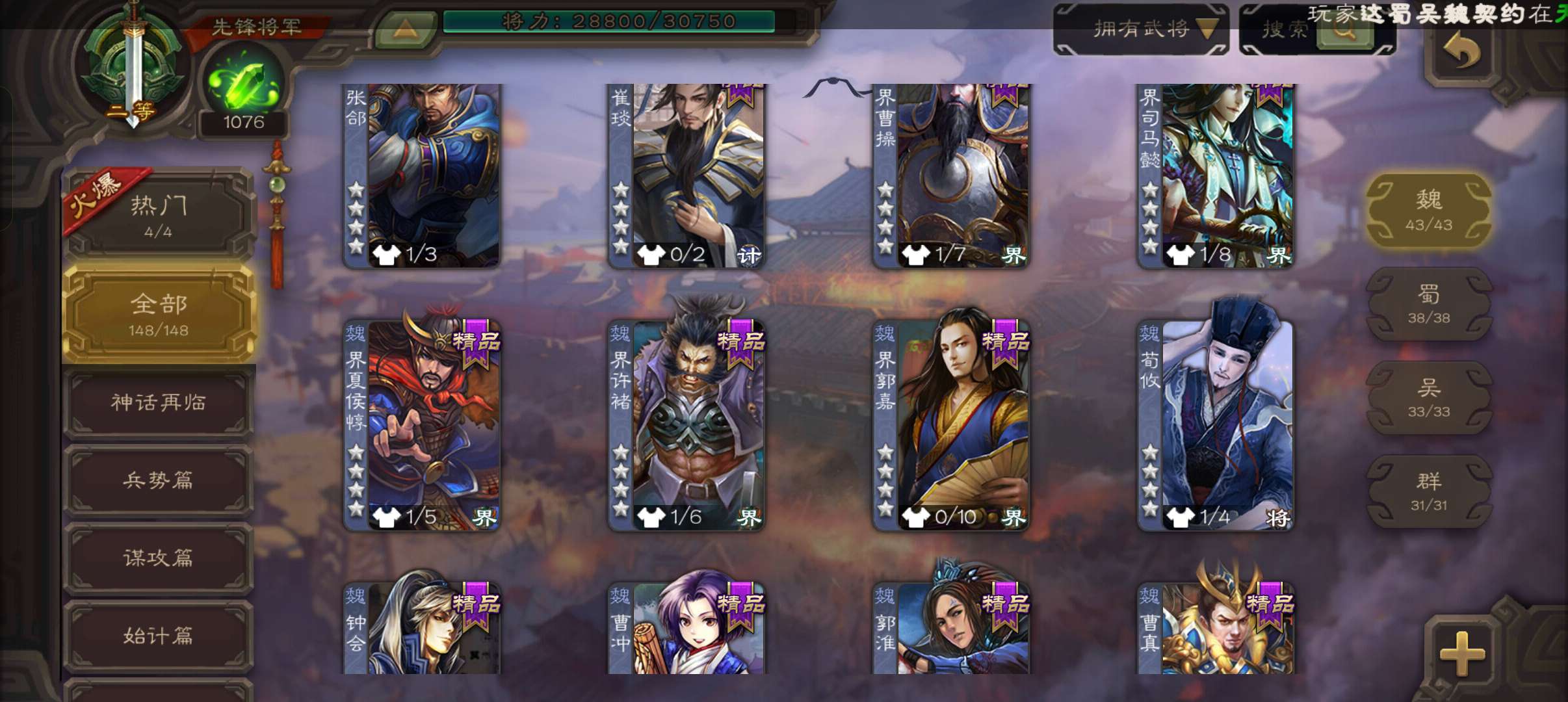 4史诗3神先锋,天工势庞羲,蒋济神吕布吴景赵襄,神周瑜神吕蒙界孙权界吕布崔琰甘夫人彭恙孙茹148将