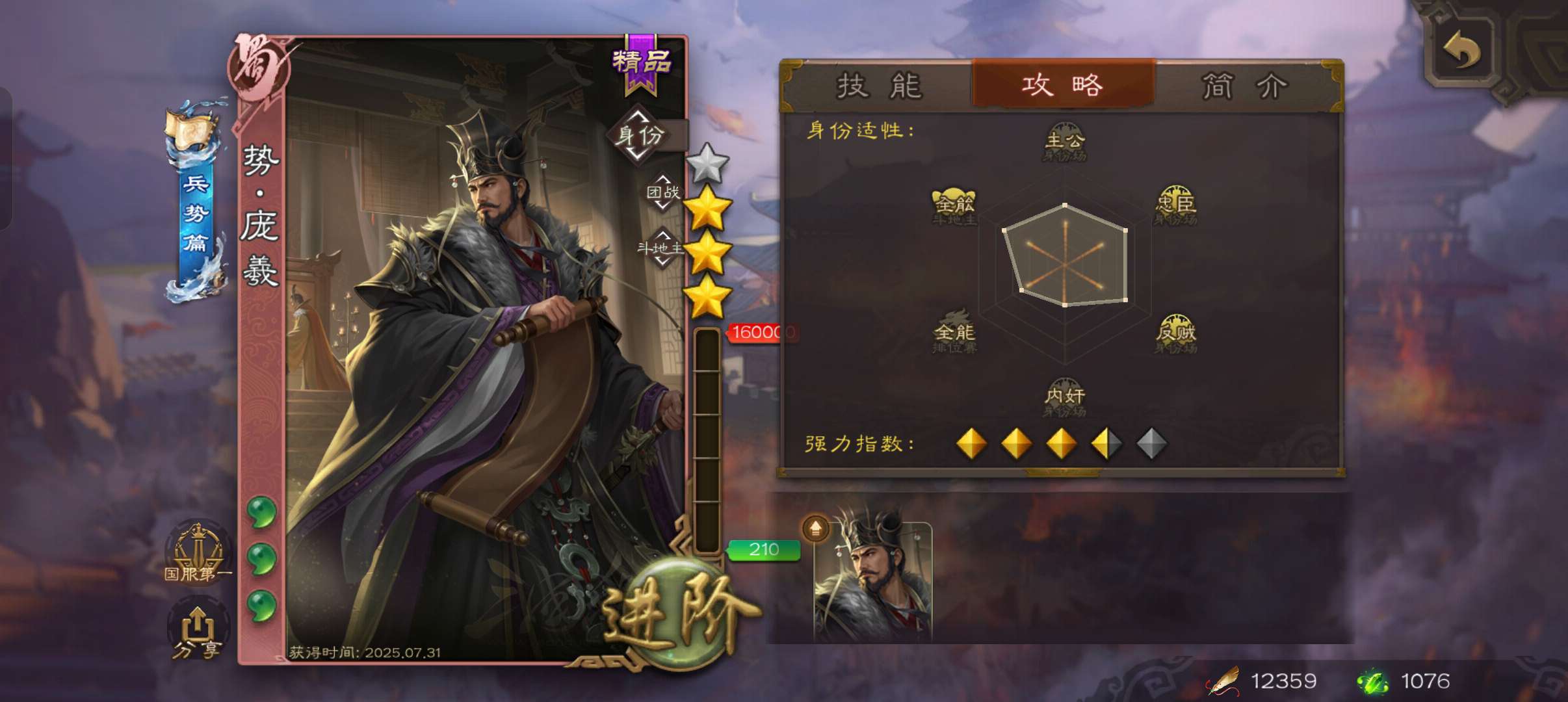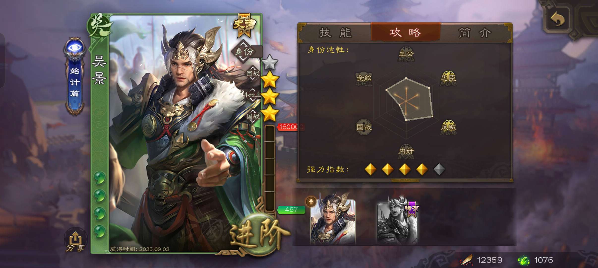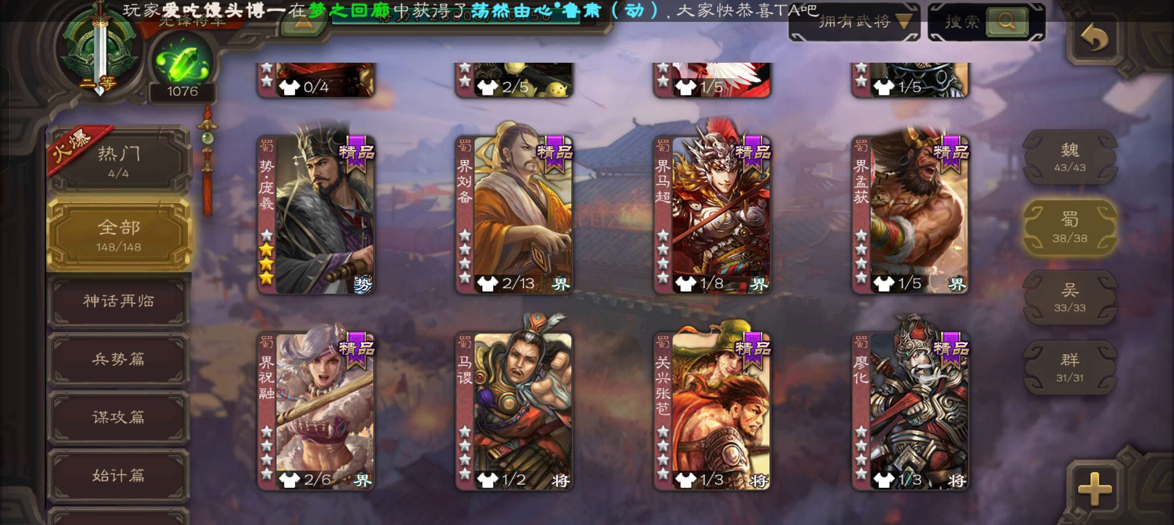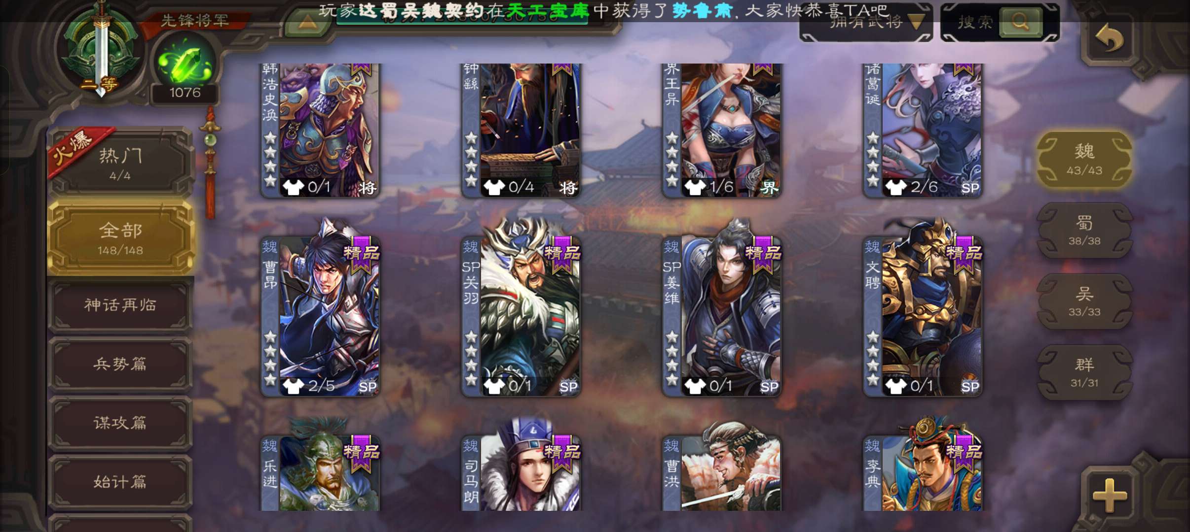 4史诗3神先锋,天工势庞羲,蒋济神吕布吴景赵襄,神周瑜神吕蒙界孙权界吕布崔琰甘夫人彭恙孙茹148将
