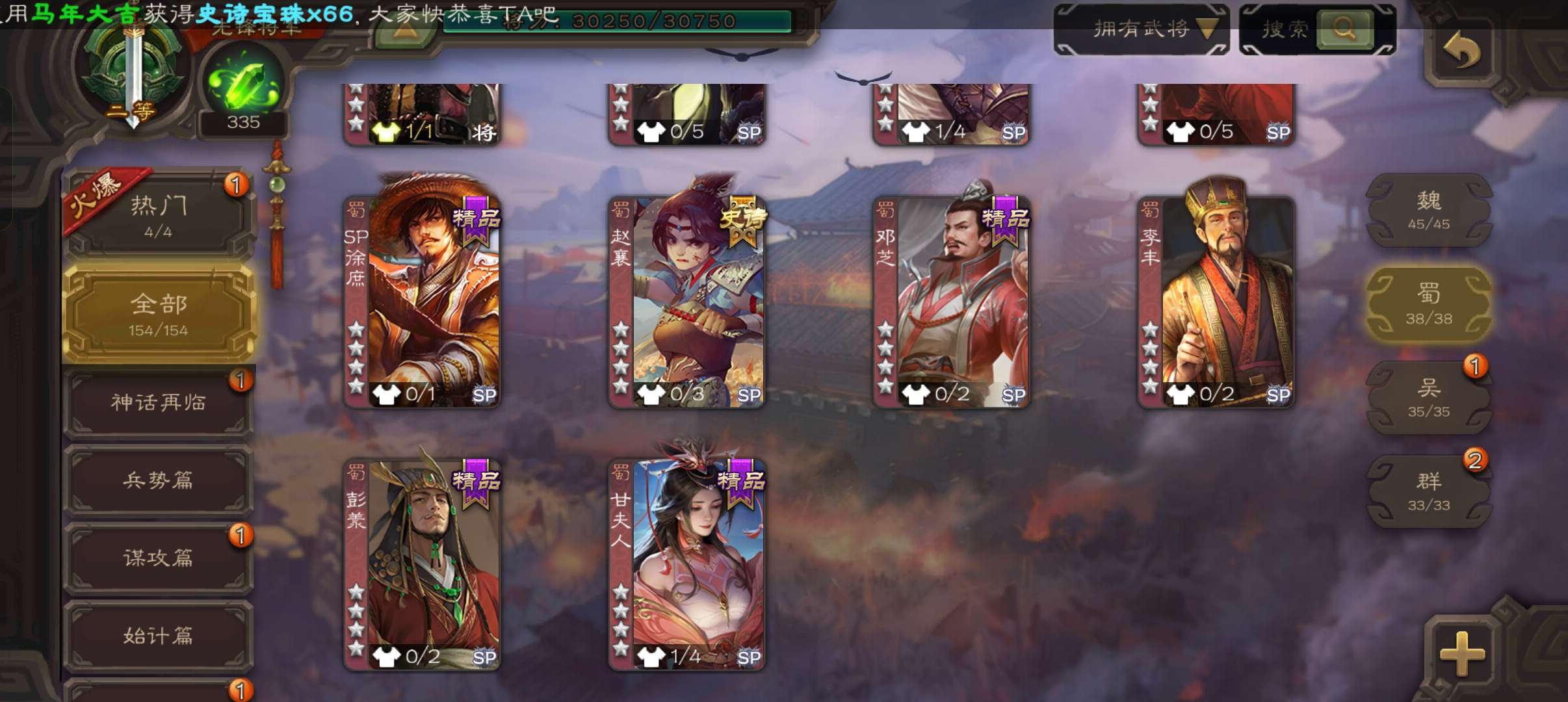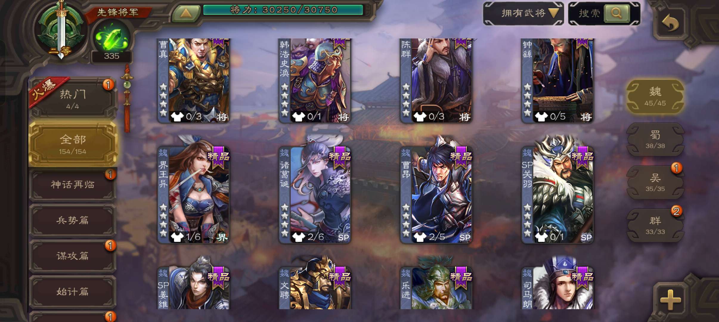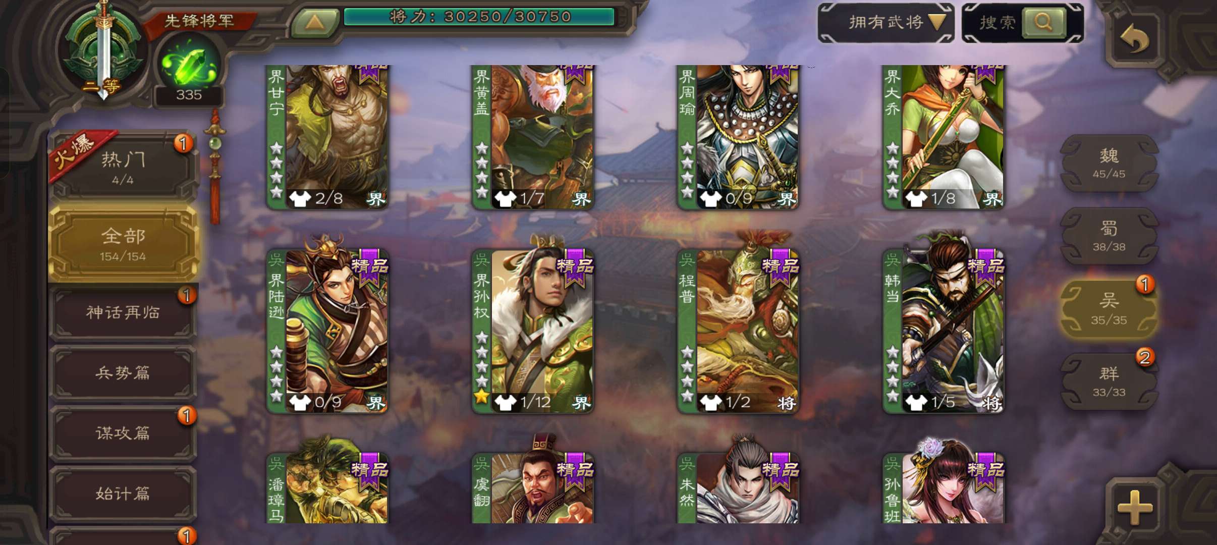 5史诗3神先锋,天工势庞羲,蒋济神吕布吴景赵襄左慈,玉龙孙茹神周瑜神吕蒙界孙权谋韩当154将