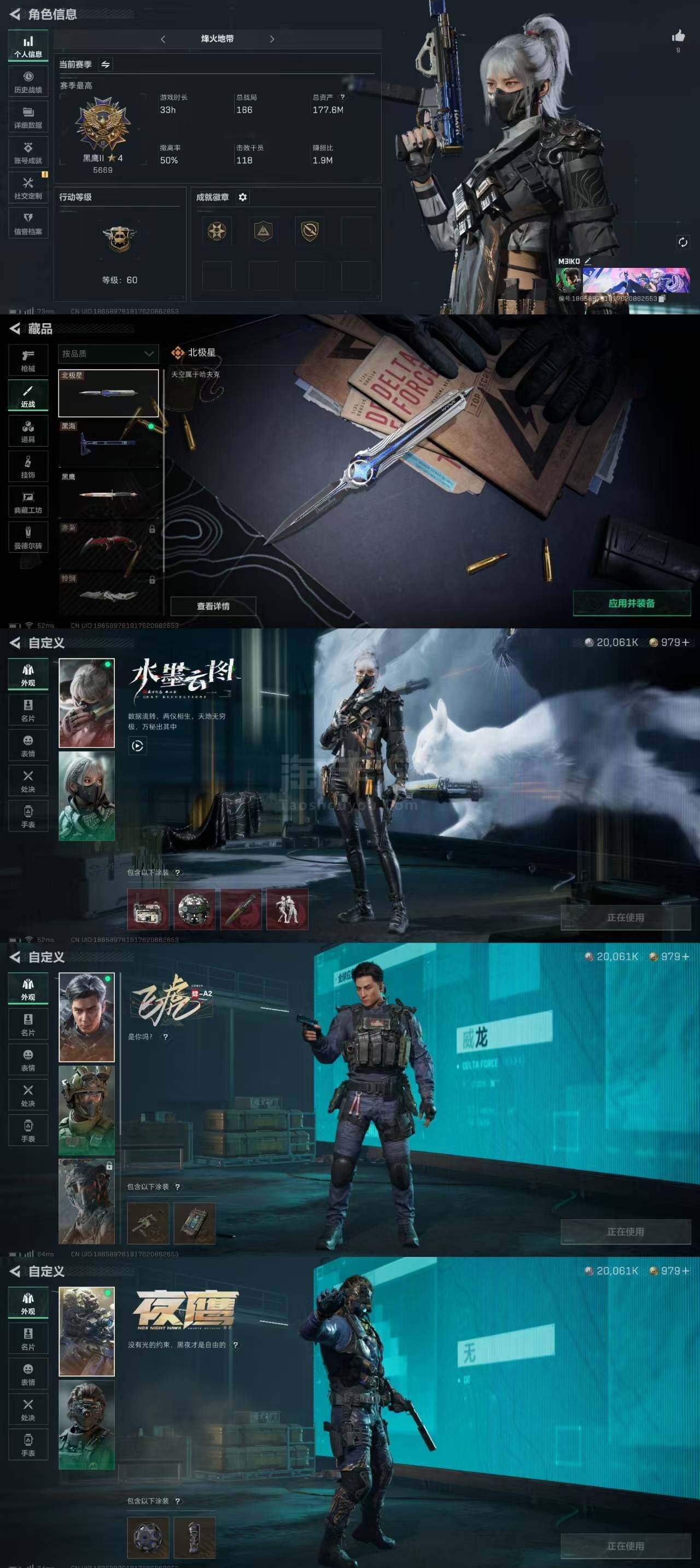 苹果QQ 【干员外观】:骇爪-水墨云图,威龙-飞虎,无名-夜鹰【近战皮肤】:近战-黑鹰