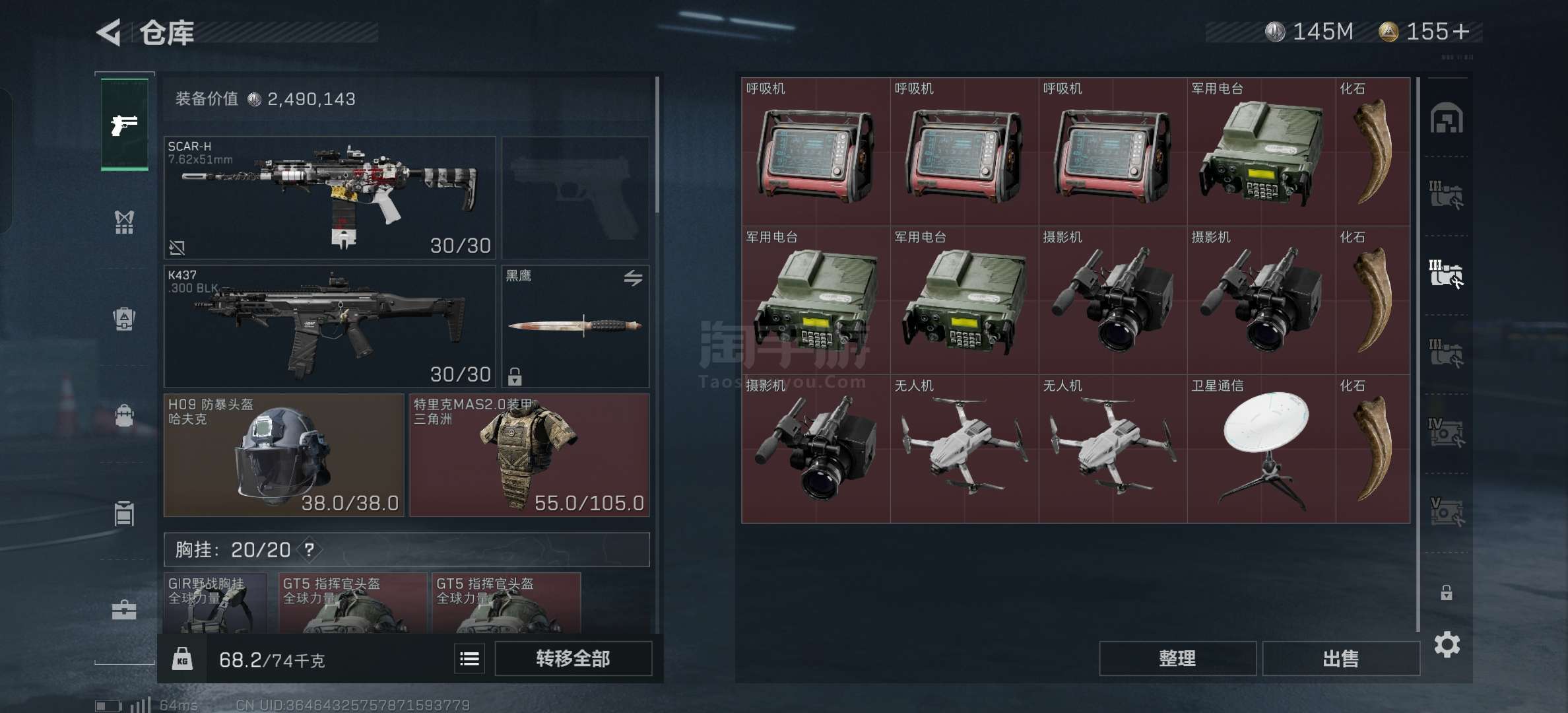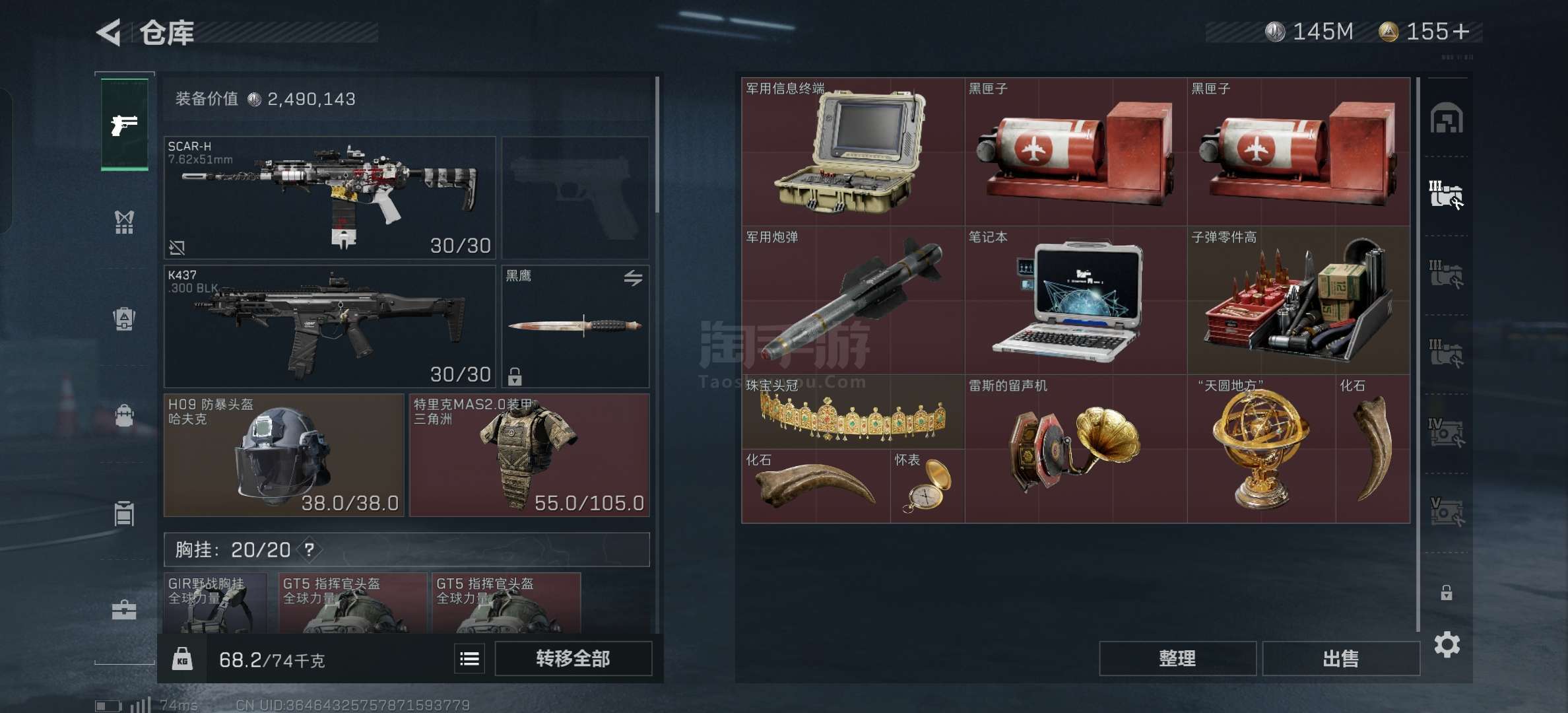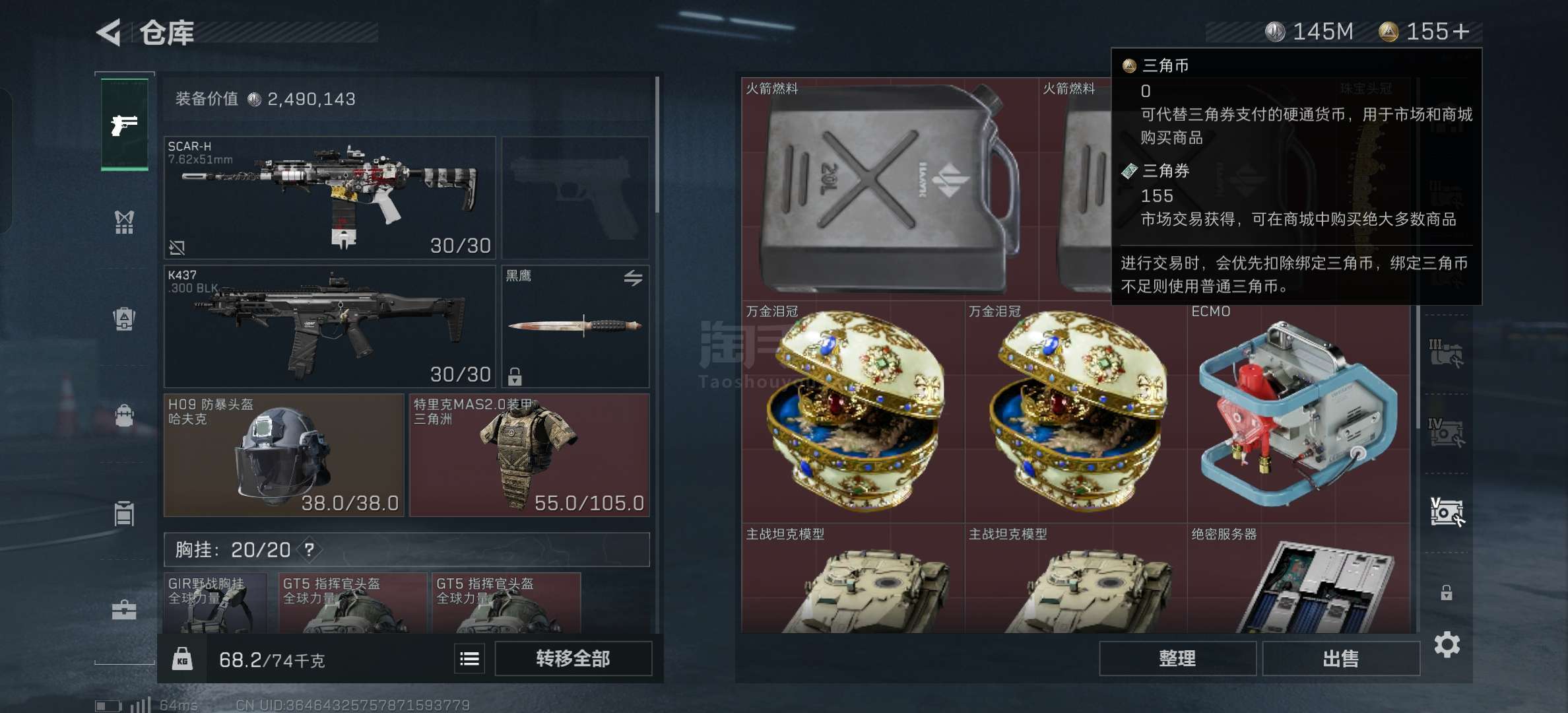 苹果Q-仓库价值286.8M哈夫币145M还有155个三角券,有6格有蜂医皮肤,爆率超高