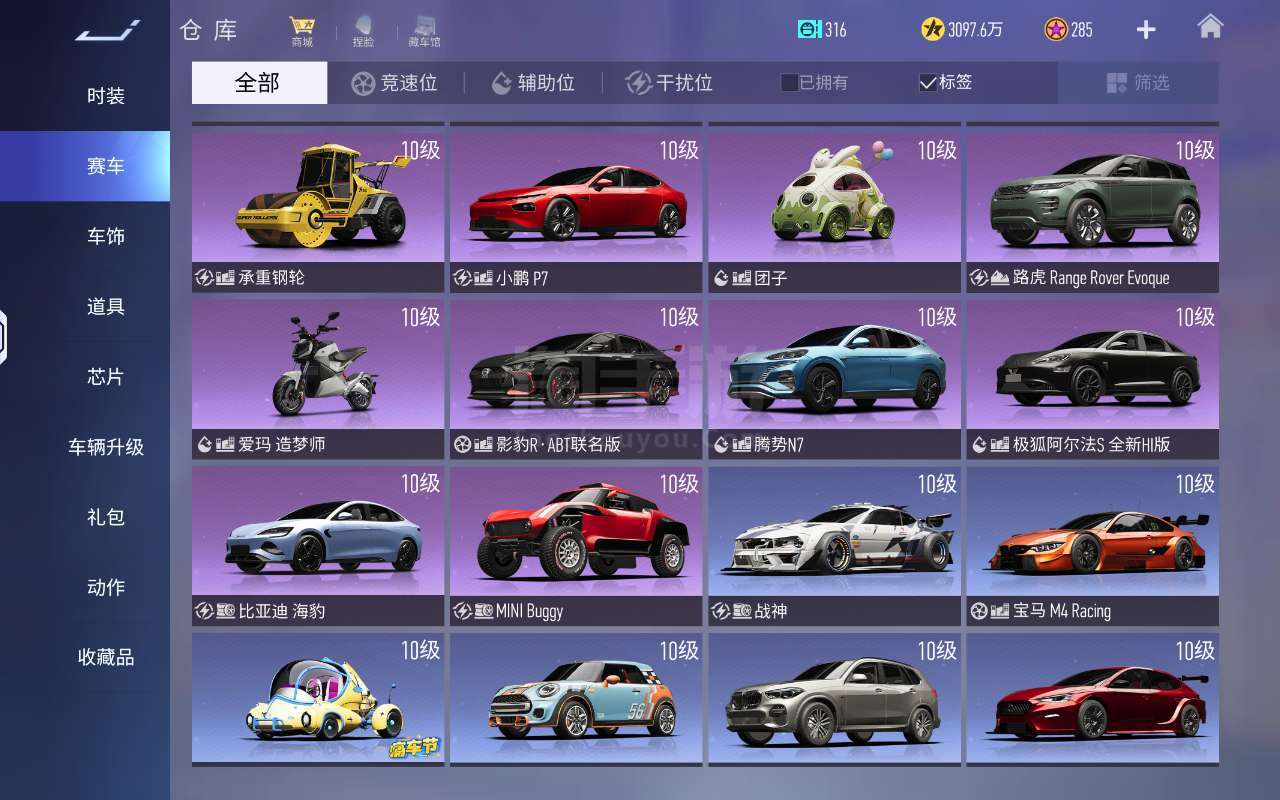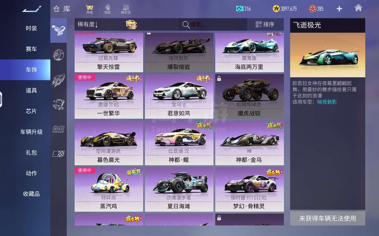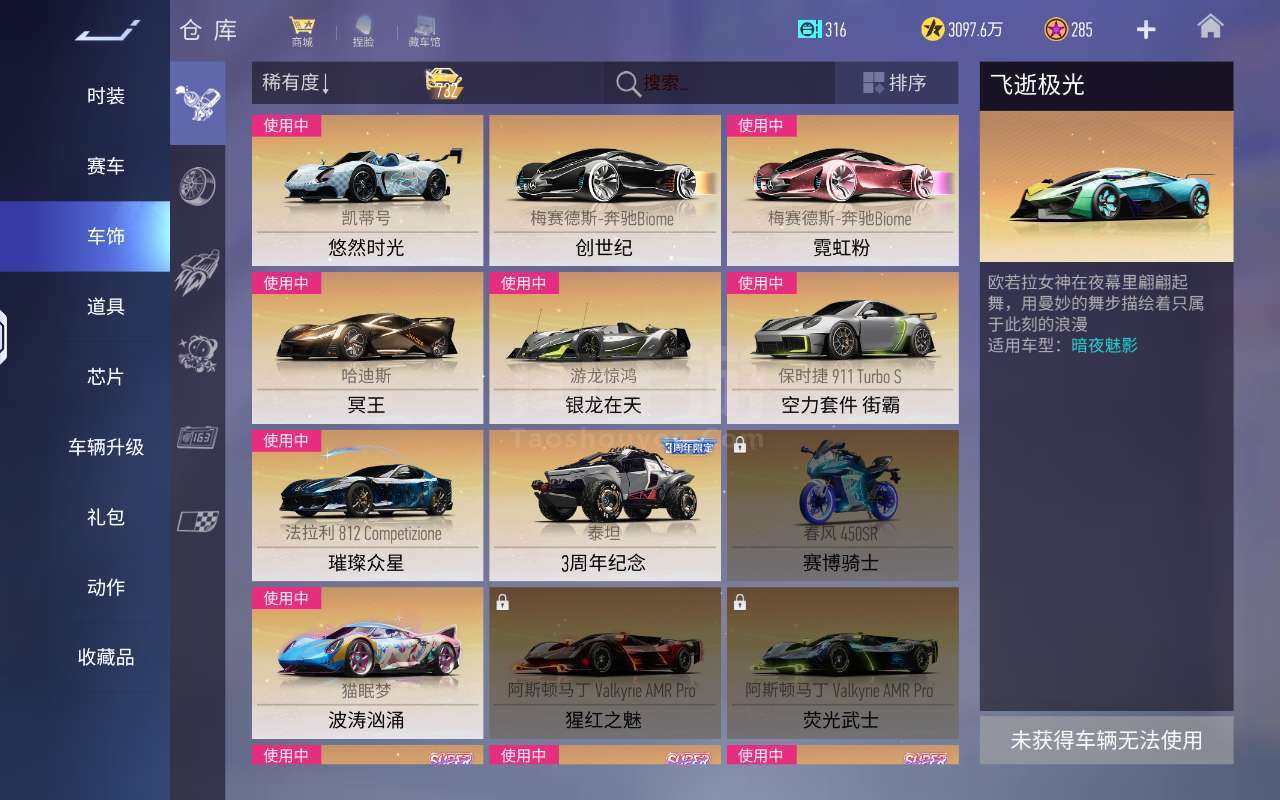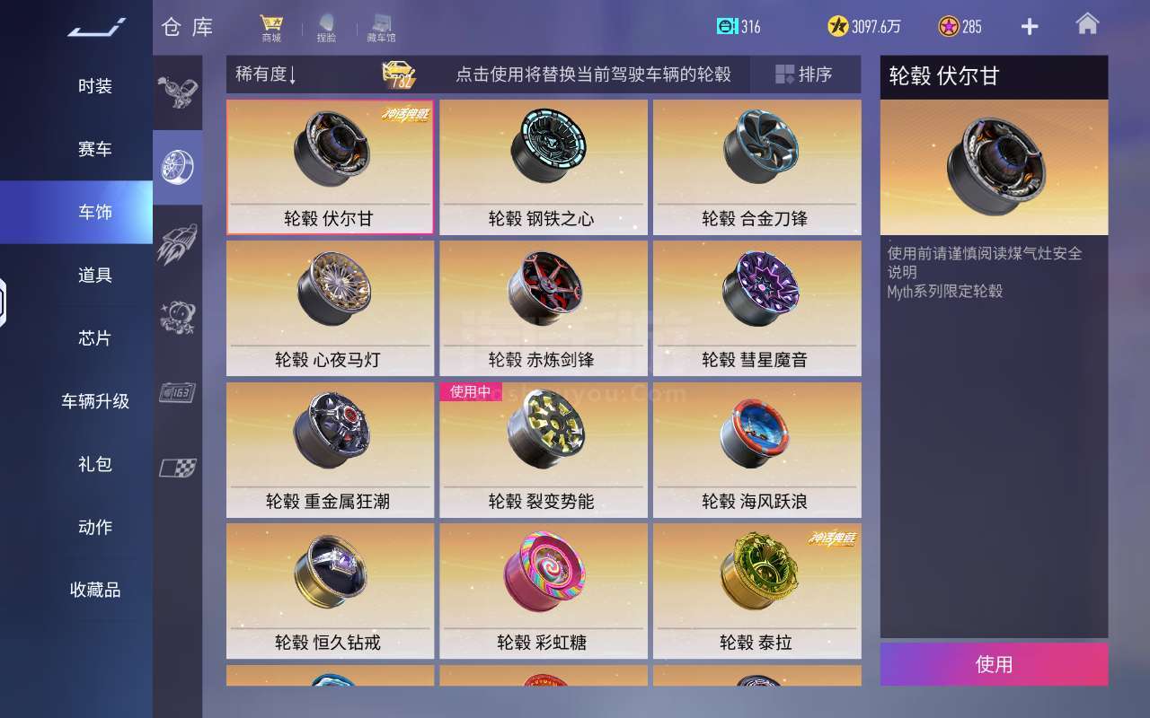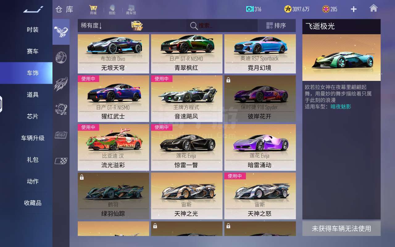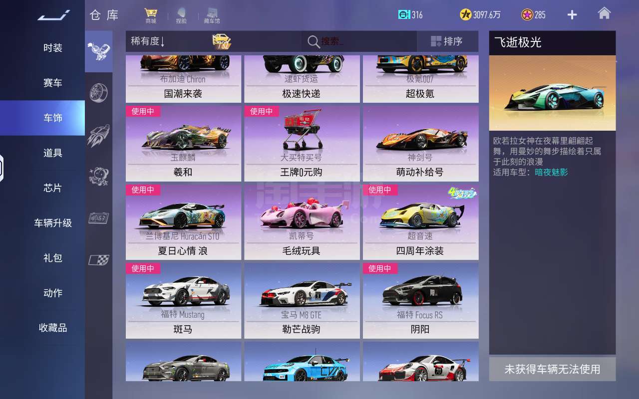 芯片团魂足够,车辆多达133辆,主要车辆基本都有皮肤,轮毂也多,称号也多,还有四百多纪念币