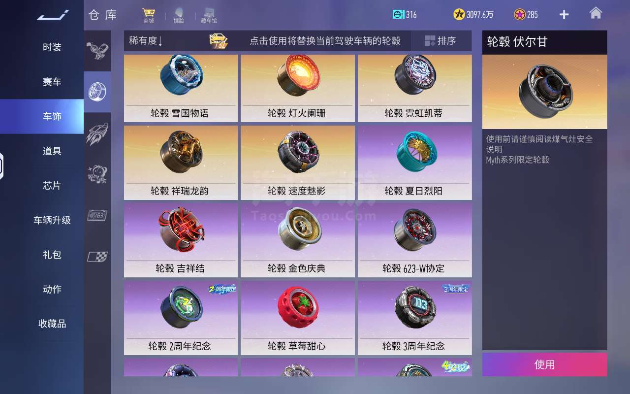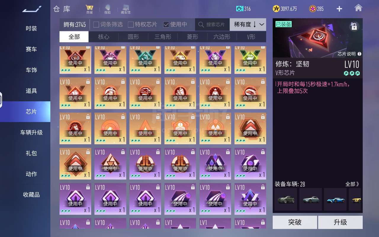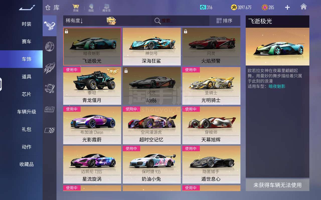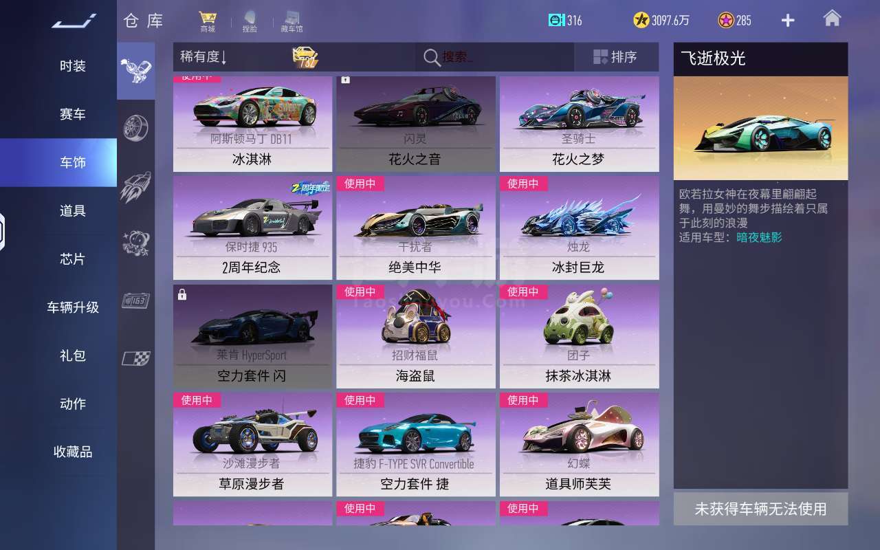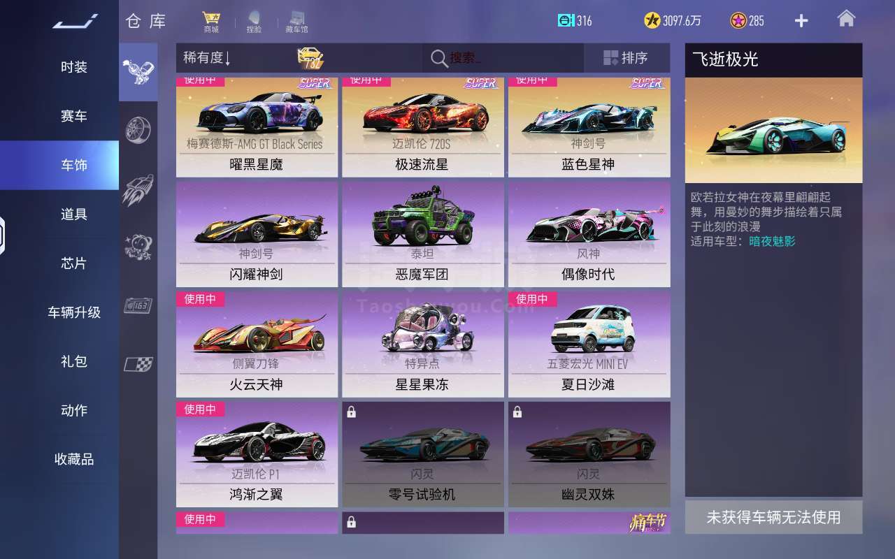 芯片团魂足够,车辆多达133辆,主要车辆基本都有皮肤,轮毂也多,称号也多,还有四百多纪念币