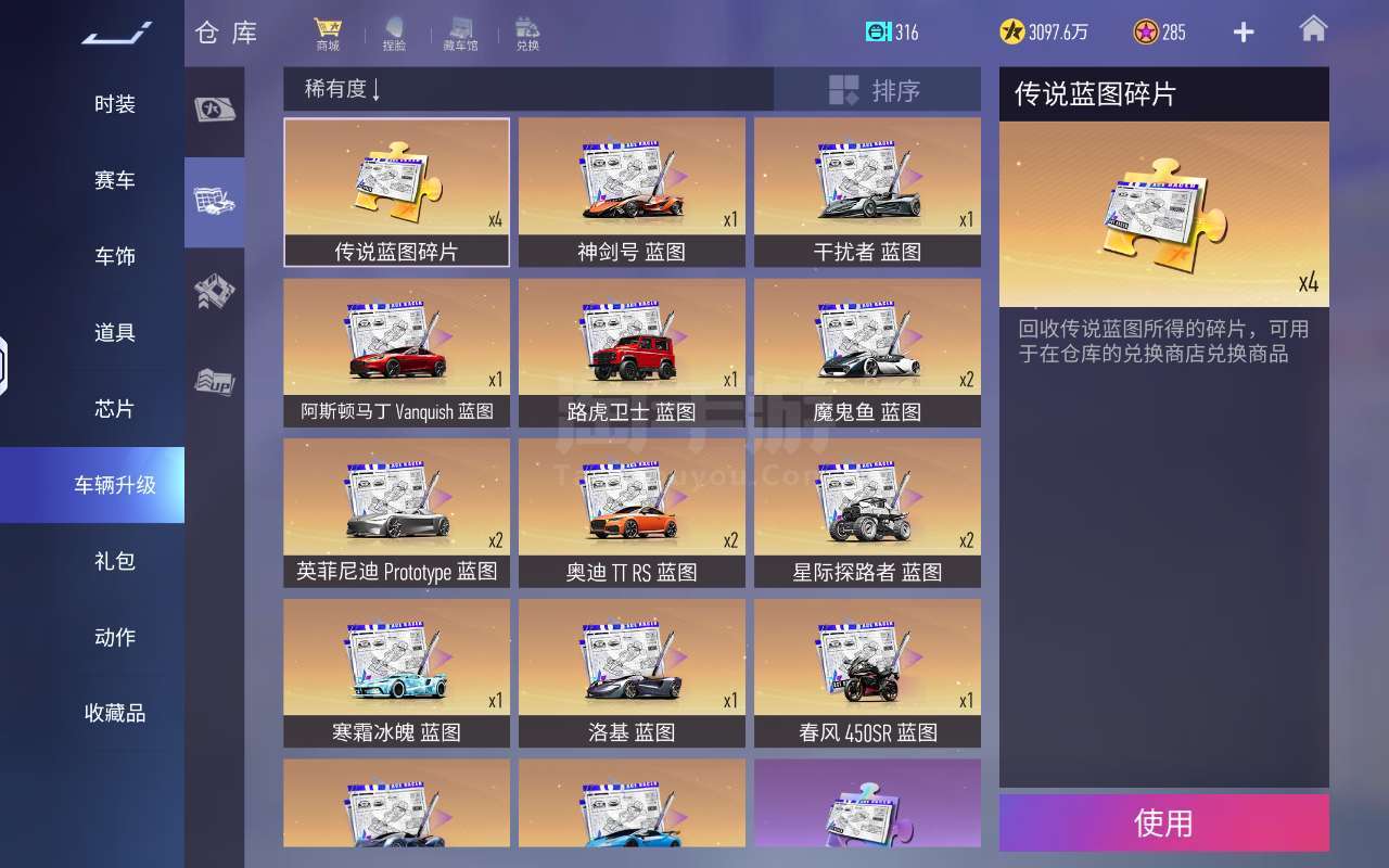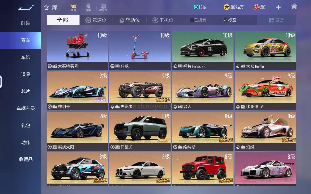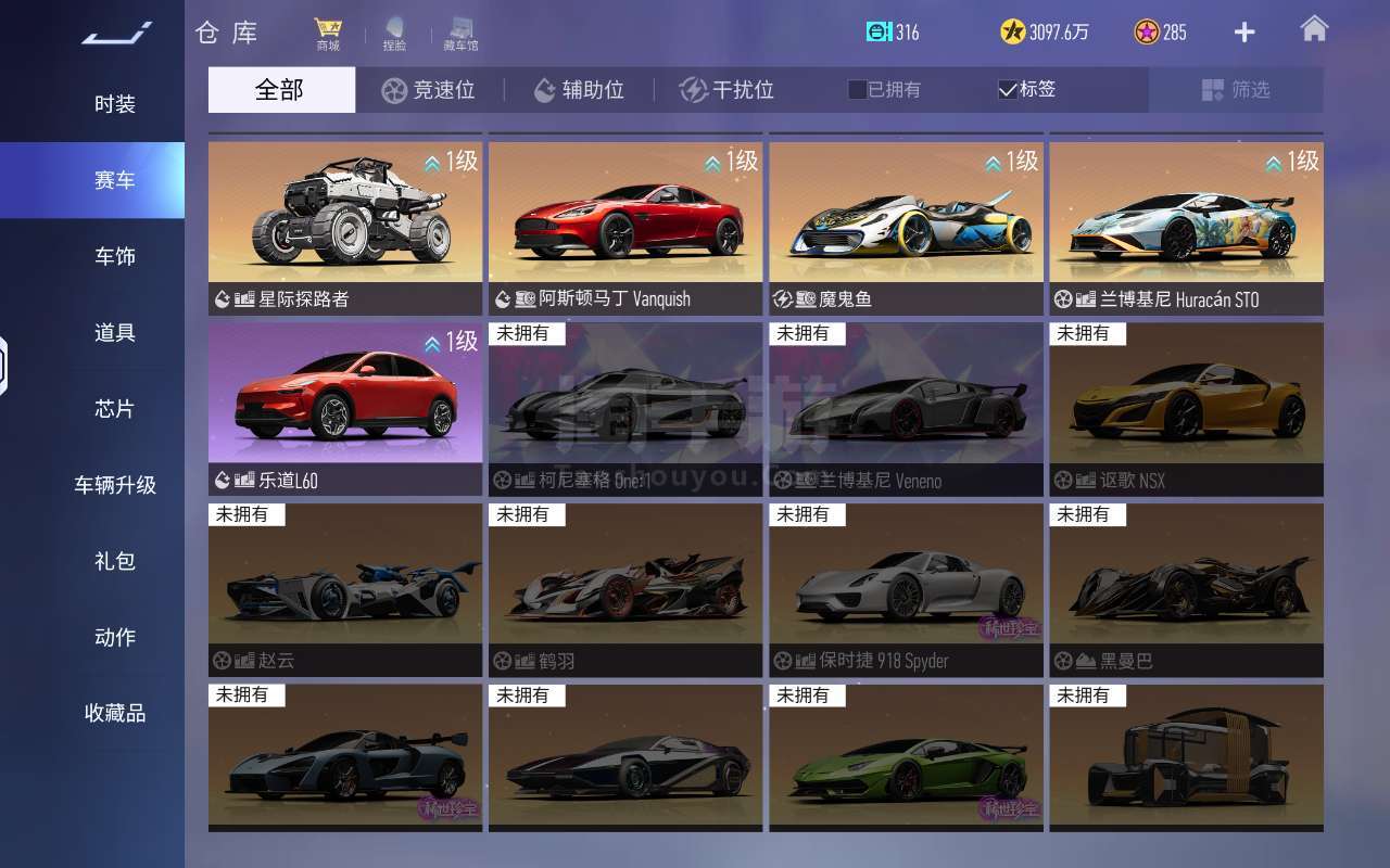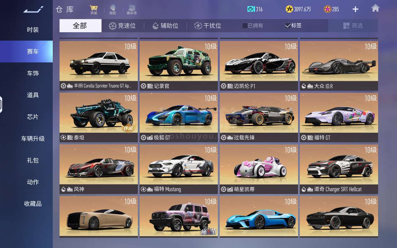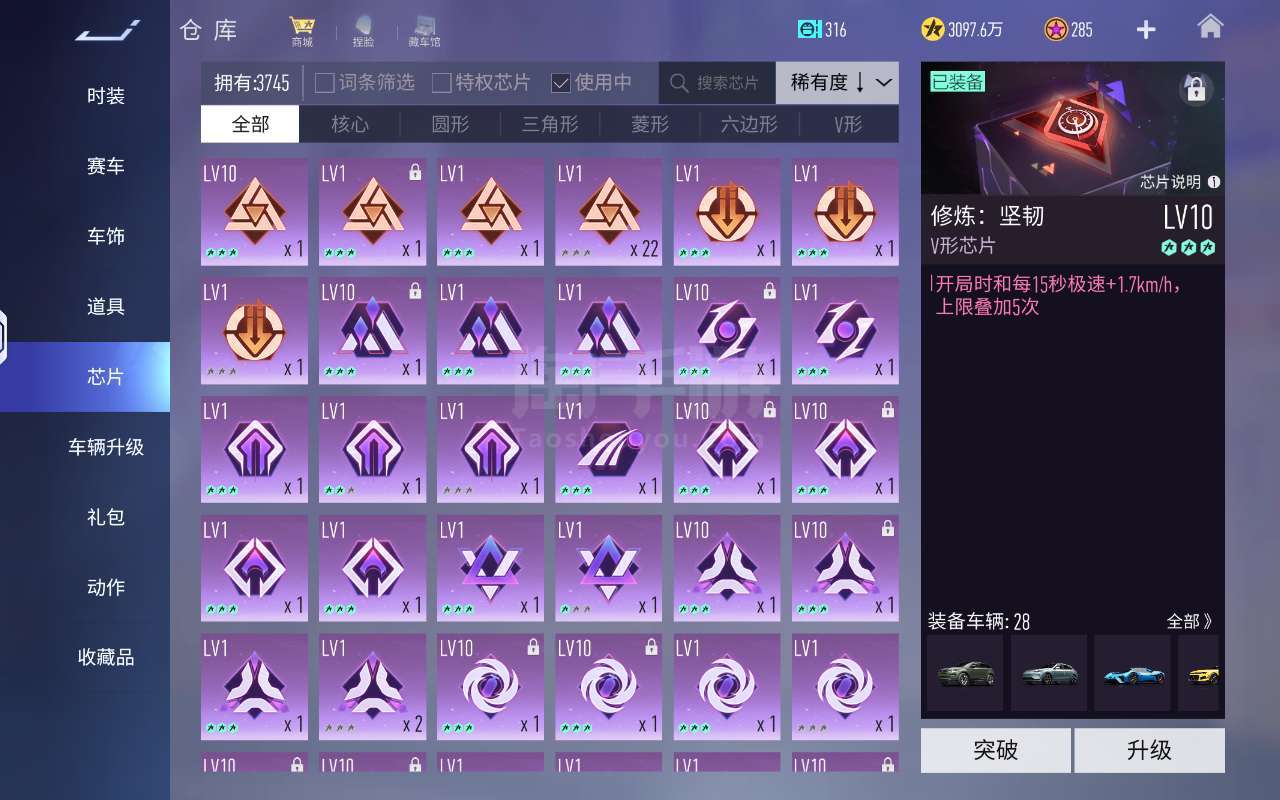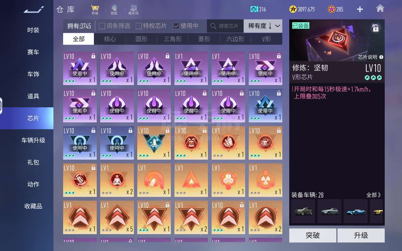 芯片团魂足够,车辆多达133辆,主要车辆基本都有皮肤,轮毂也多,称号也多,还有四百多纪念币