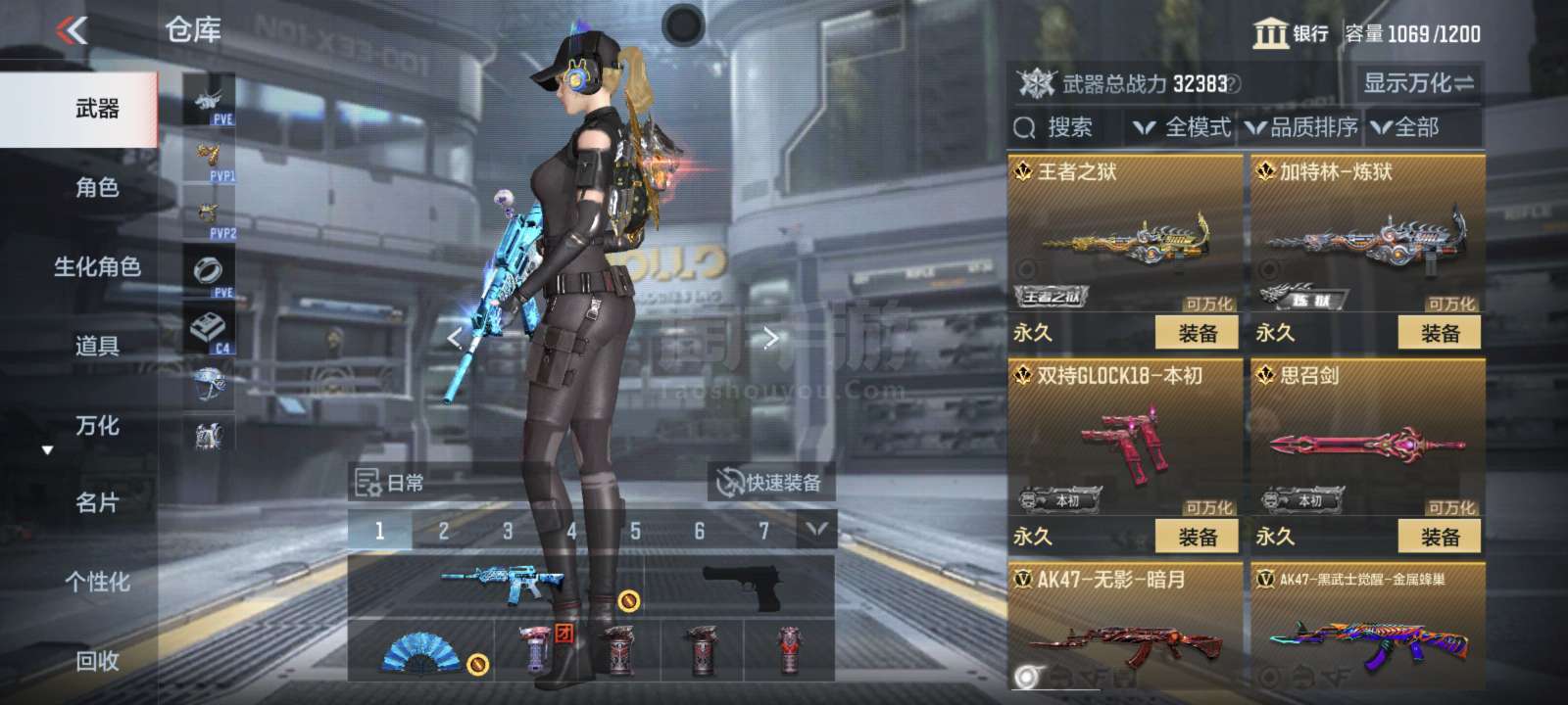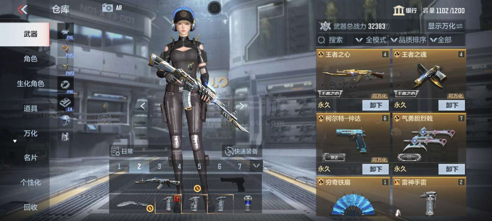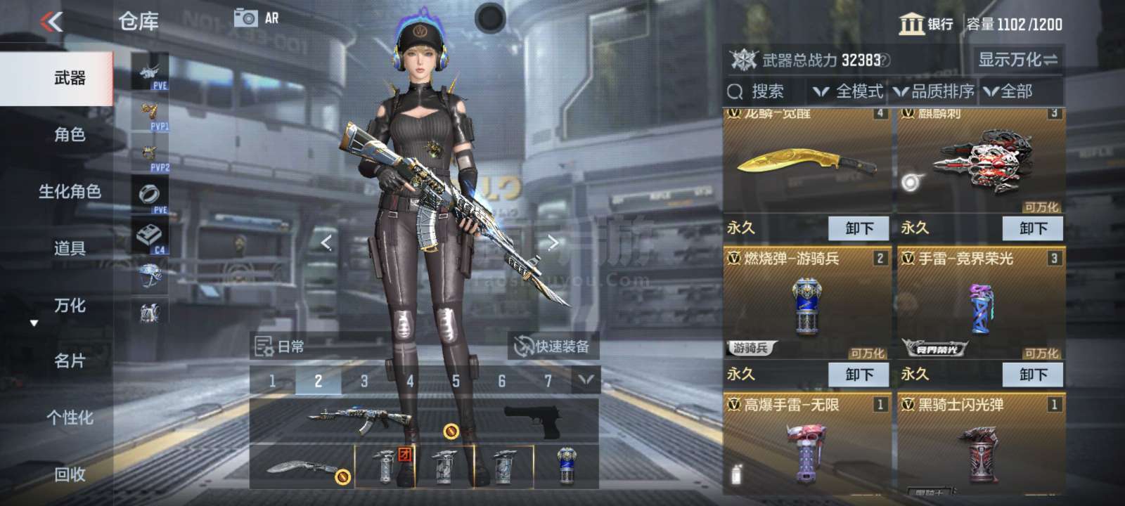 主要有:m4游骑兵带寒霜皮肤,Ak游骑兵,王者之狱,王者之心,麒麟刺,毁灭,屠龙,无影,雷神等武器