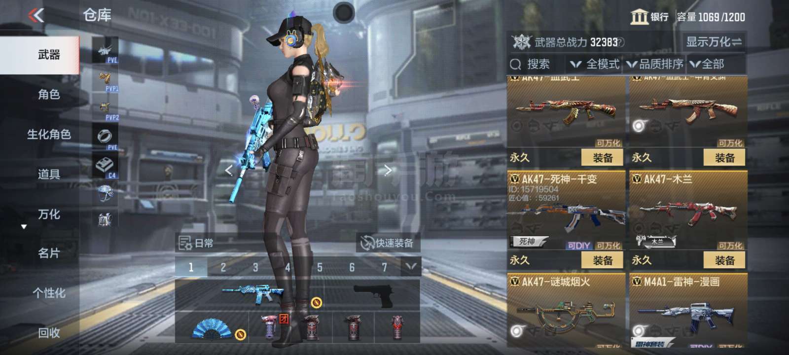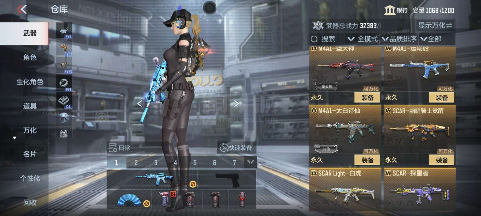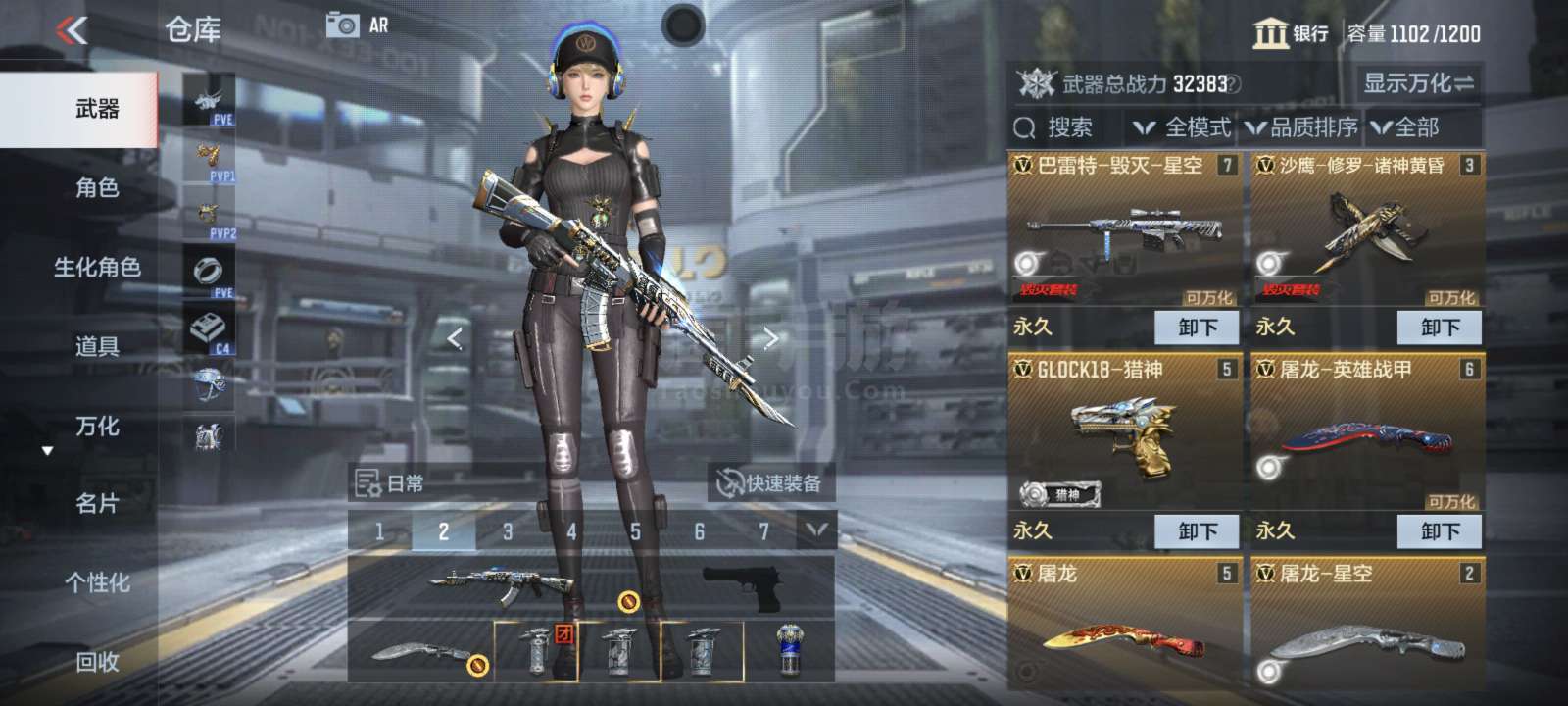 主要有:m4游骑兵带寒霜皮肤,Ak游骑兵,王者之狱,王者之心,麒麟刺,毁灭,屠龙,无影,雷神等武器