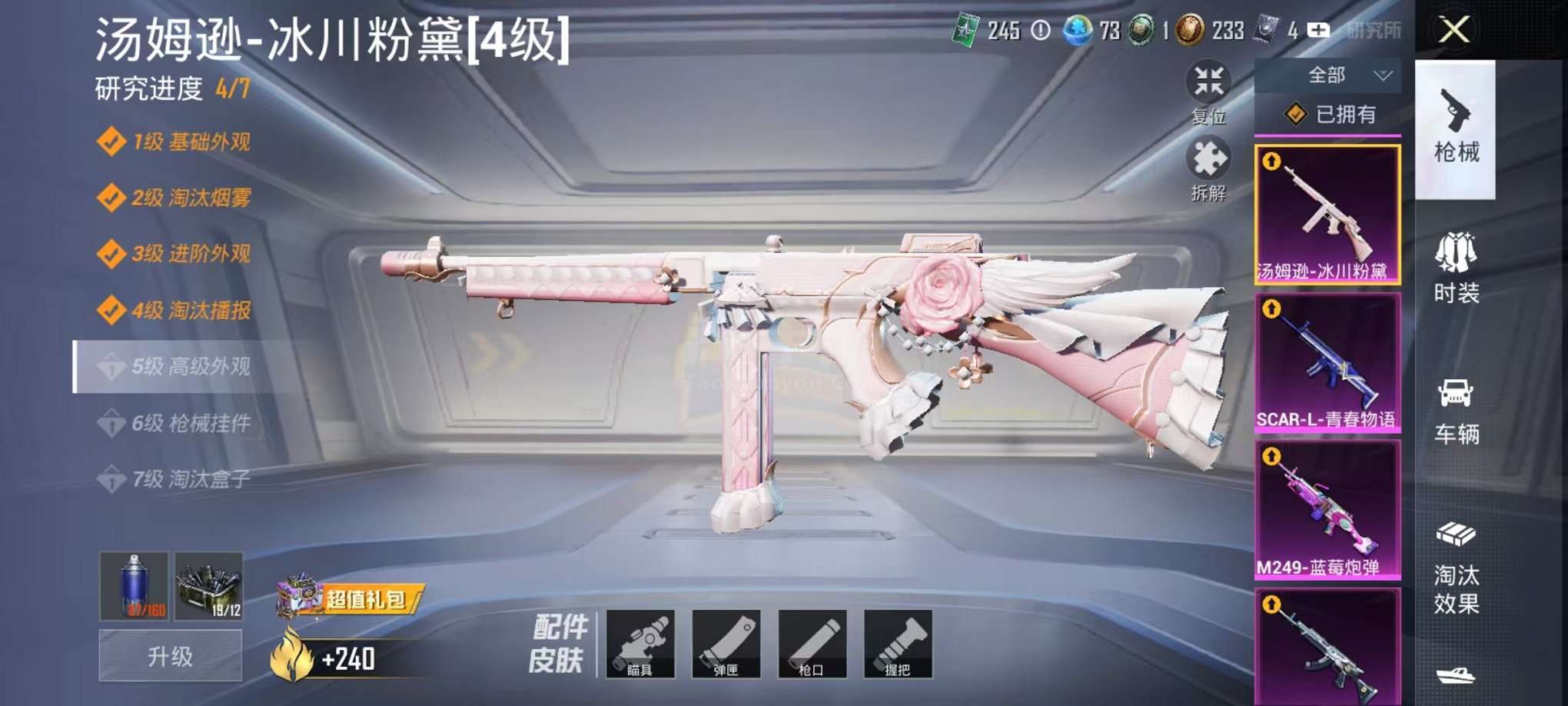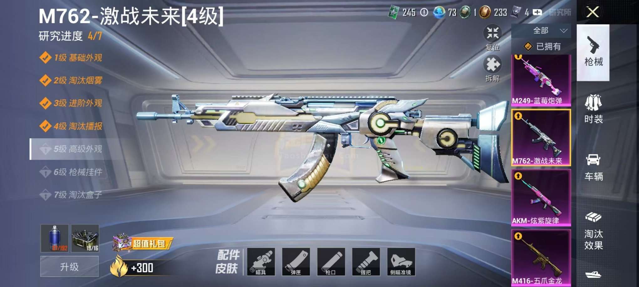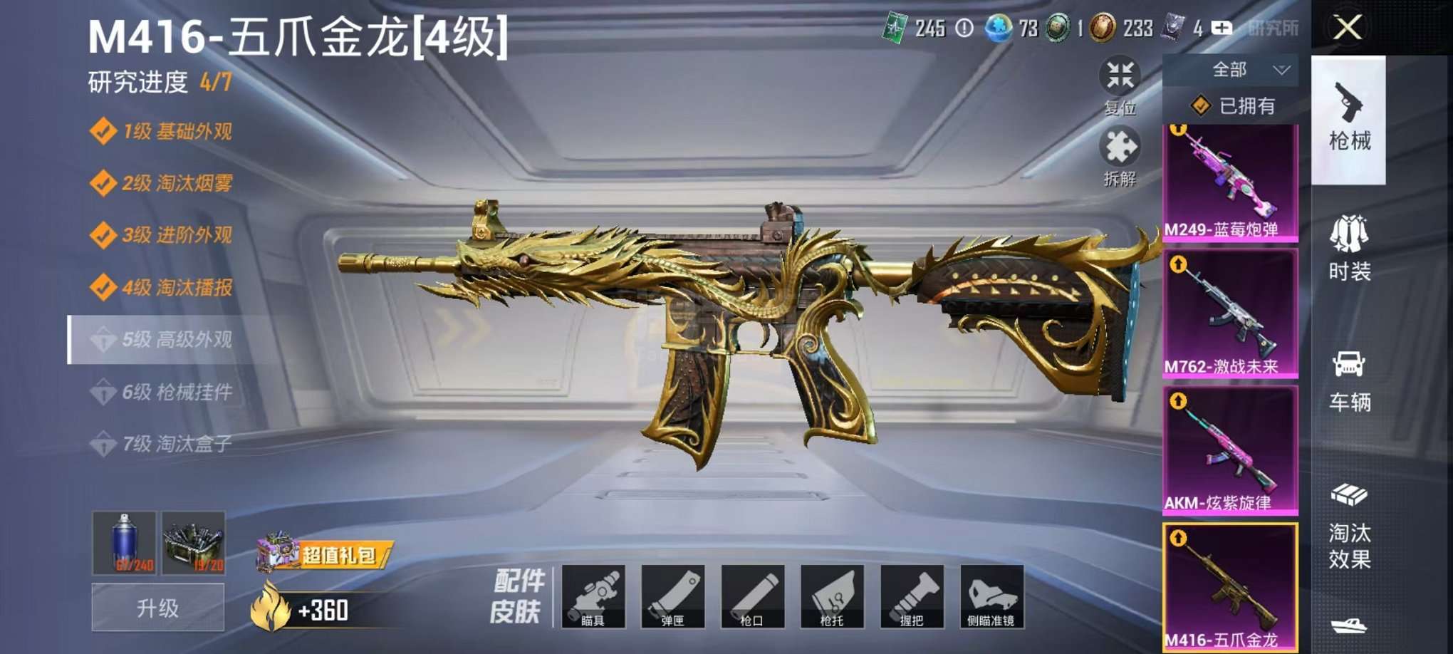可二次【梦幻火箭五爪金龙9粉装9特效枪1载具可秒换绑】、安卓Q区-43839热力值-7印记-69套装-113枪皮、【1载具】、迈凯伦570S(天际蓝)【9粉装】、梦幻火箭、冰川粉黛、冰川红玫、蓝莓炮弹、紫电风暴、纯珍童话、暗夜鎏金、飒粉甜心、冰川幽秘【9特效枪】、SCAR-L-青春物语(5级)、M416-五爪金龙(4级)、AKM-炫紫旋律(4级)、汤姆逊-冰川粉黛(4级)、MK20-H-海螺星光(4级)、M762-激战未来(4级)、P90-能量风暴(4级)、Vector-飒粉甜心(4级)、M24