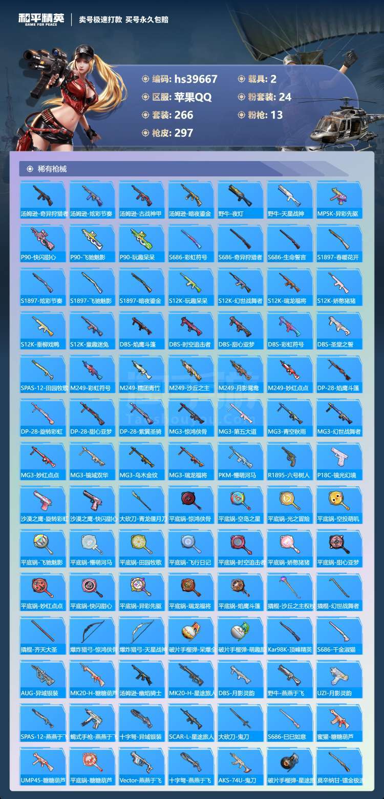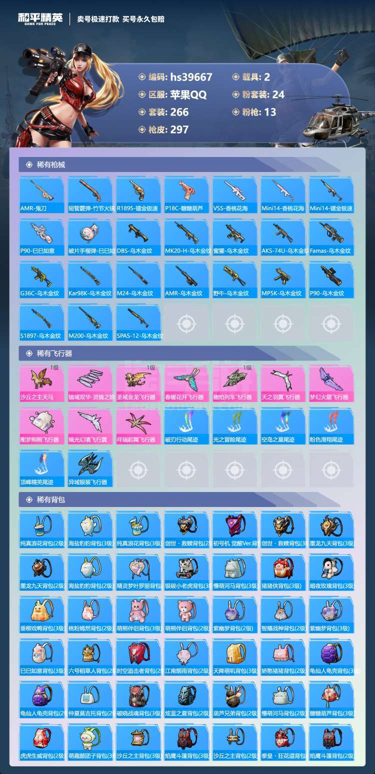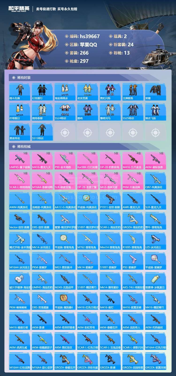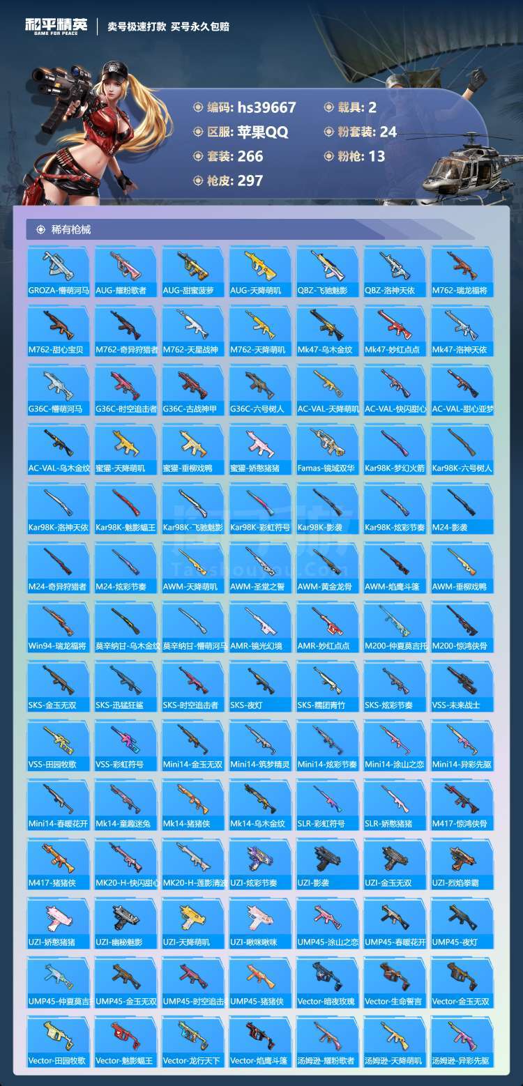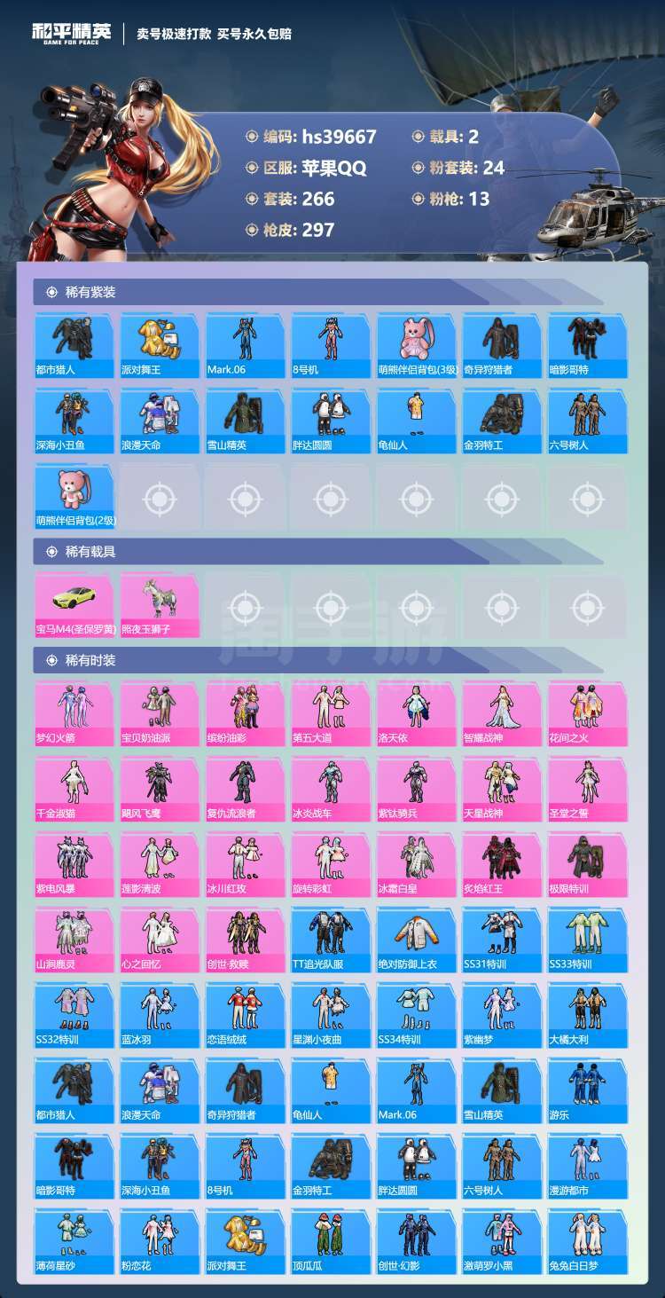 hs39667 苹果手Q-19王牌印记-24粉装-13特效枪-2载具-107754热力值-266套装