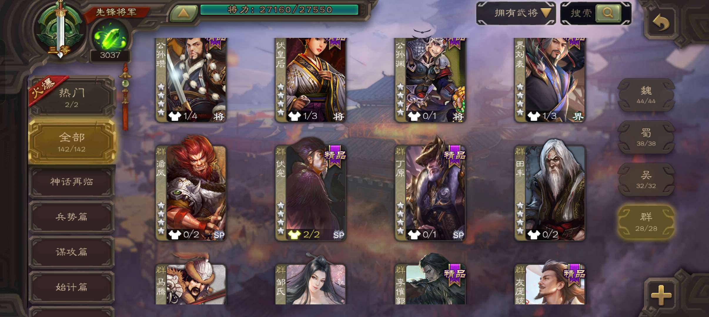 3000魂(白马动皮)6万豆,回廊动神吕布界钟会沙摩柯谯周4史诗先锋,谋韩当甘夫人羊钴界满宠142将