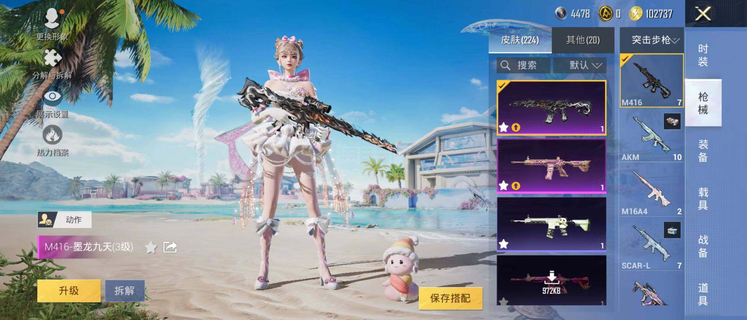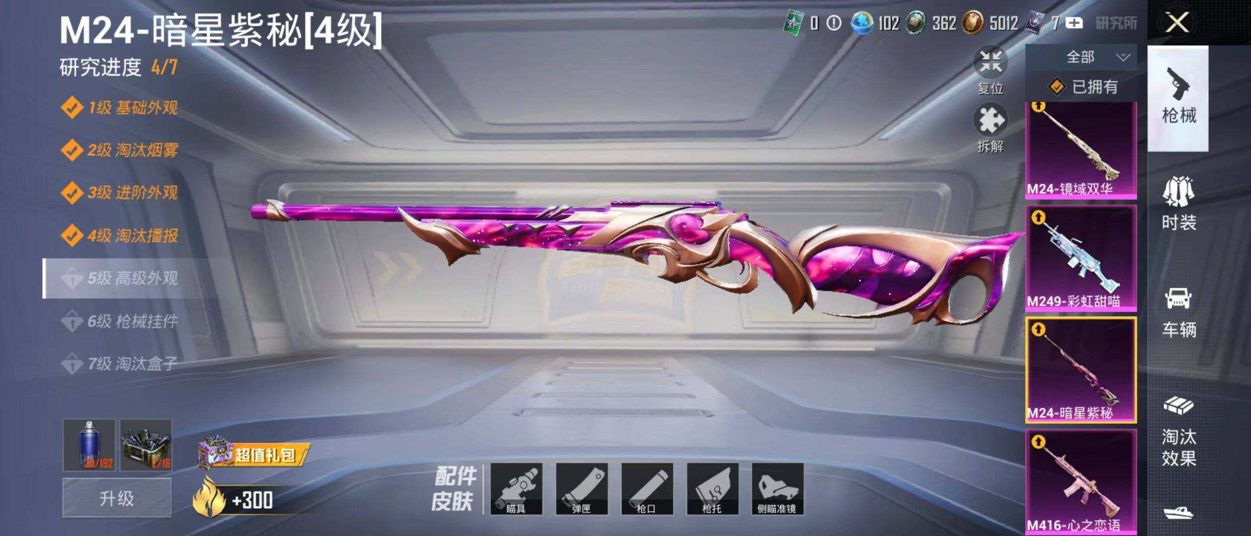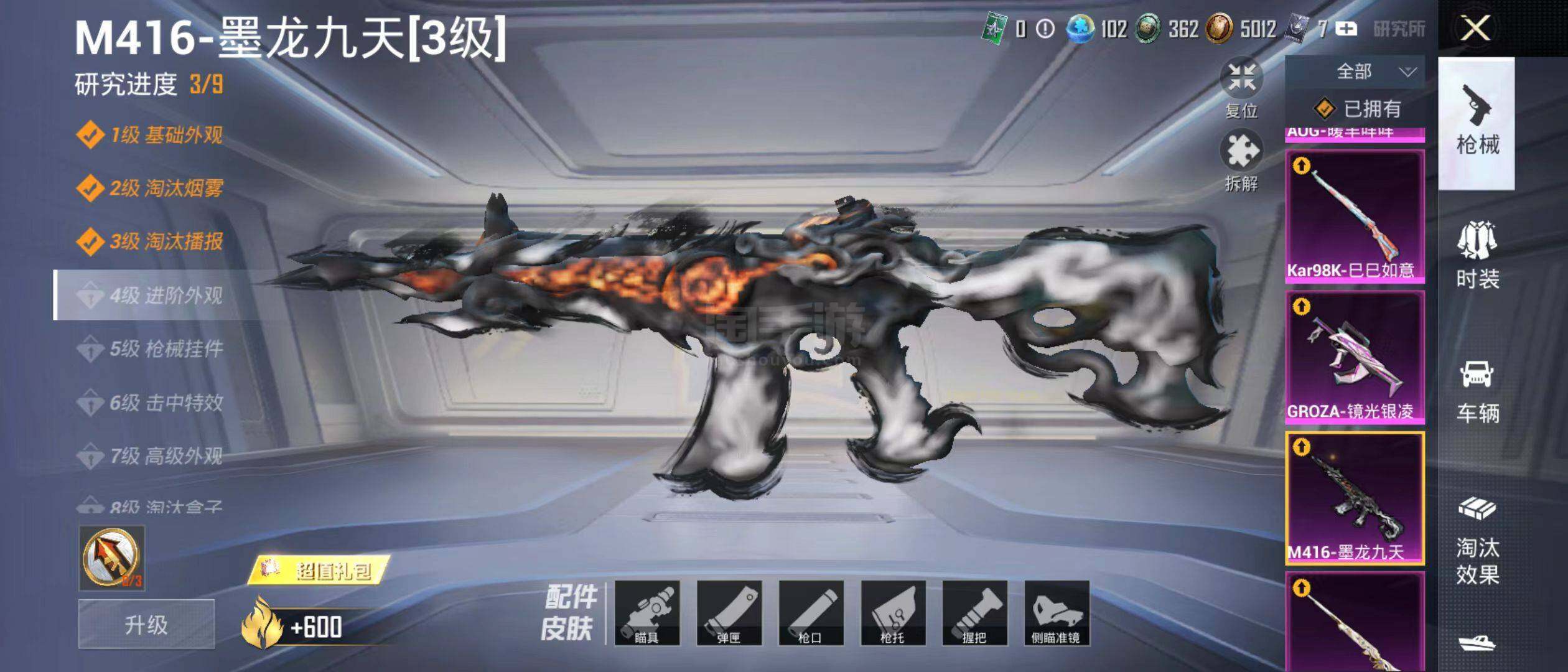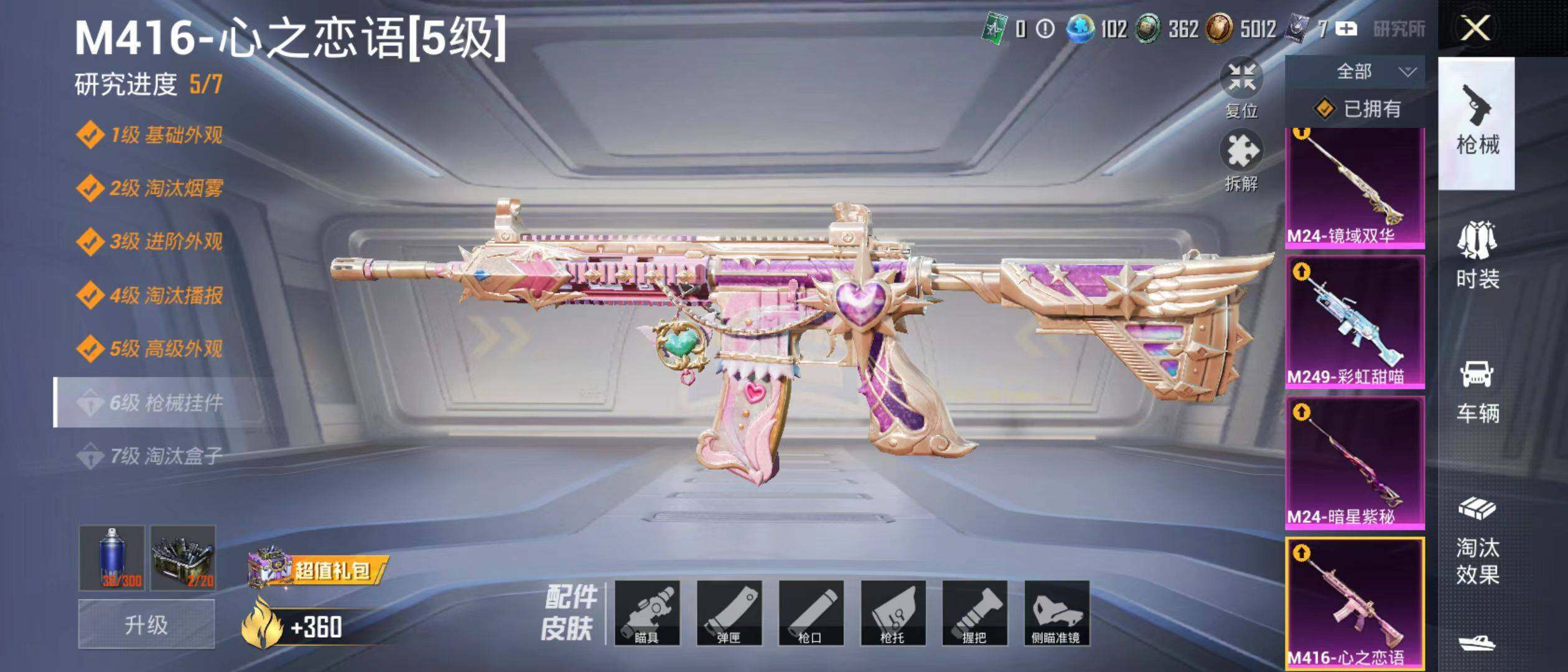 【粉色枪皮等级】:M416-心之恋语(五级),M416-墨龙九天(三级),GROZ