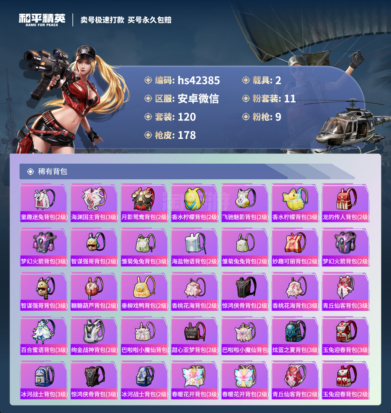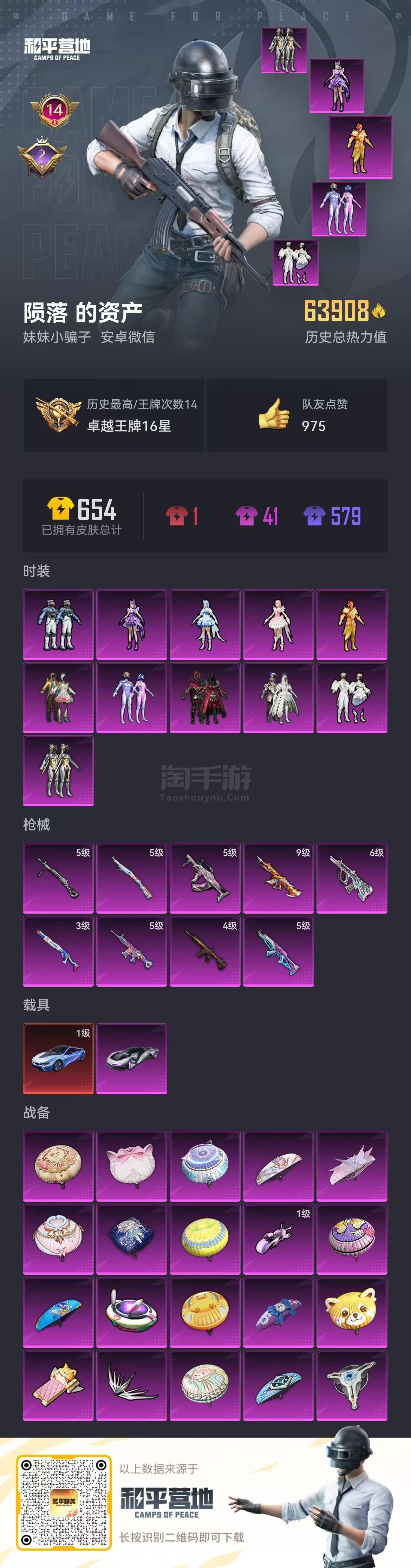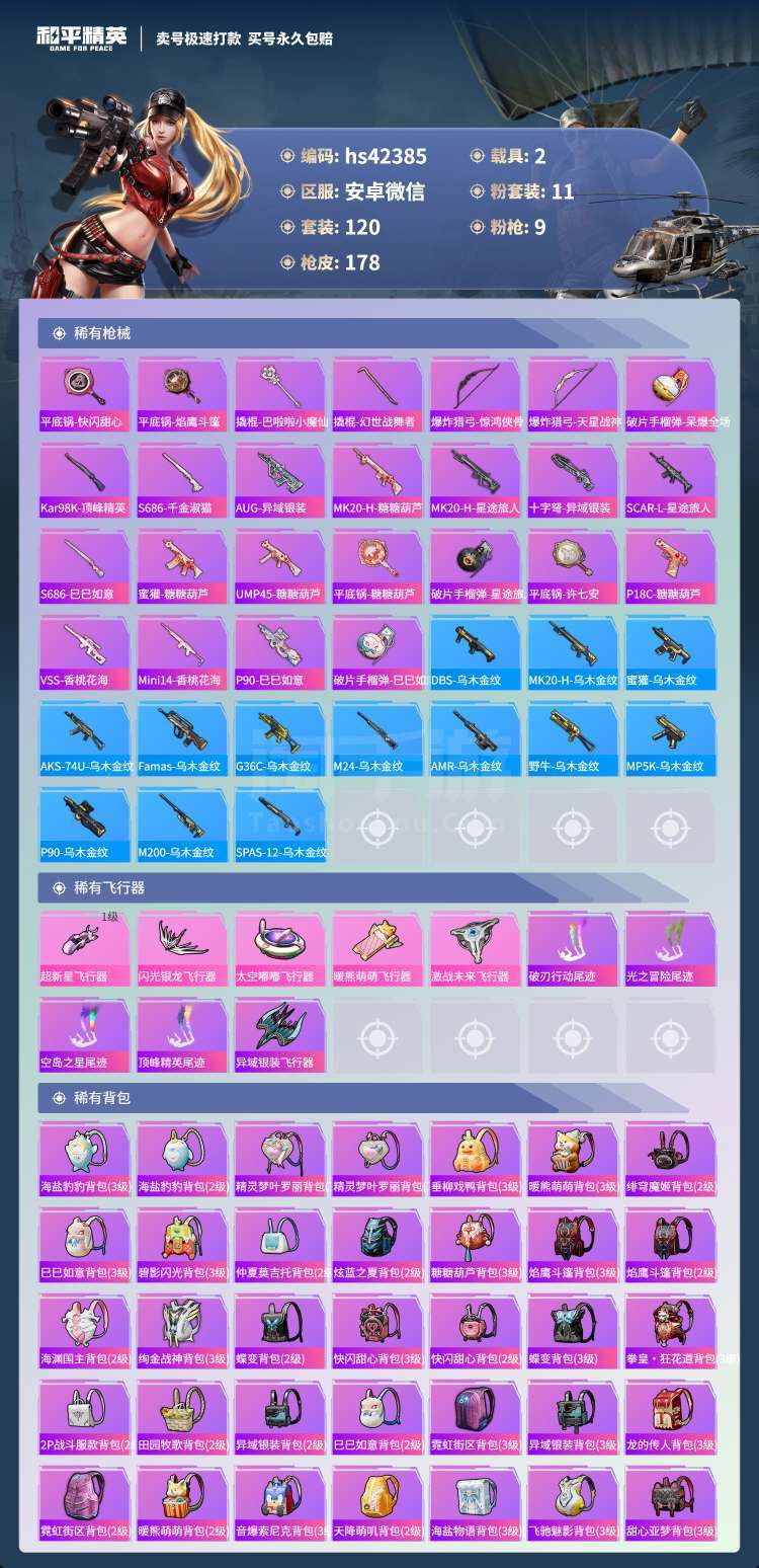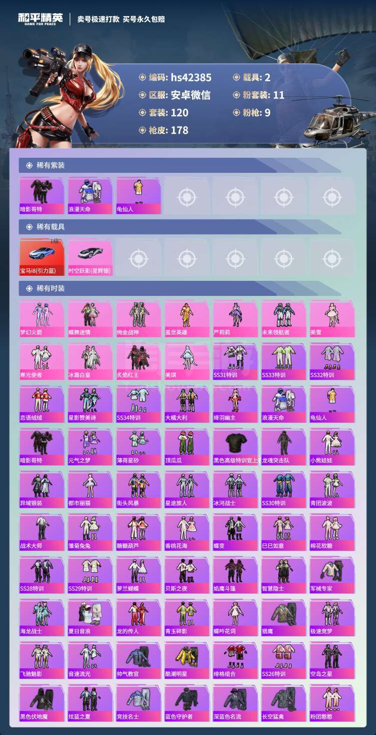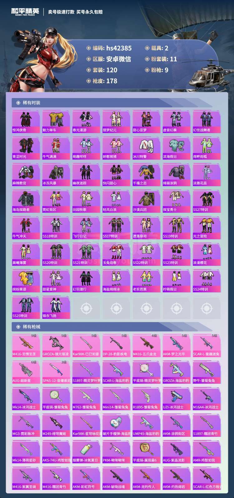 hs42385 安卓微-14王牌印记-11粉装-9特效枪-2载具-63908热力值-120套装-1