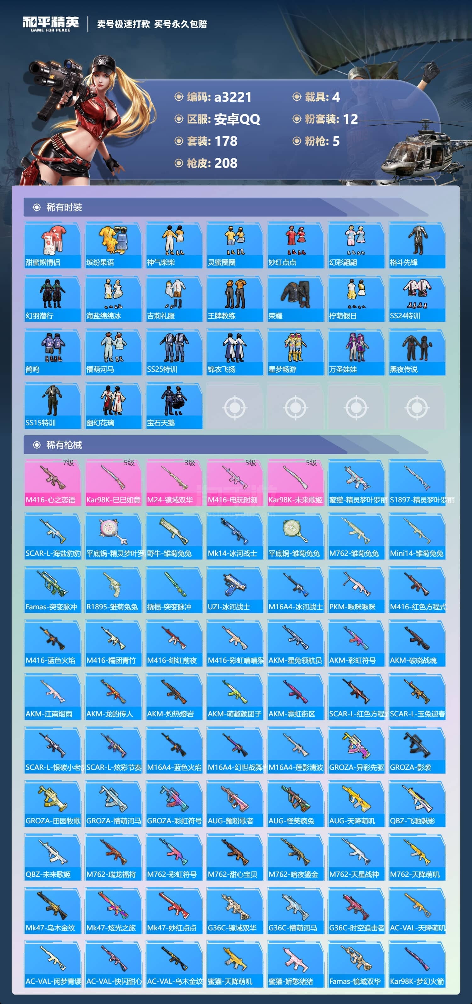 a3221/安卓QQ/精品女装号/附带王者/-11王牌印记-12粉装-5特效枪-4载具-76756热
