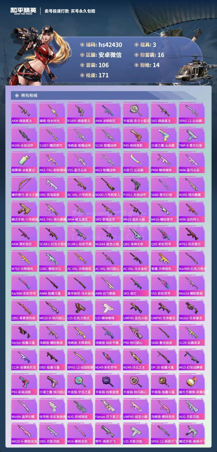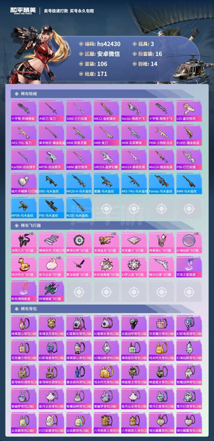 和平精英【安卓微信】hs42430 安卓微-9王牌印记-16粉装-14特效枪-3载具-67606热力值-106套装-1