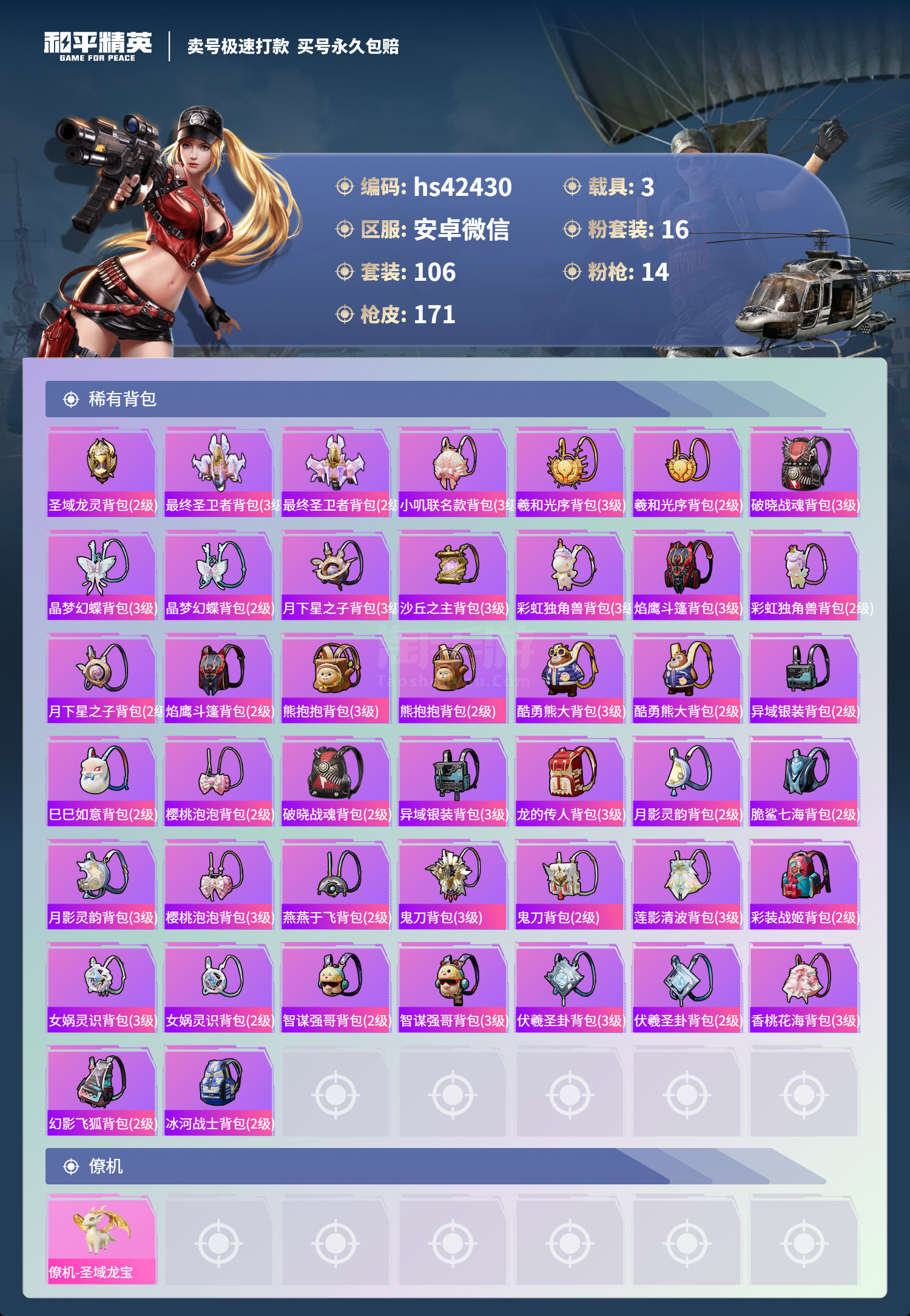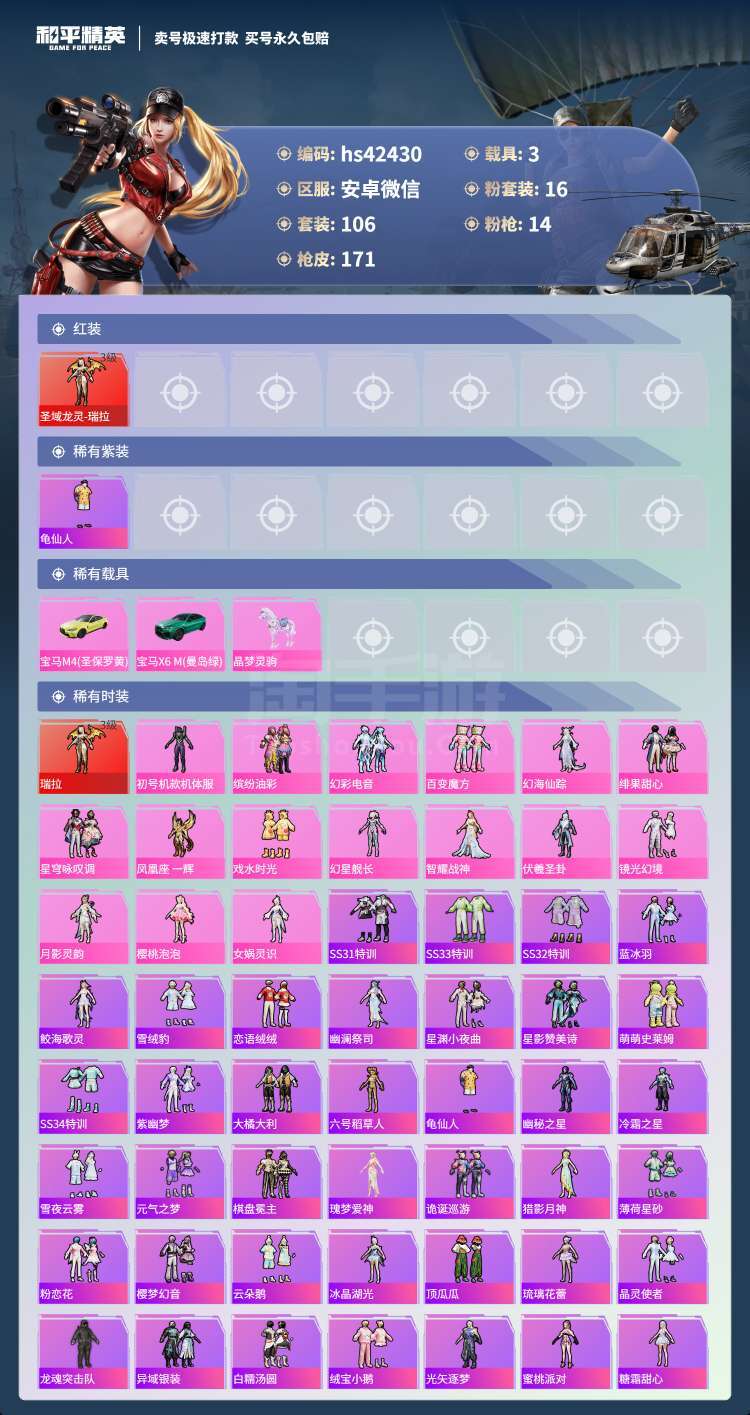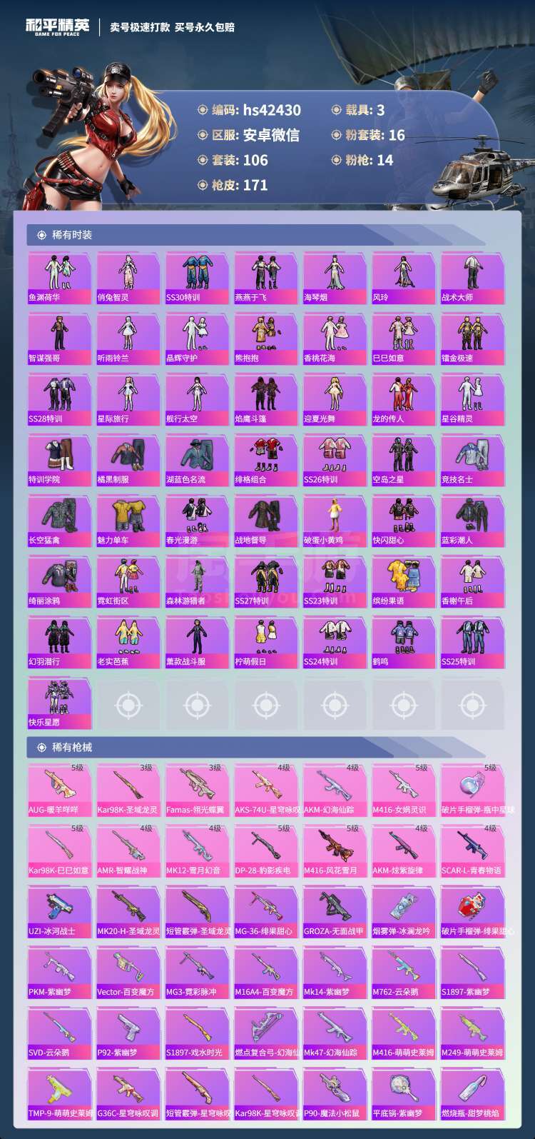 hs42430 安卓微-9王牌印记-16粉装-14特效枪-3载具-67606热力值-106套装-1