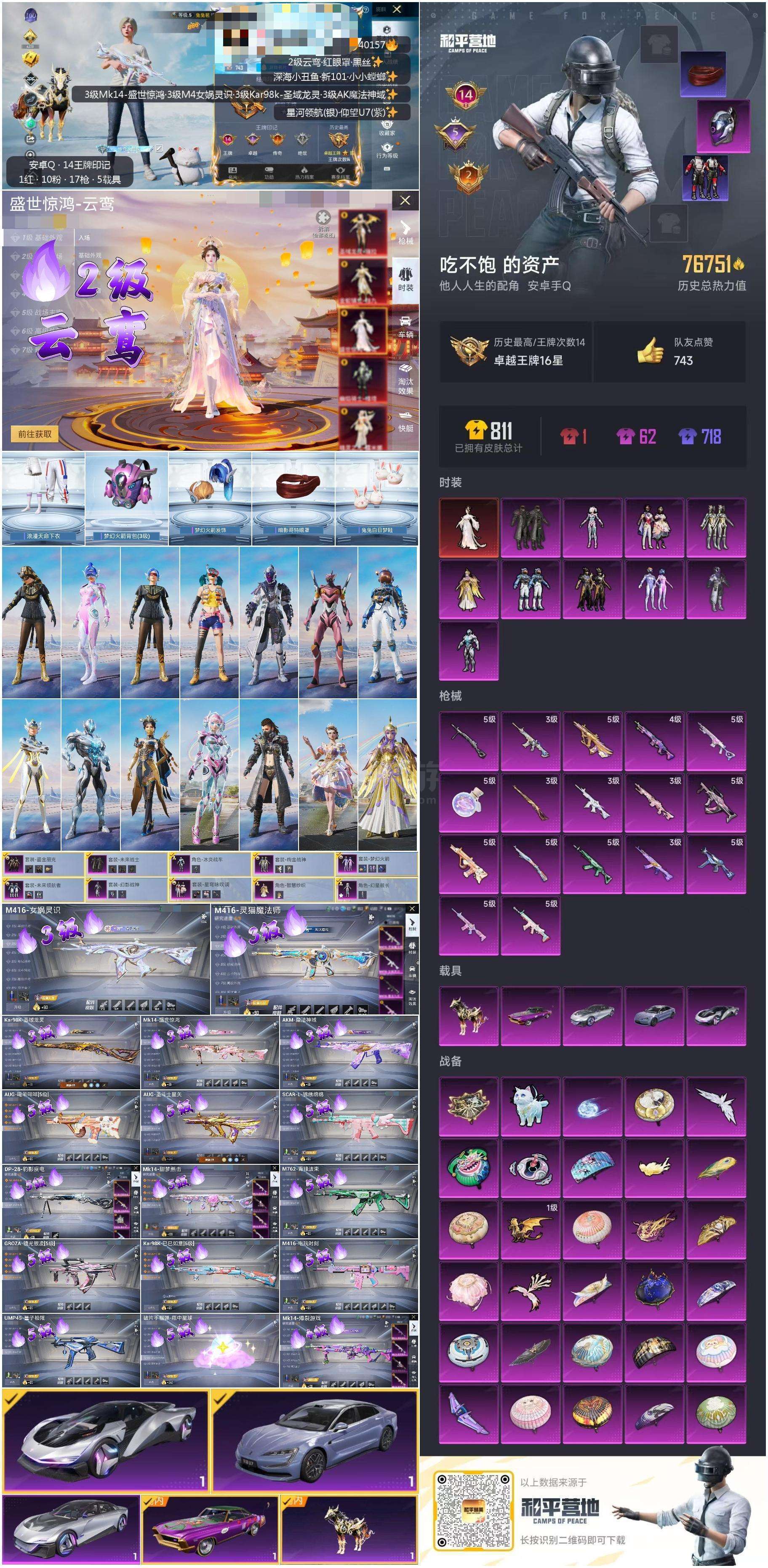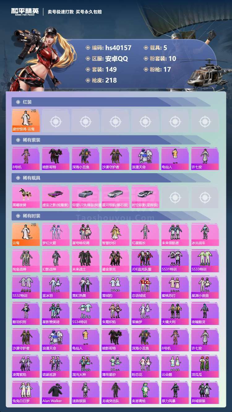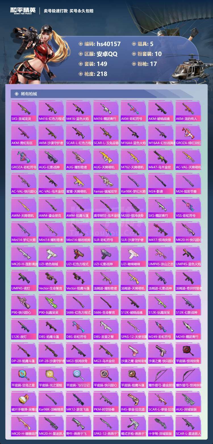 hs40157 安卓手Q-14王牌印记-10粉装-17特效枪-5载具-76751热力值-149套装-
