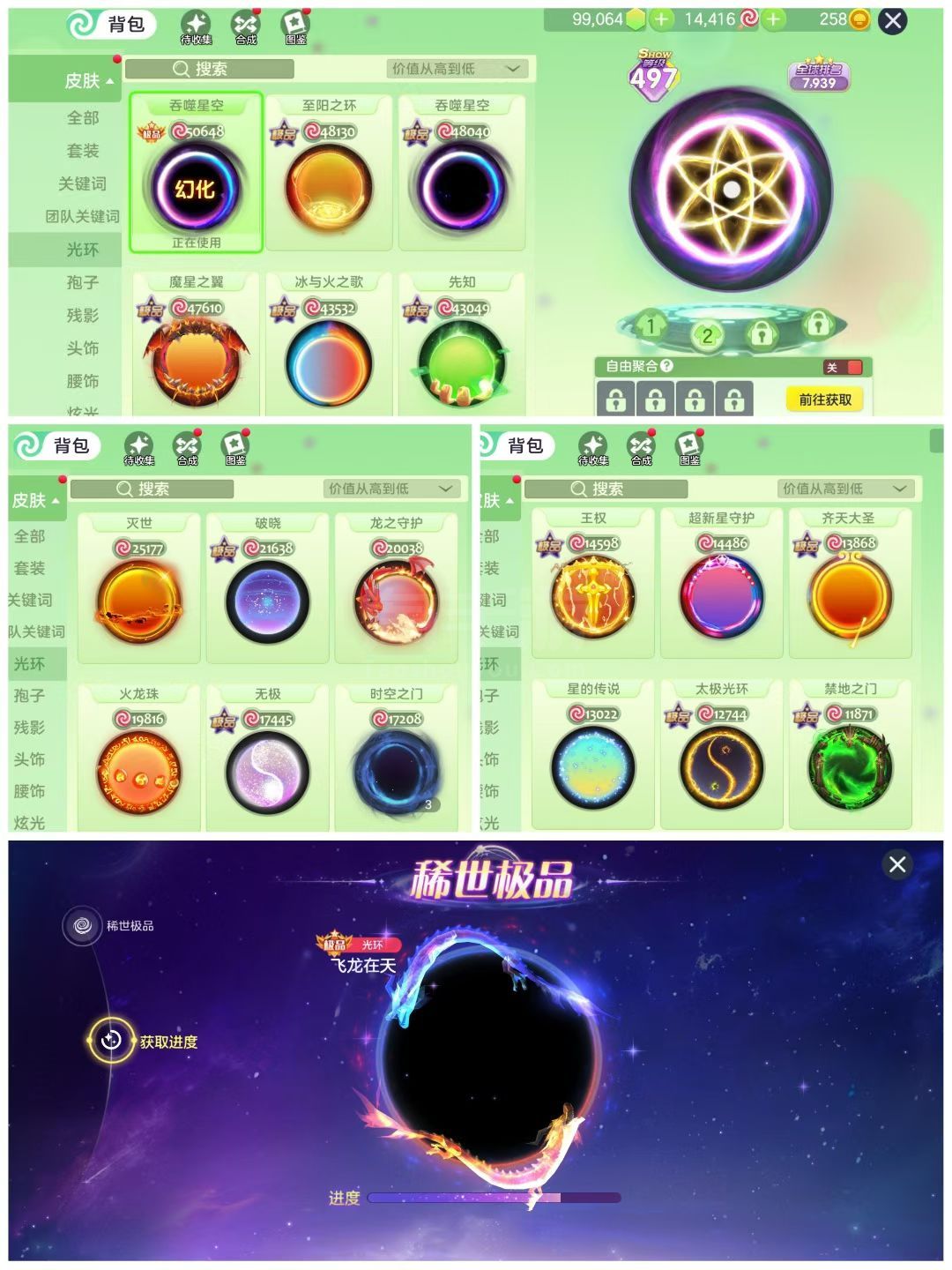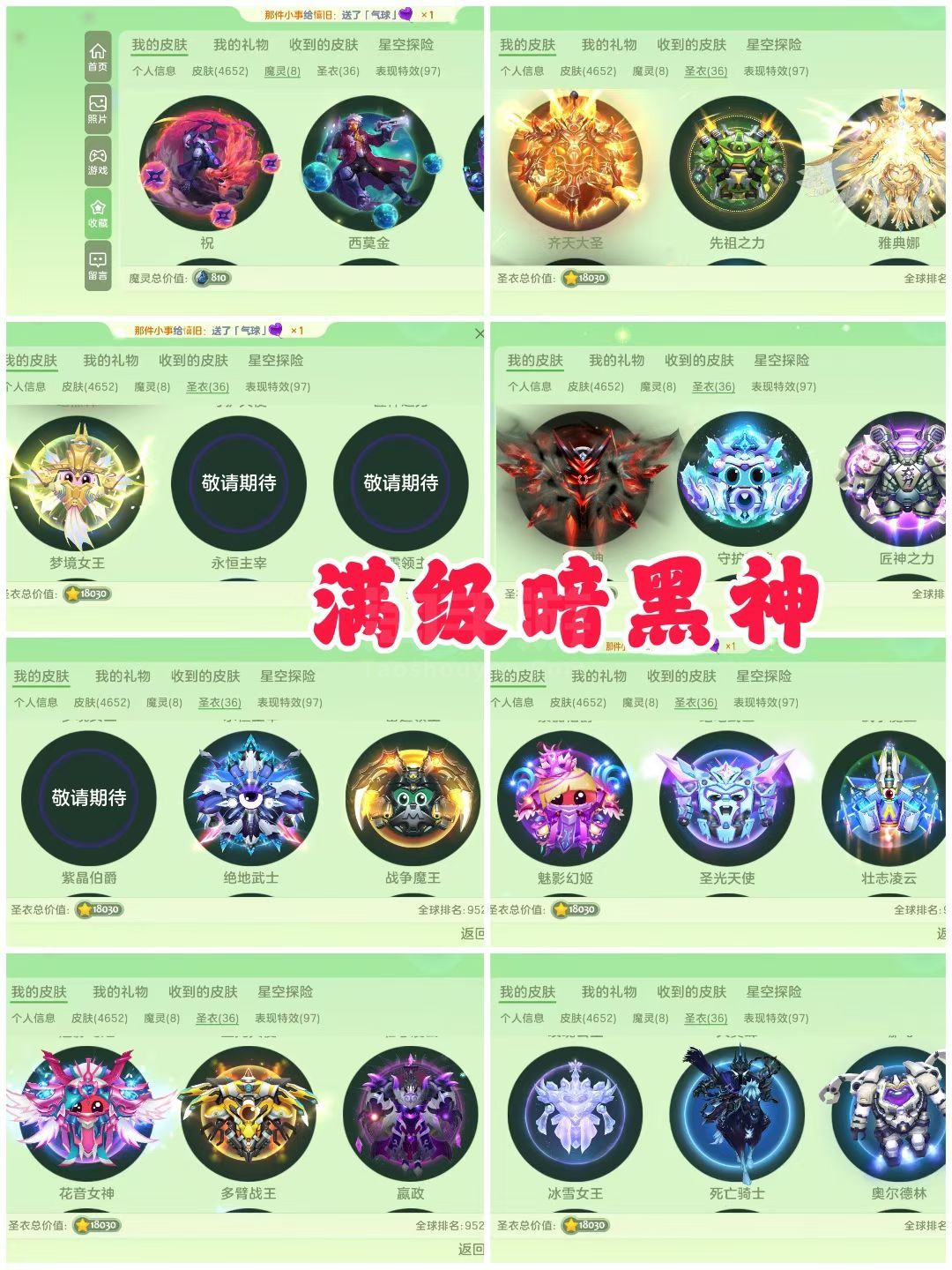 500秀 尊4 370万皮肤 77吞 双黑洞时空之门 泳圈 千机伞 阿芙娜 大白满级魔星