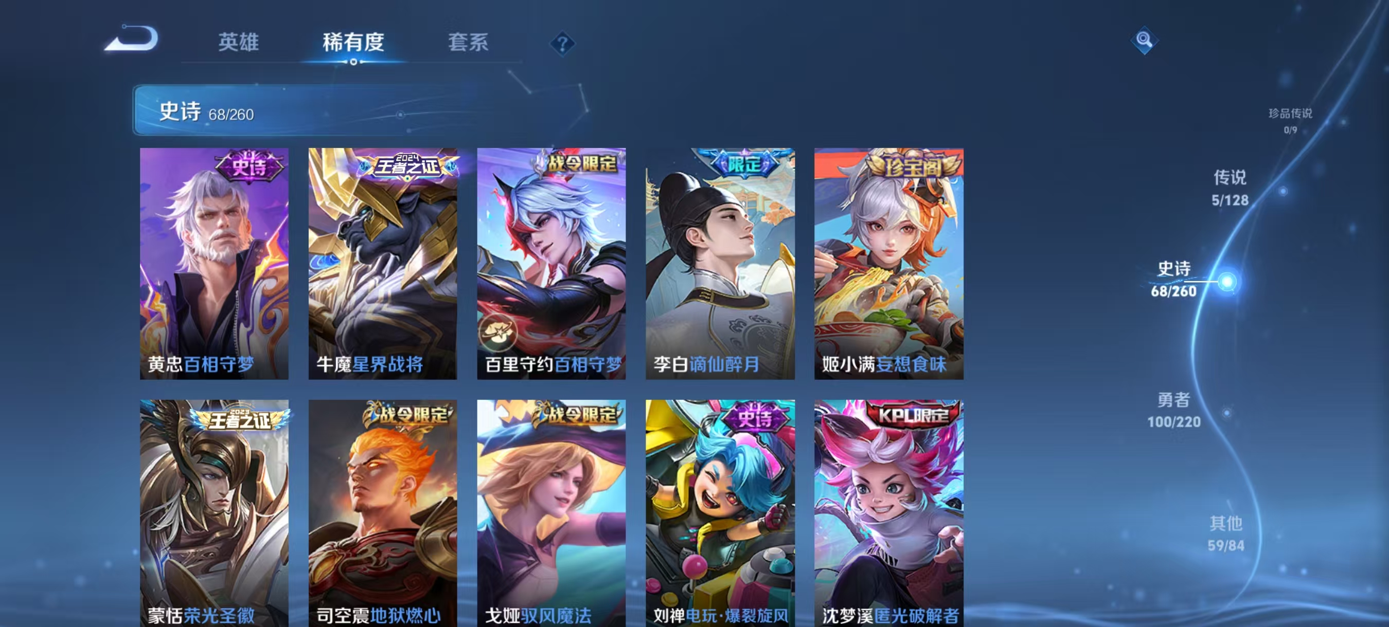 -不可二次-V7-124英雄-233皮肤-1典藏-5传说-67史诗 九霄神辉-花木兰 鸣野蒿-桑启
