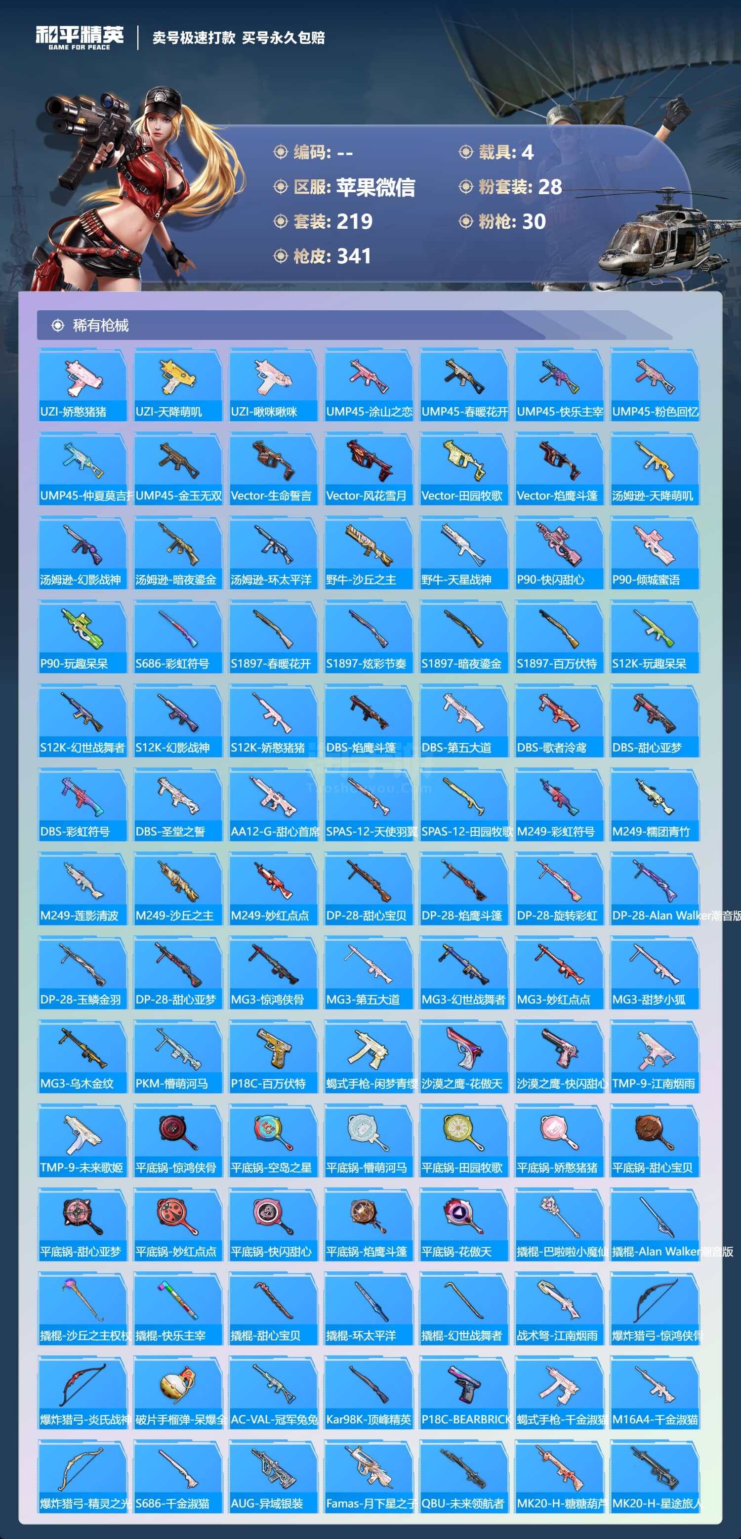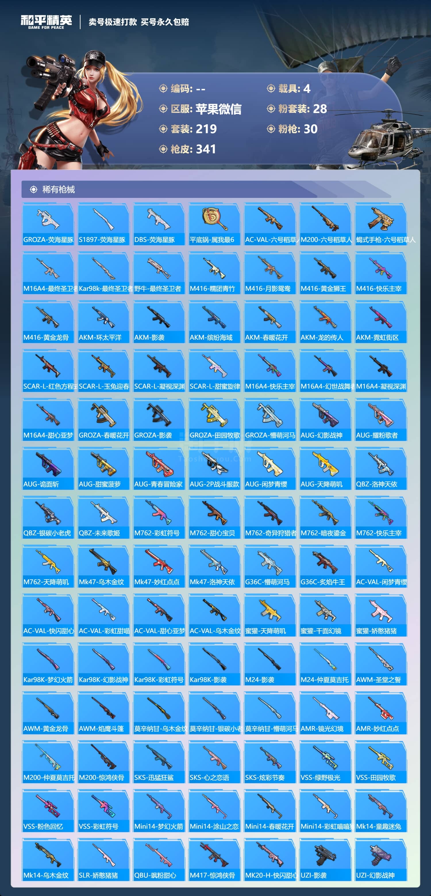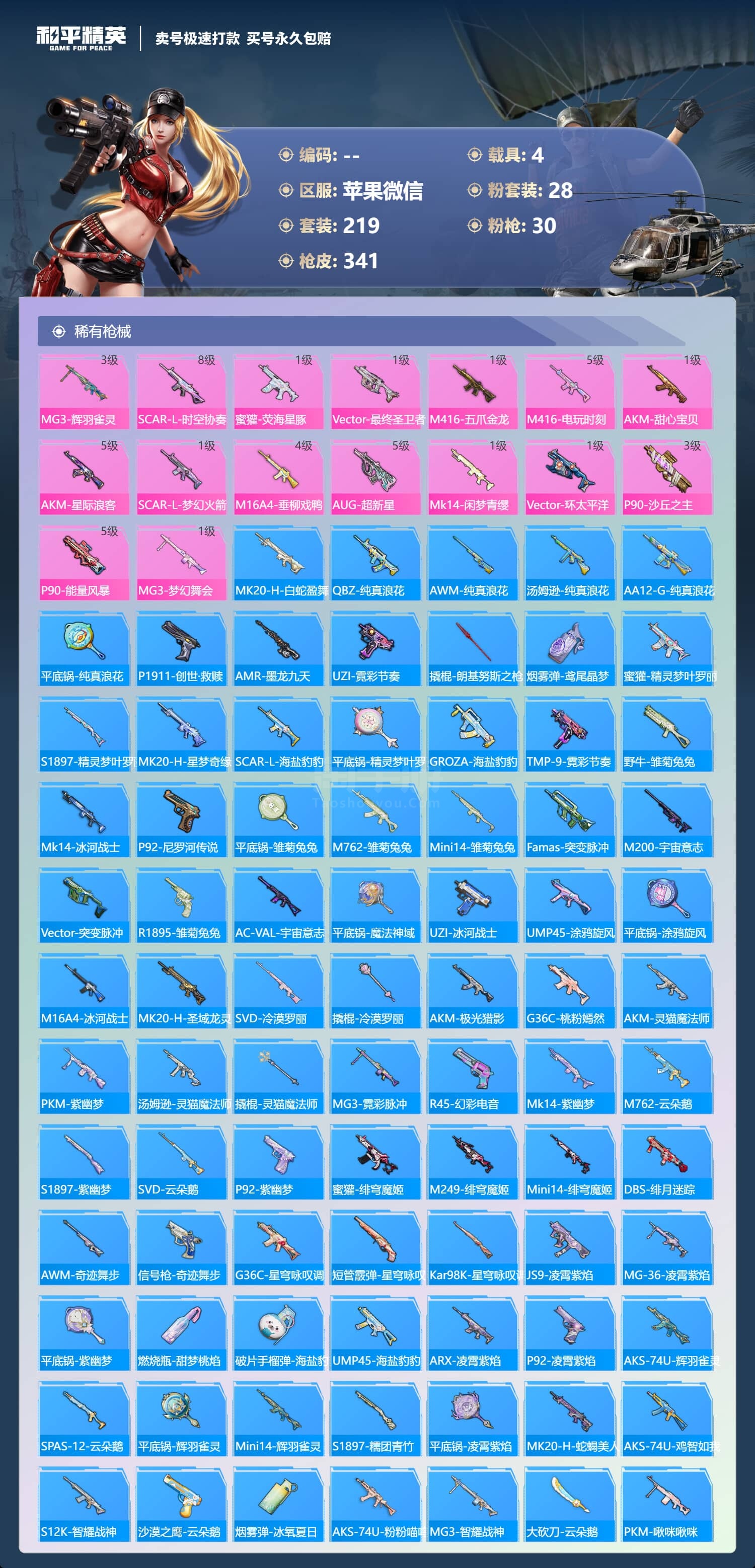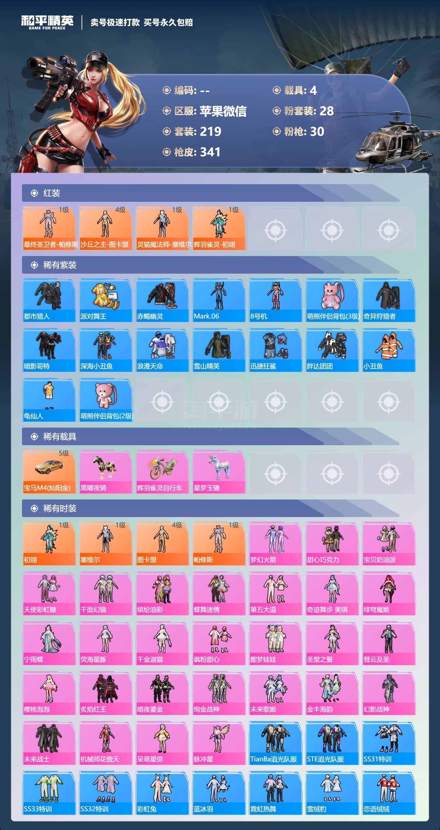 和平精英【苹果微信】a3773/苹果微/五级M4宝马(灿阳金)/四级图卡盟/九级灵魔法师/身法套装号/-14王牌印记-