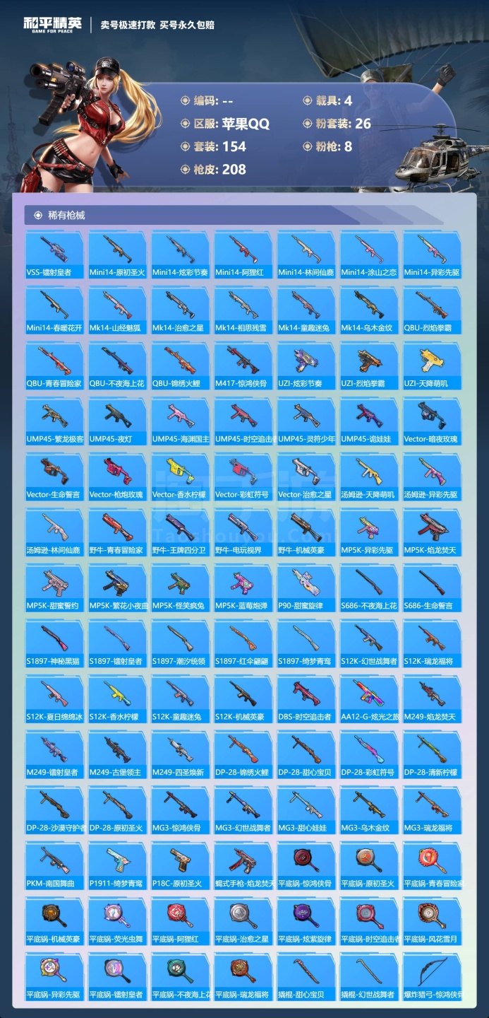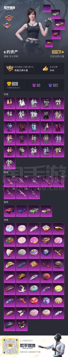 a3724/苹果QQ/-18王牌印记-26粉装-8特效枪-4载具-89671热力值-154套装-20