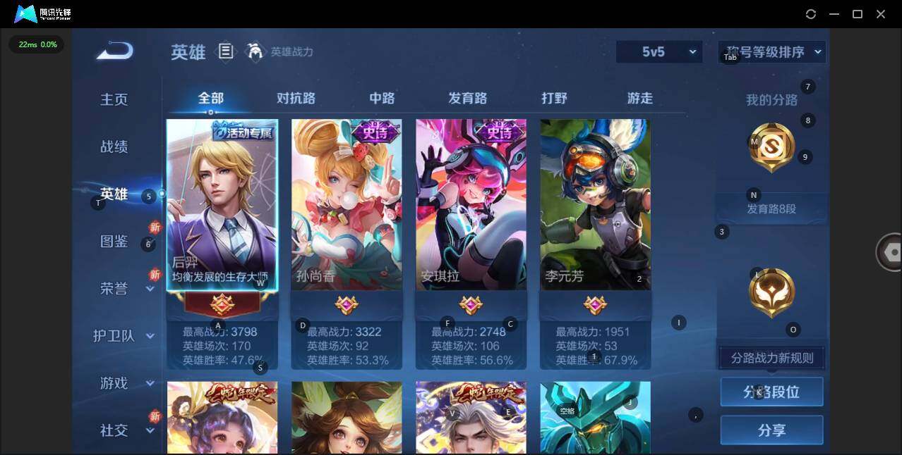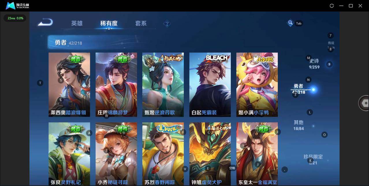 实名: 可修改 贵族等级: V4 英雄数: 102 皮肤数: 72 限定皮:
