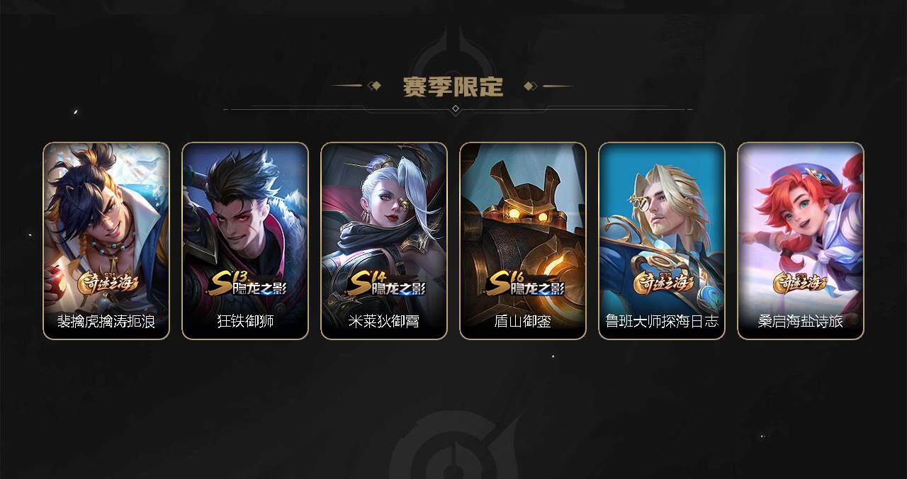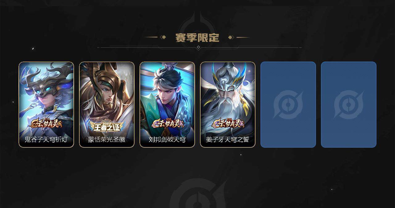 【限定皮肤】:白起狰,姜子牙天穹之誓,杨戬破阵退雄兵,狄仁杰阴阳师,虞姬凯尔特女王,赵云皇家上将,嬴政优雅恋人,嬴政白昼王子,鲁班七号狮舞东方,高渐离死亡摇滚,钟无艳王者之锤,扁鹊炼金王,芈月重明,吕布猎兽之王,吕布御风骁将,周瑜赤莲之焰,元歌