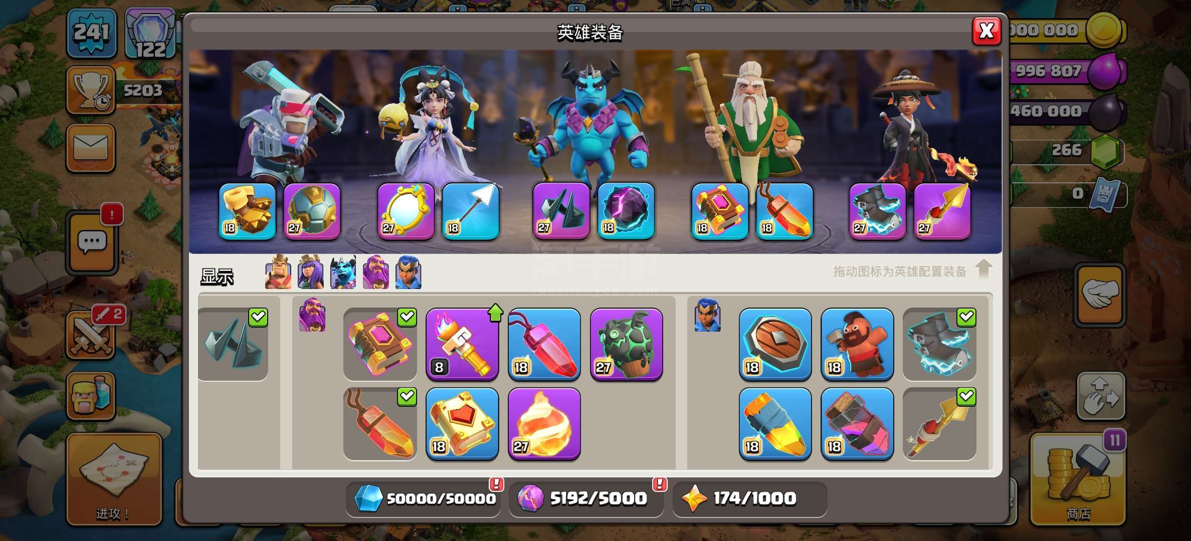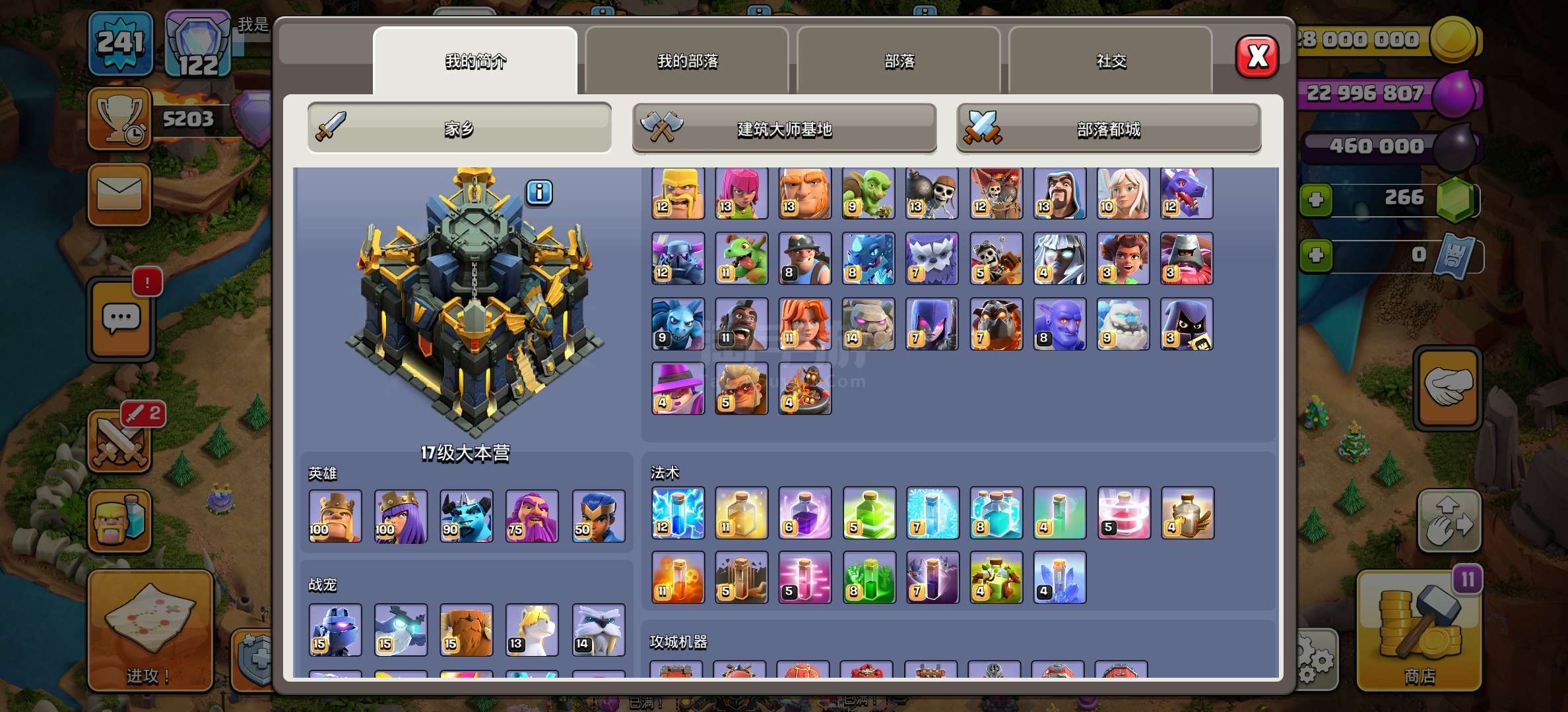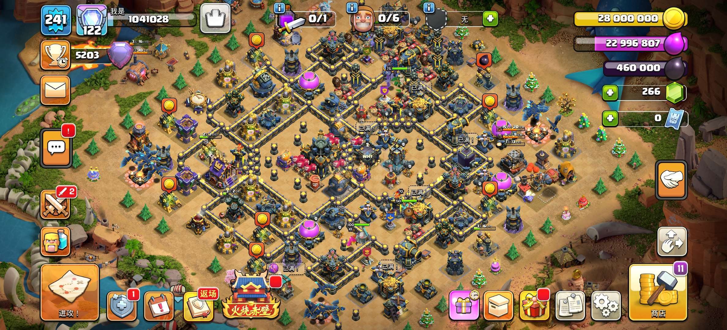 繁荣度122,8个满级史诗技能,仅蛇环冰箭火炬巨人是8级 其余全部满级。建筑物只差充能和精致台。