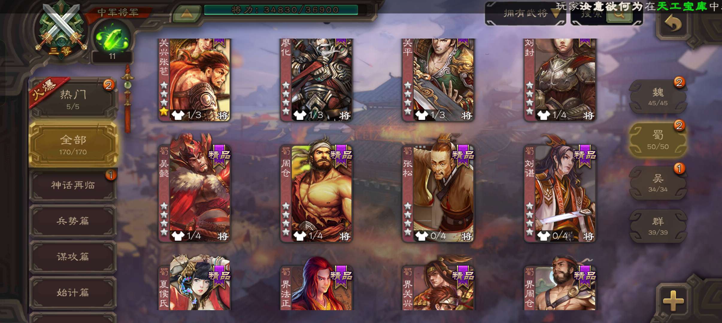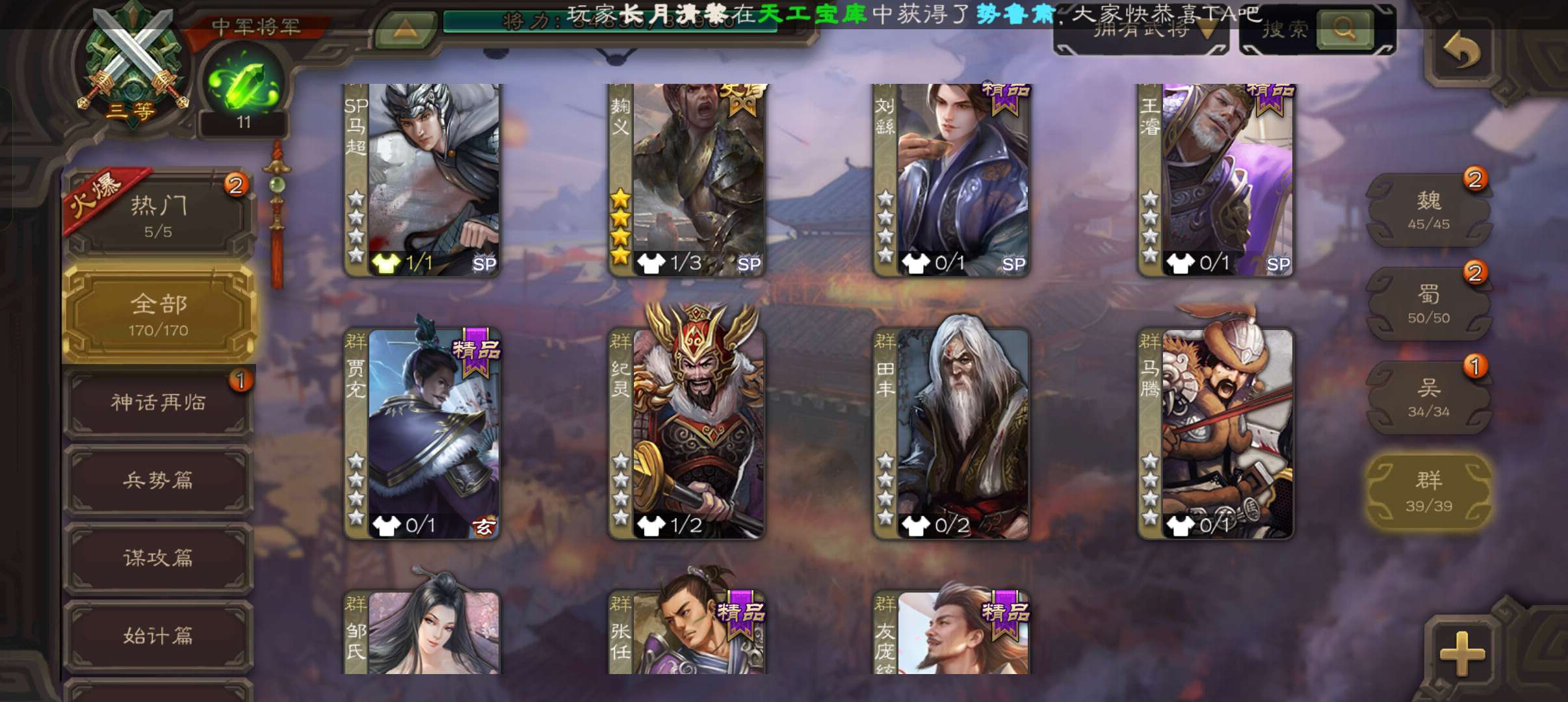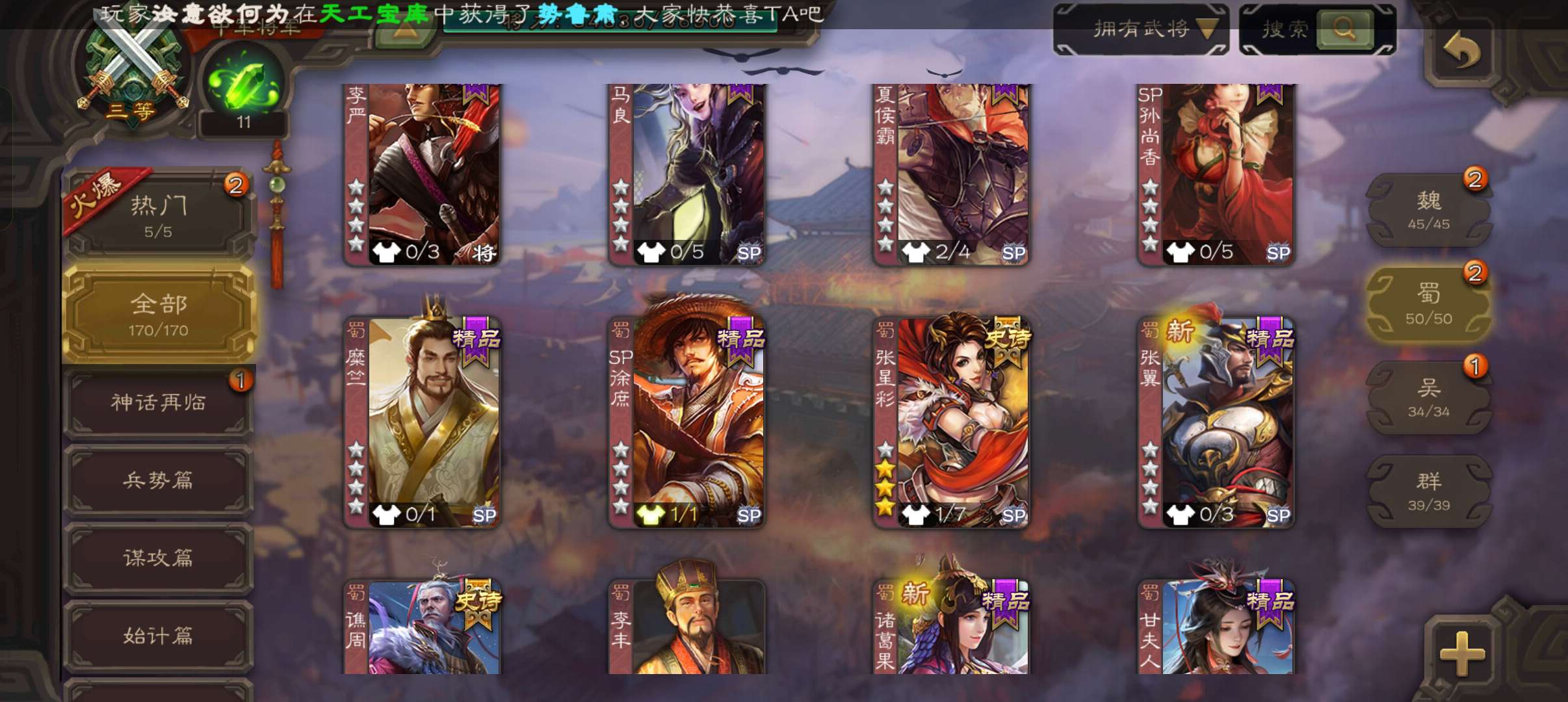 7史诗双神中军,玉龙回廊动白马回廊神吕布界朱然张星彩谯周王平程昱,神周瑜动界周瑜界满宠甘夫人170将
