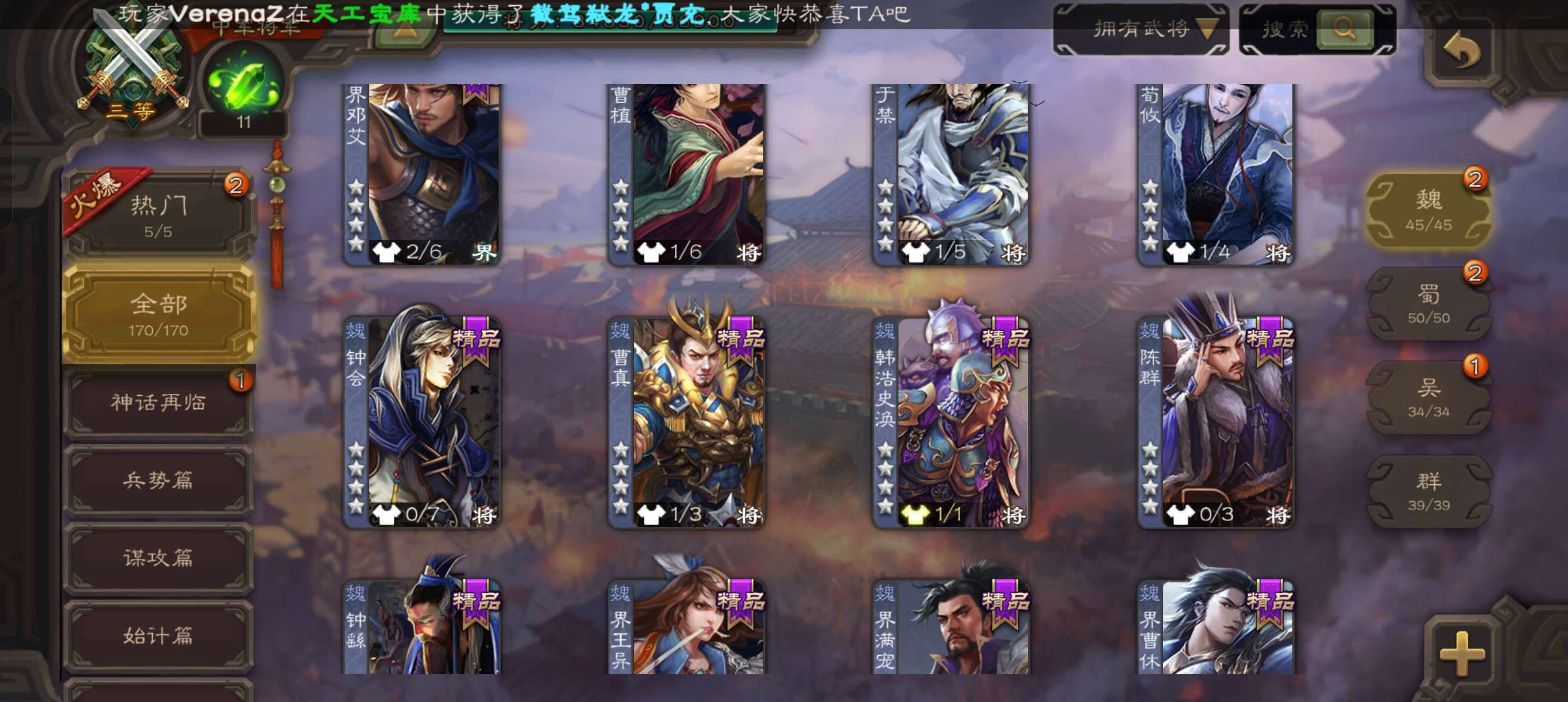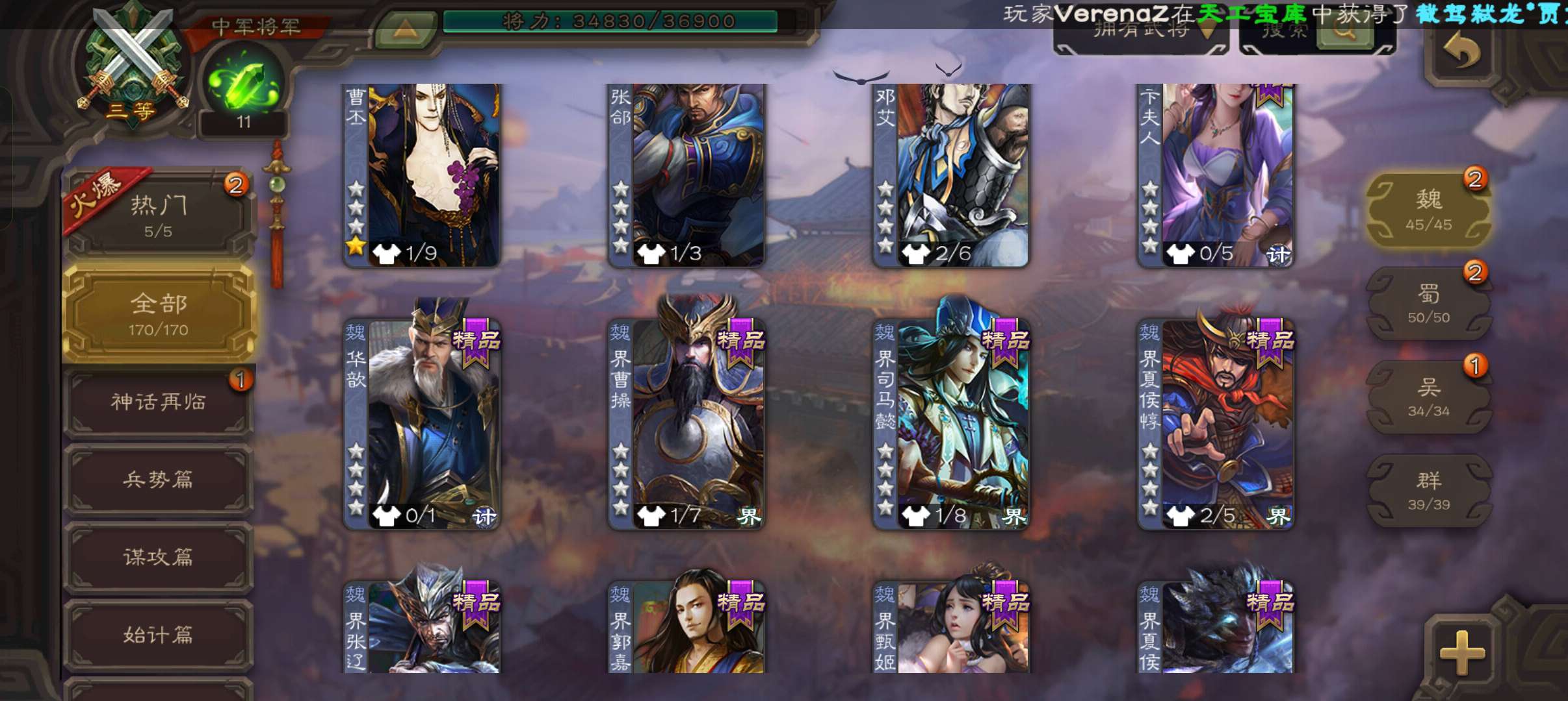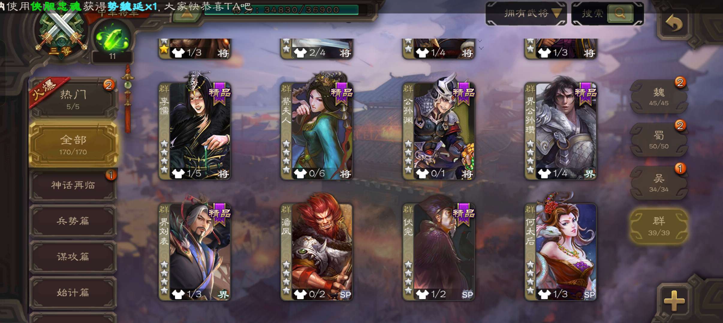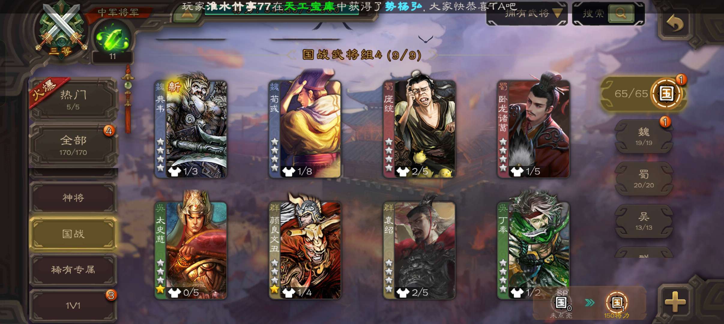 7史诗双神中军,玉龙回廊动白马回廊神吕布界朱然张星彩谯周王平程昱,神周瑜动界周瑜界满宠甘夫人170将