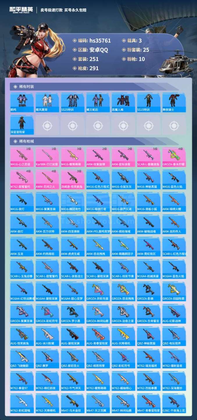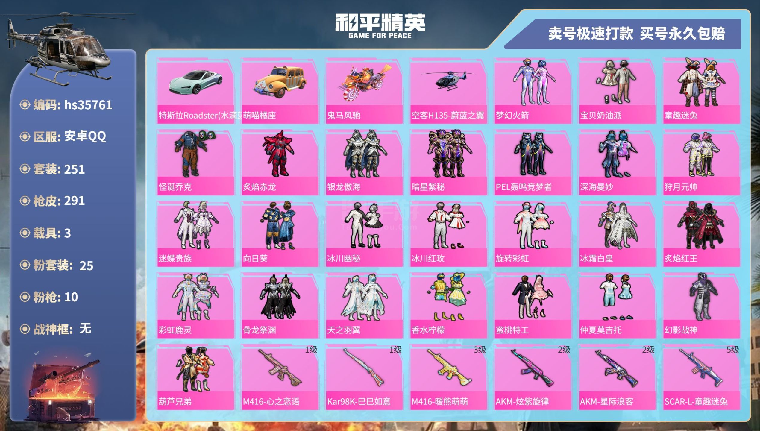 hs35761 安卓手Q-13王牌印记-25粉装-10特效枪-3载具-120288热力值-251套装
