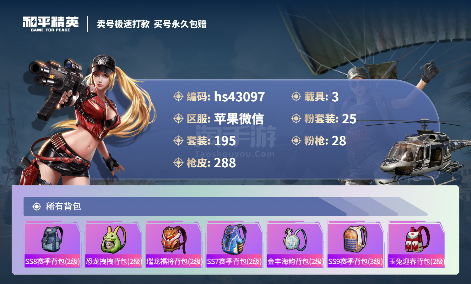 hs43097 苹果微-9王牌印记-25粉装-28特效枪-3载具-122622热力值-195套装-