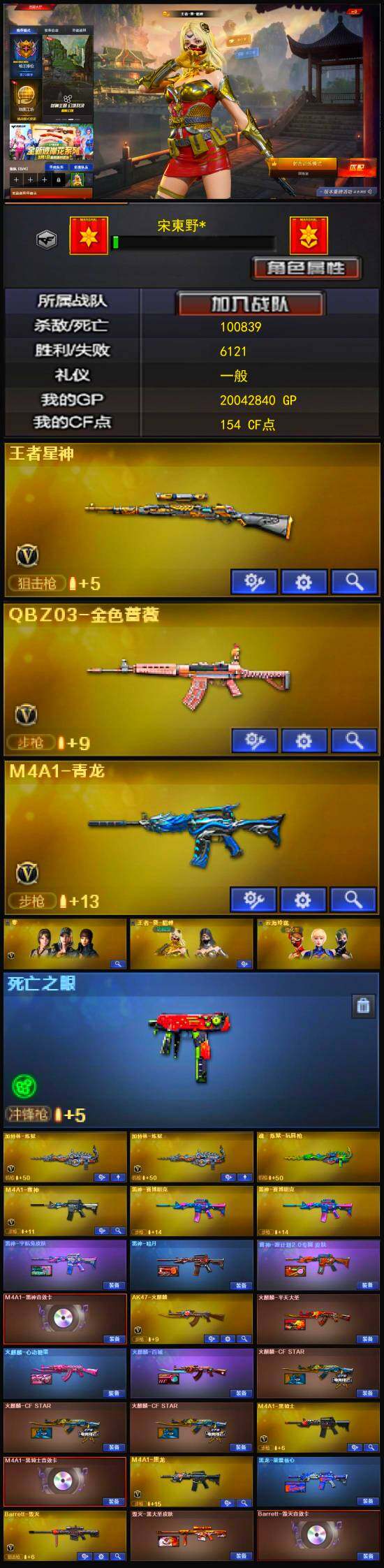 【热门武器】:QBZ03-金色蔷薇,M4A1-青龙,死亡之眼,M4A1-黑骑士,加特林-炼狱*2,降世魔童,沙鹰-修罗*2