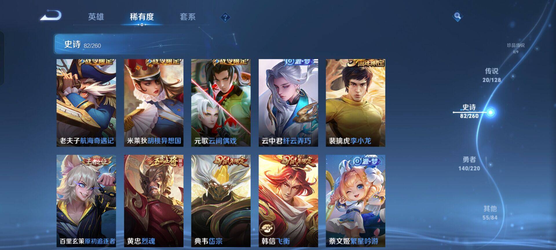 【传说皮肤】:女娲愿照千秋盛,妲己愿照众生和,澜愿照九州拓,虞姬愿照岁时盈,云缨幻光神枪,桑启鸣野蒿,孙尚香乘龙问璇玑,孙悟空齐天大圣,李信山海炽霜