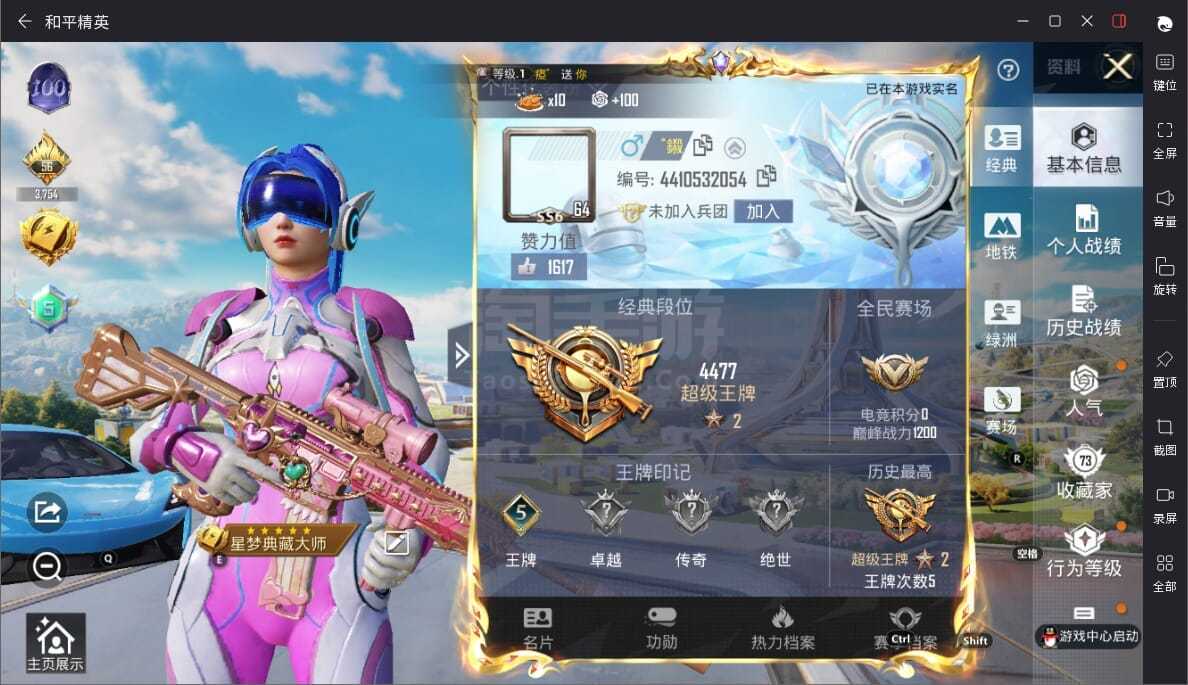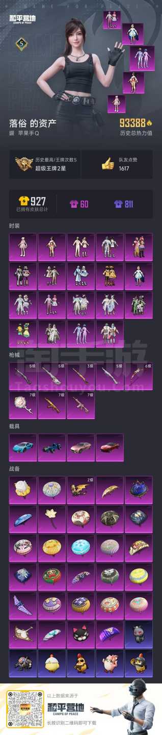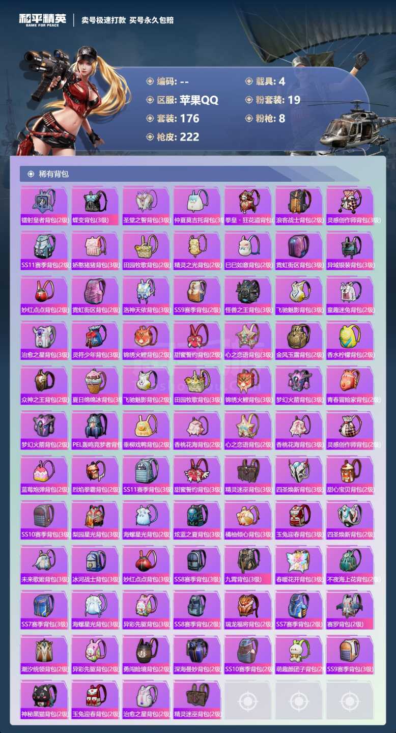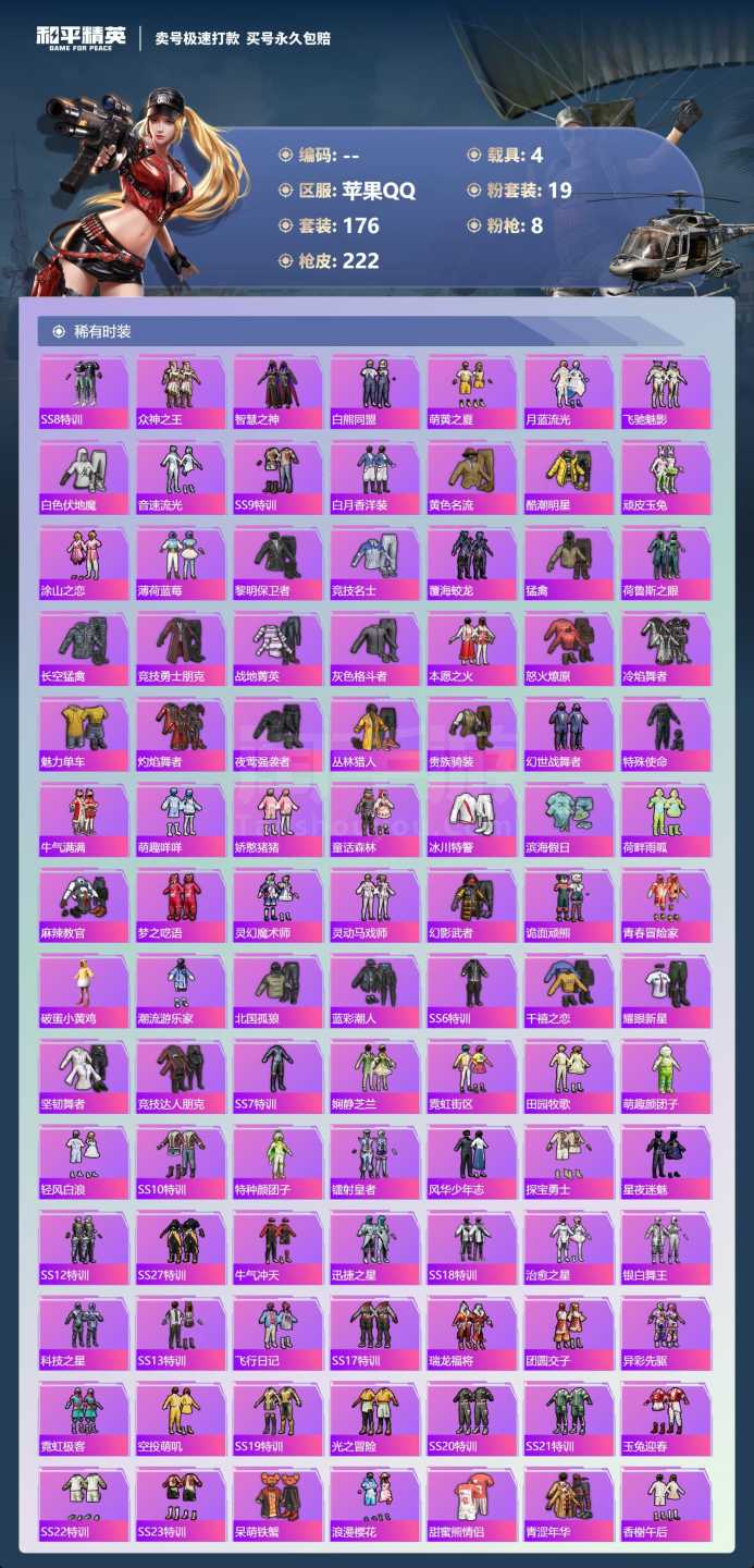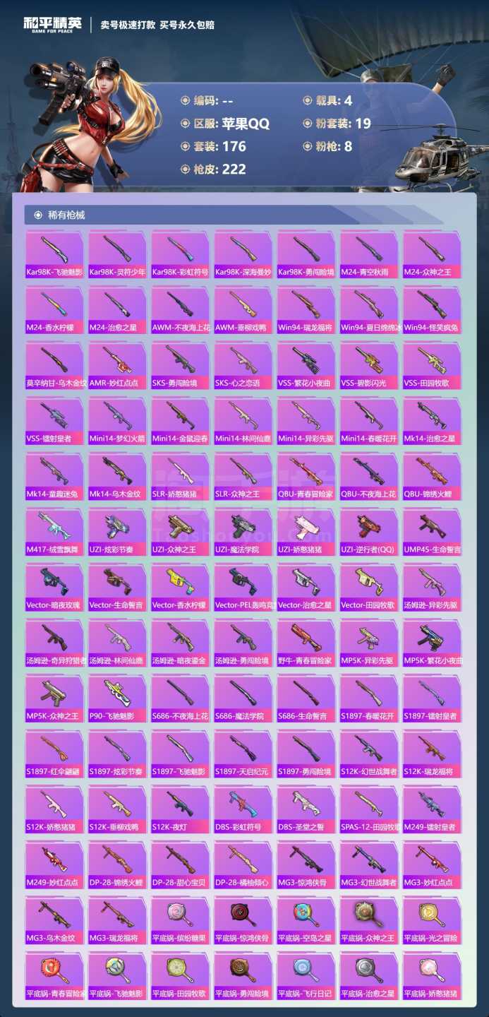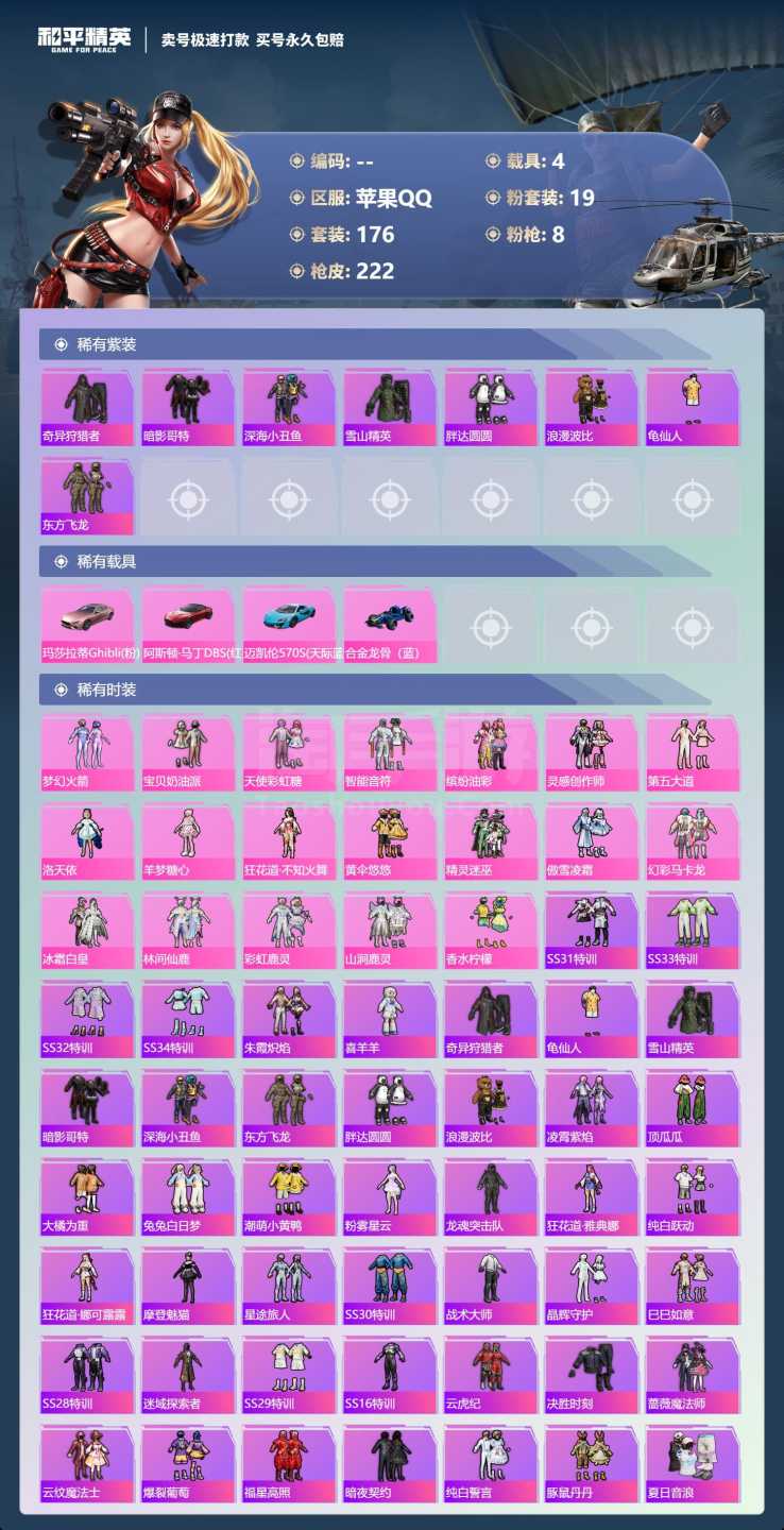 a3950/苹果QQ/-5王牌印记-19粉装-8特效枪-4载具-93388热力值-176套装-222
