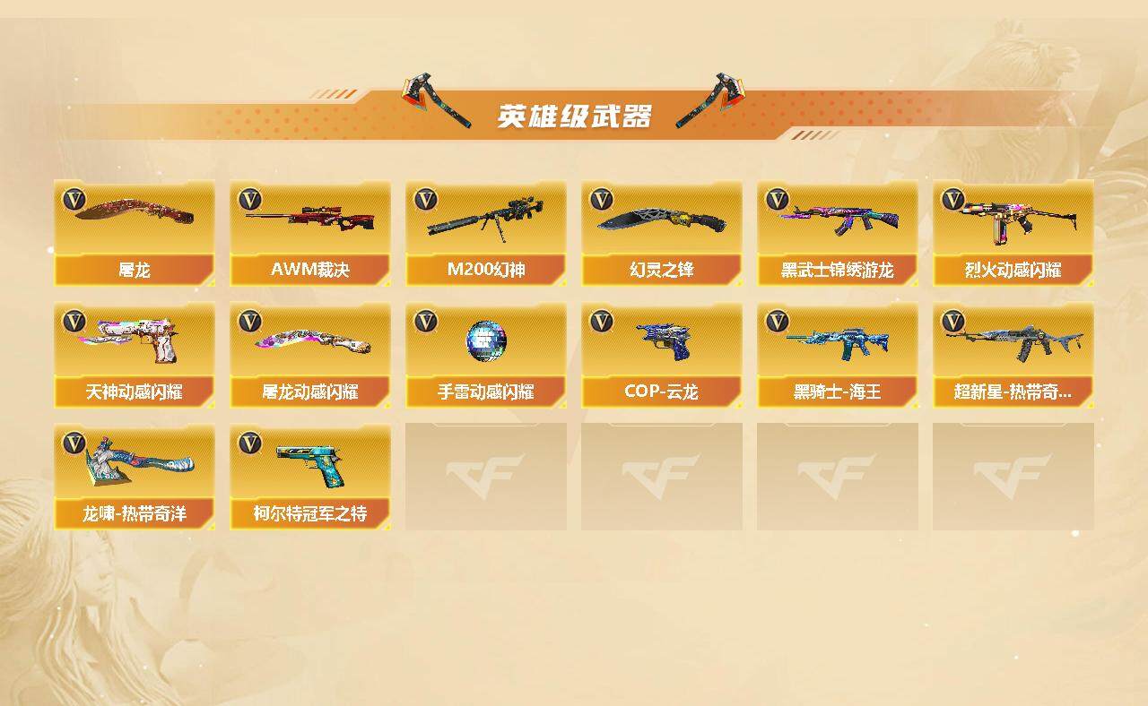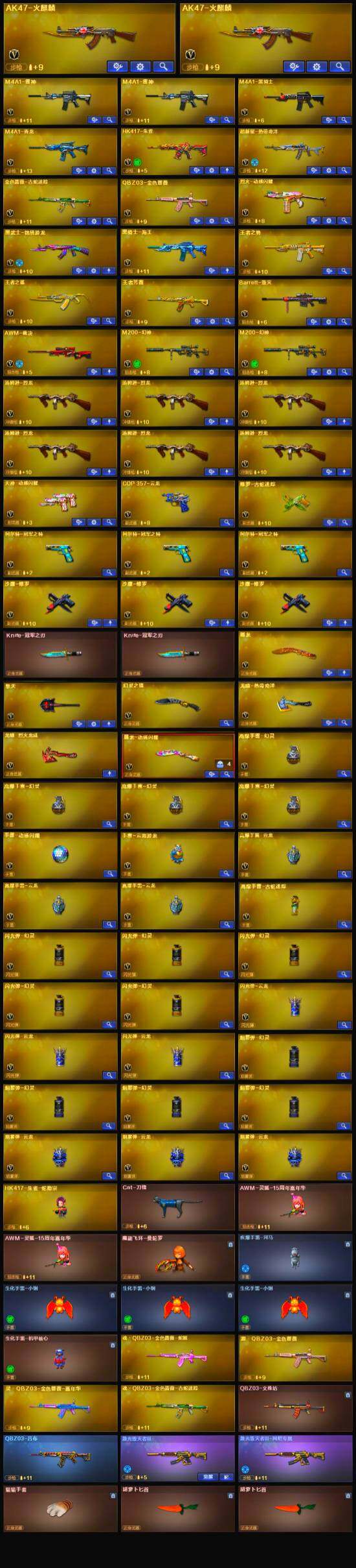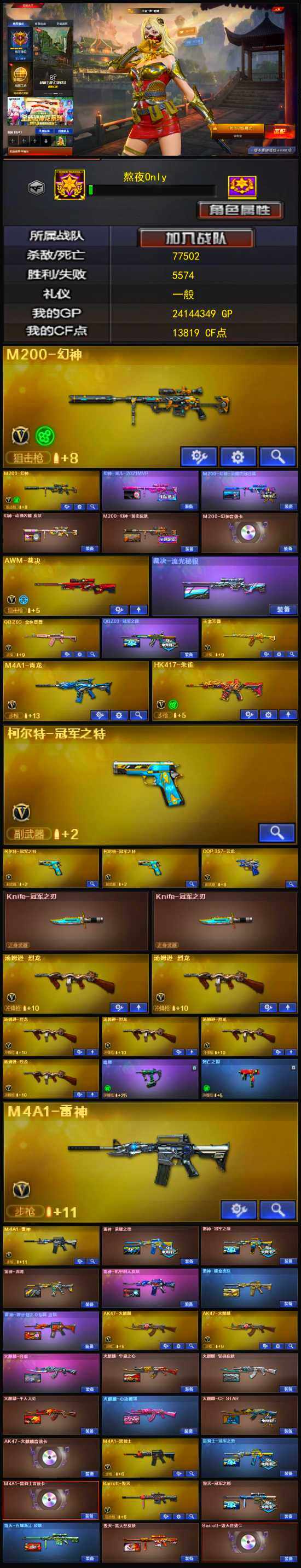 【热门武器】:QBZ03-金色蔷薇,HK417-朱雀,M4A1-青龙,M200-幻神*2,金色蔷薇-古蛇迷踪,修罗-古蛇迷踪,死亡之眼,柯尔特-冠军之特*3,Cat-刀锋,毒蜂,M4A1-黑骑士,汤姆逊-烈龙*6,COP-白鲨,沙鹰-修罗*3,Knife-冠军之刃*2