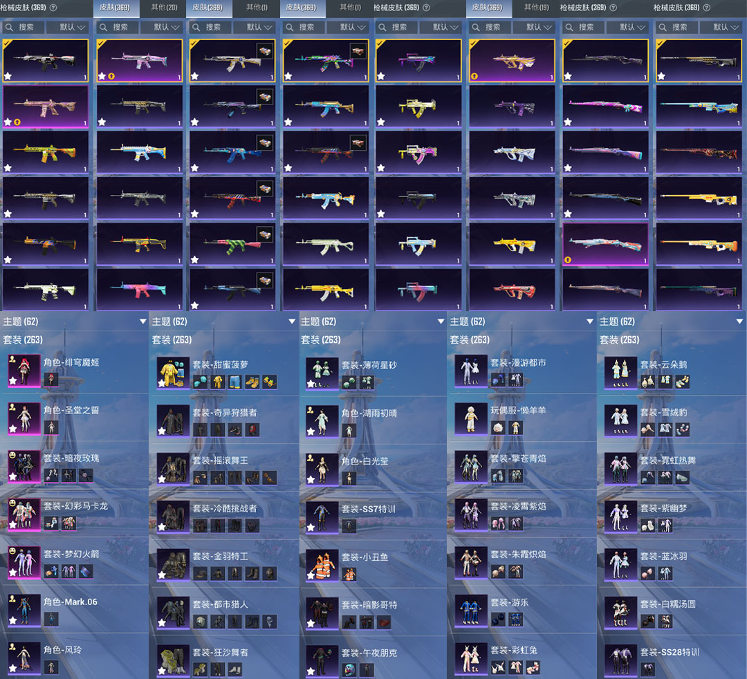 特效枪7:SCAR-L-梦幻火箭-7级, AUG-圣斗士星矢-7级, M416-心之恋语-7级, Kar98K-巳巳如意-5级, UMP45-量子极限-5级, DP-28-豹影疾电-5级 ,MG-36-沧焰双生-5级 ,