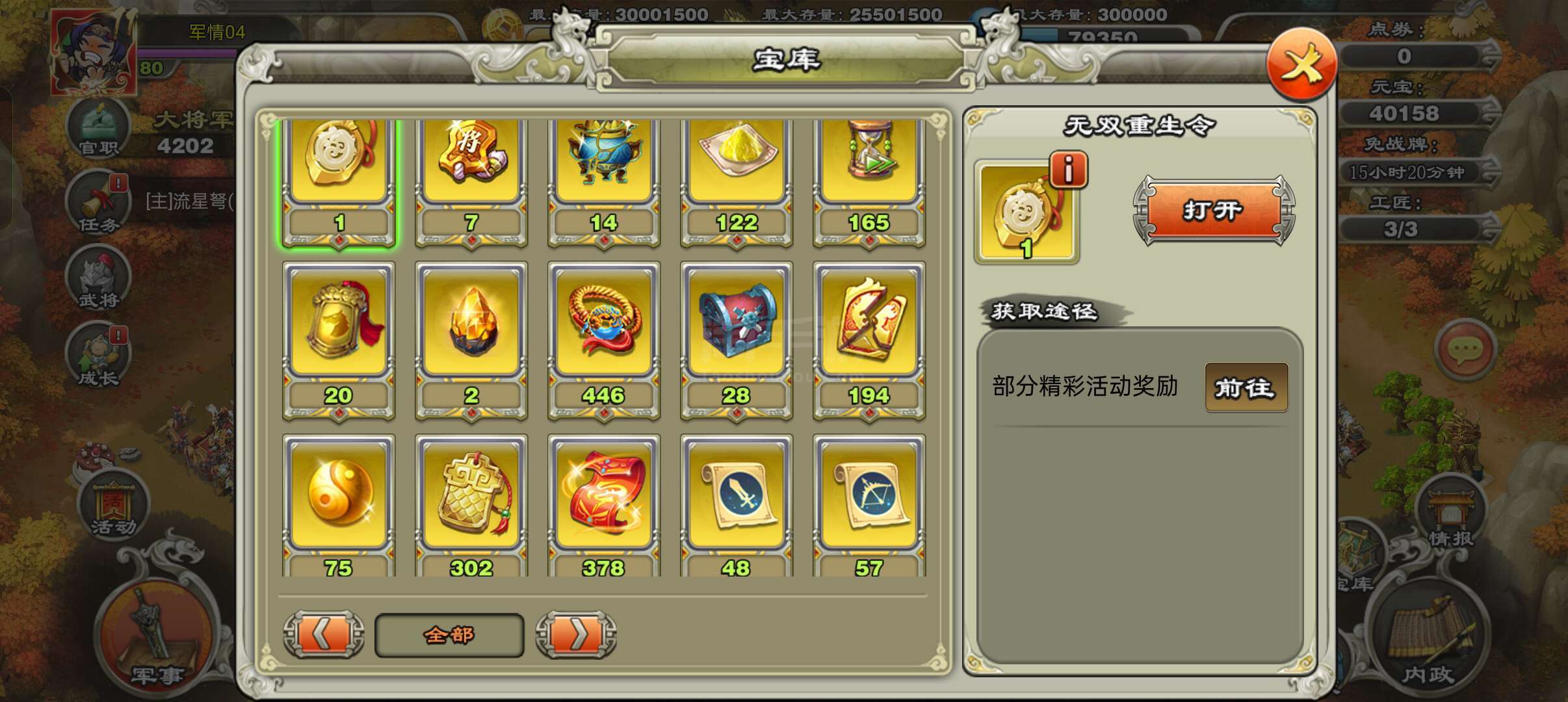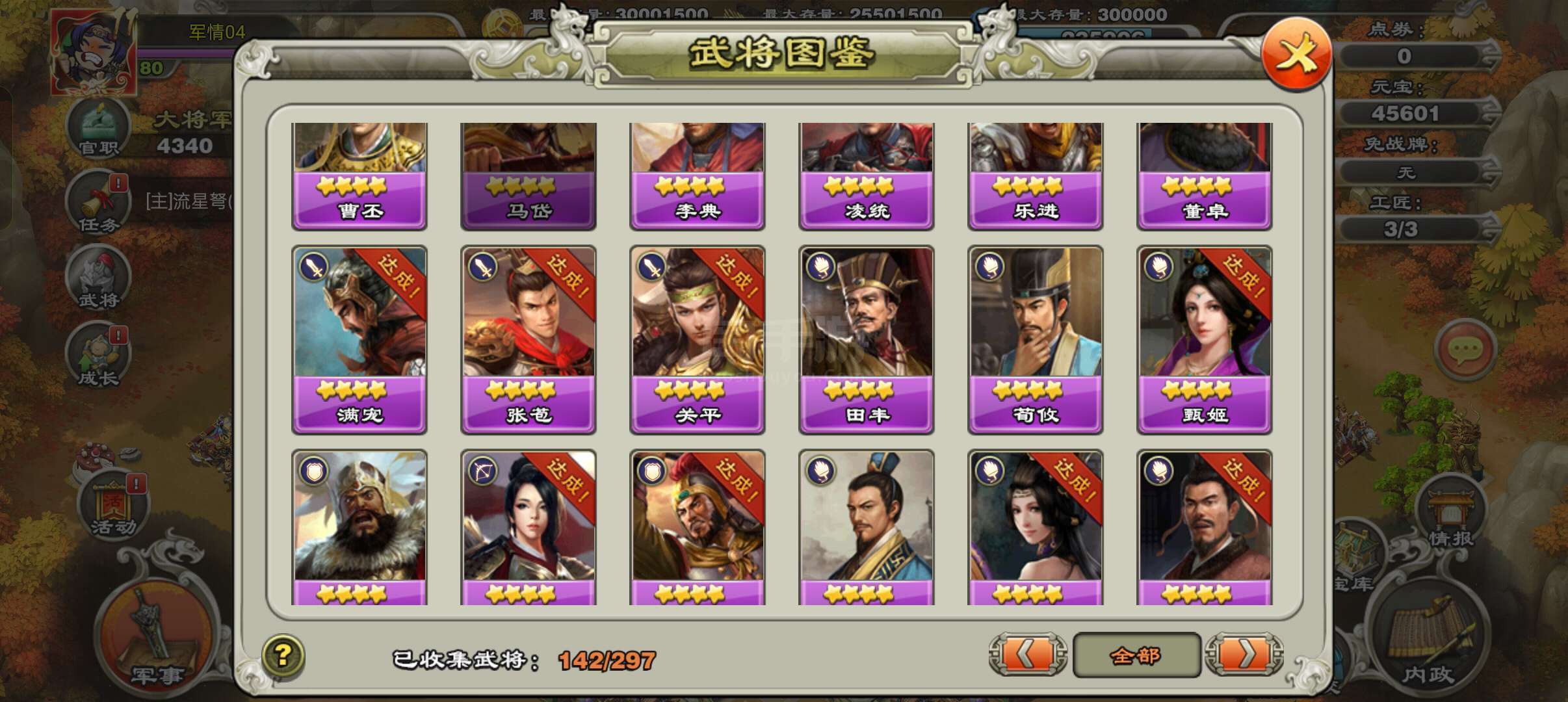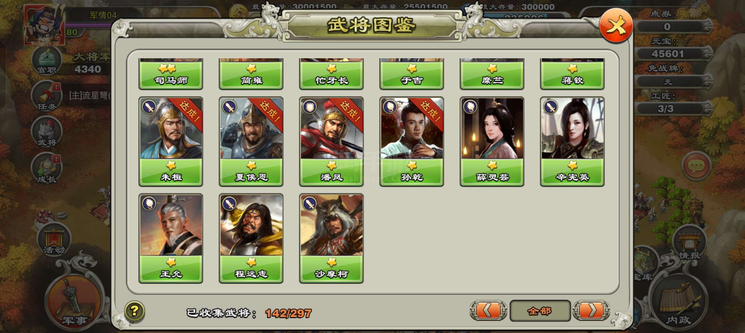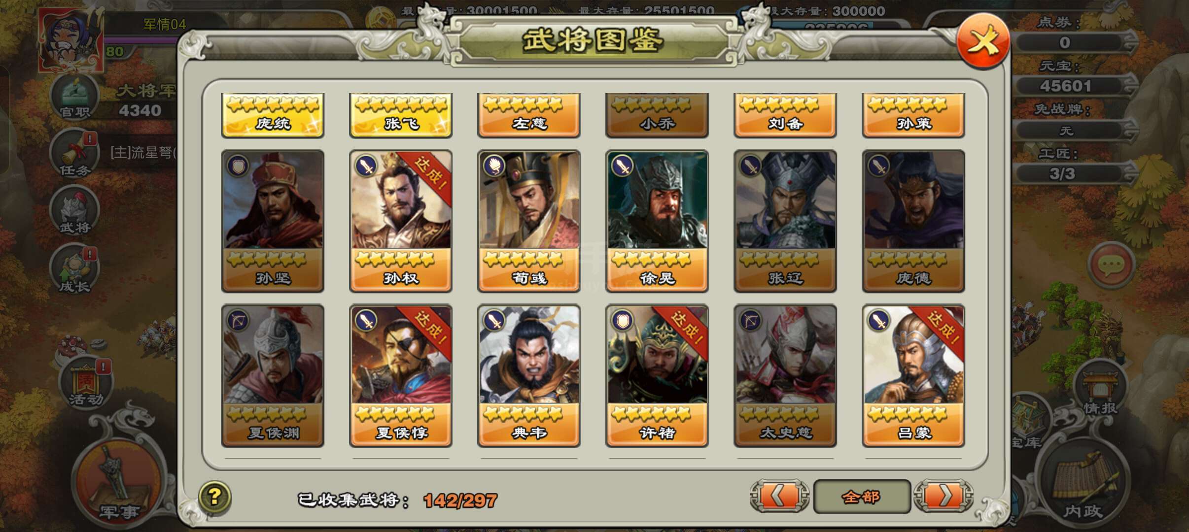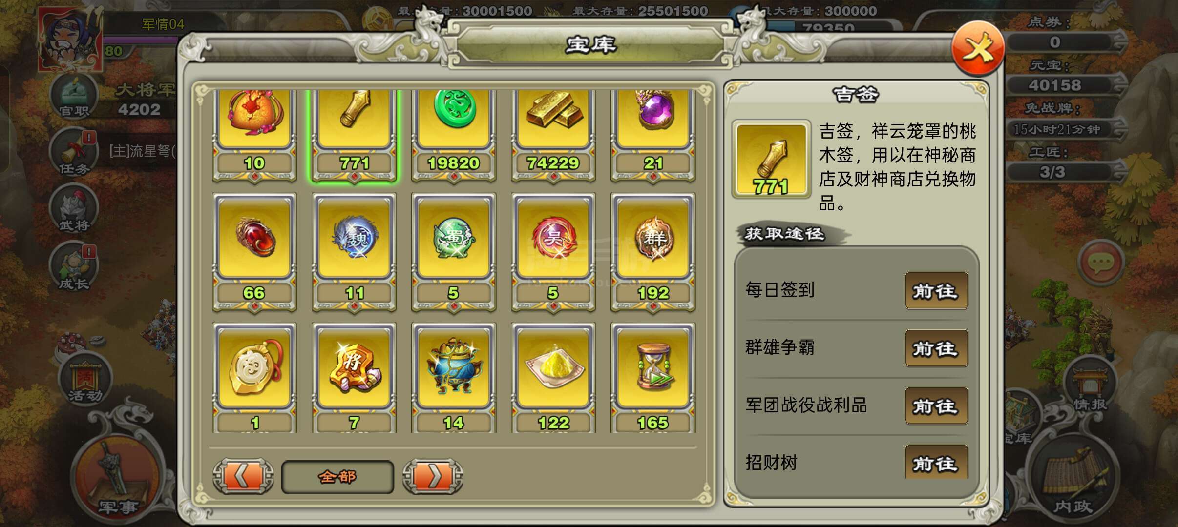 有ID,各种资源超多,元宝48000,吉签877,群雄宝箱380未开。大多数武将未点亮可领元宝,功绩