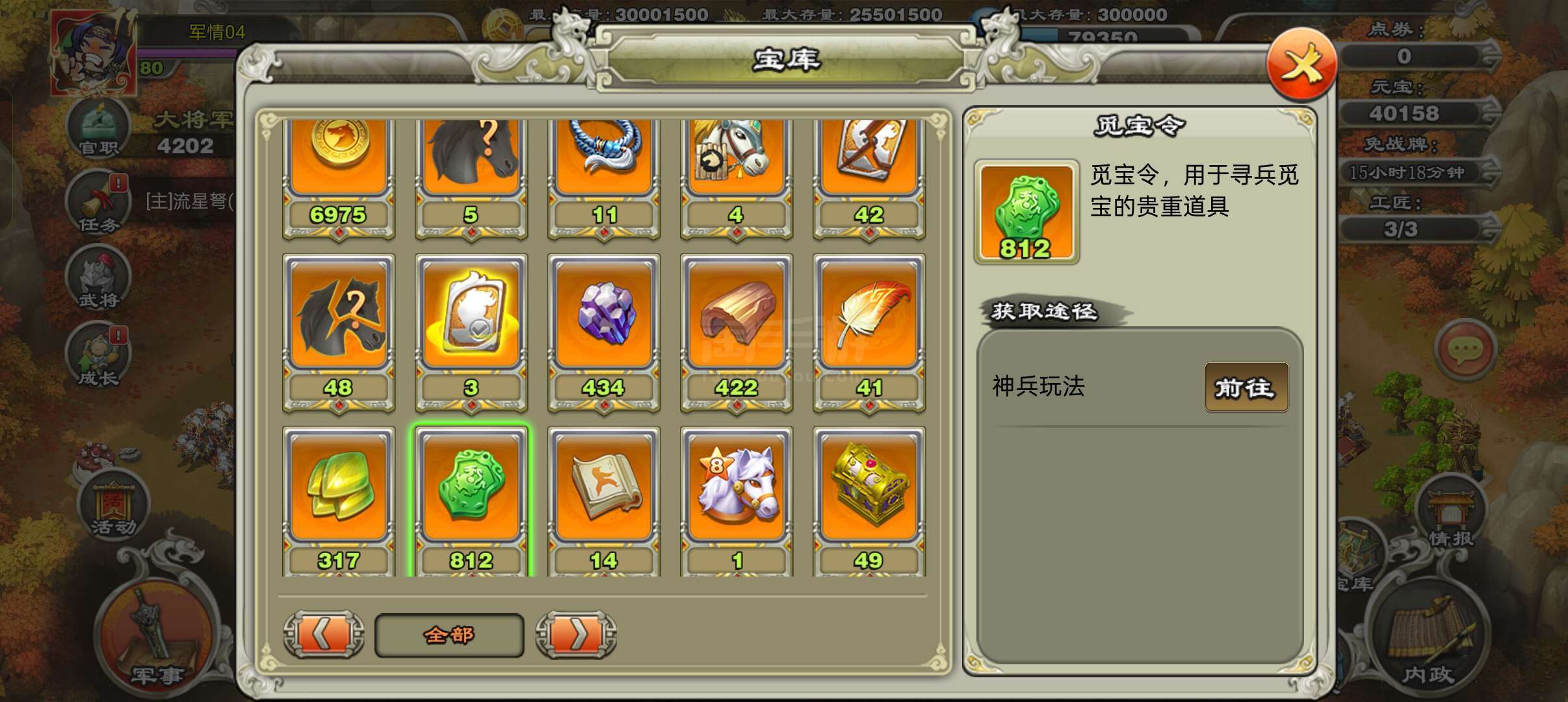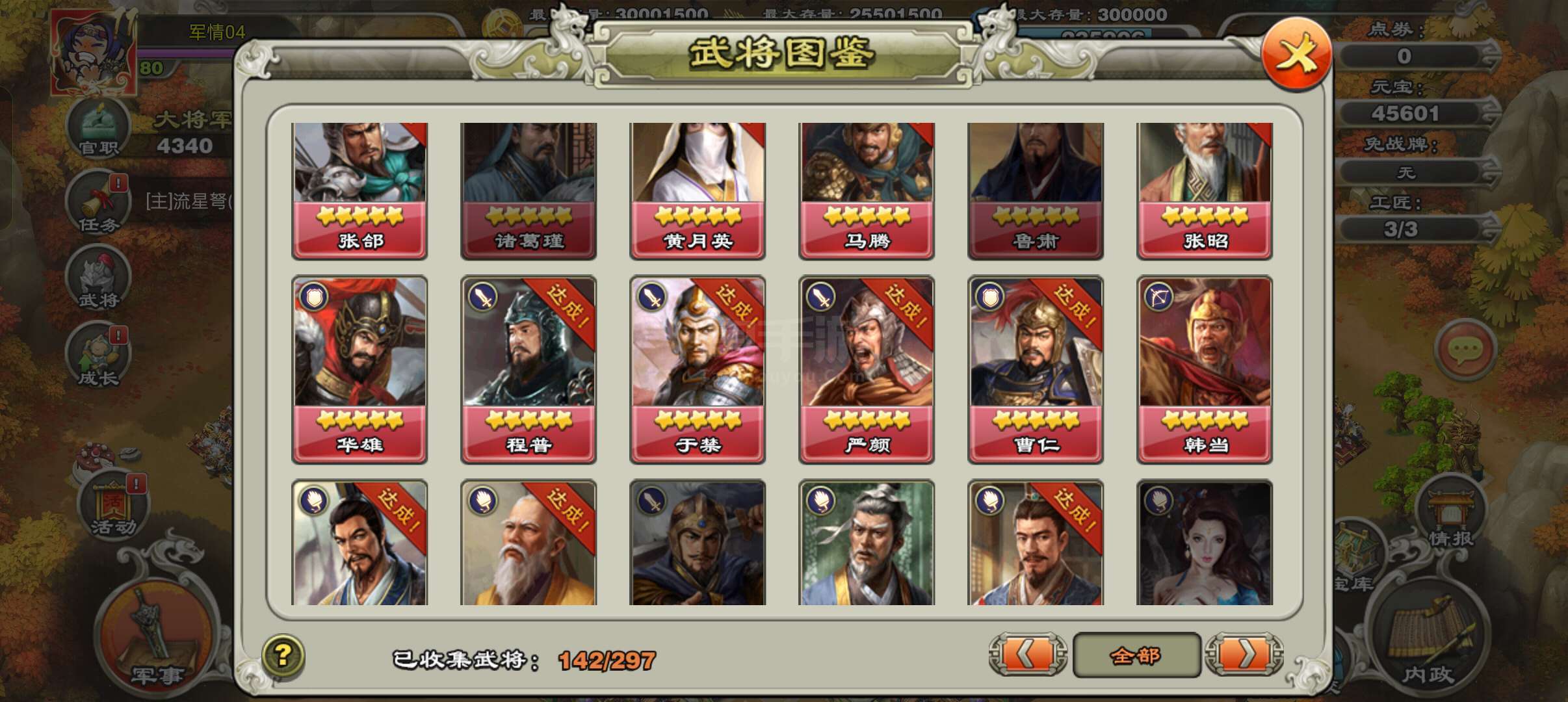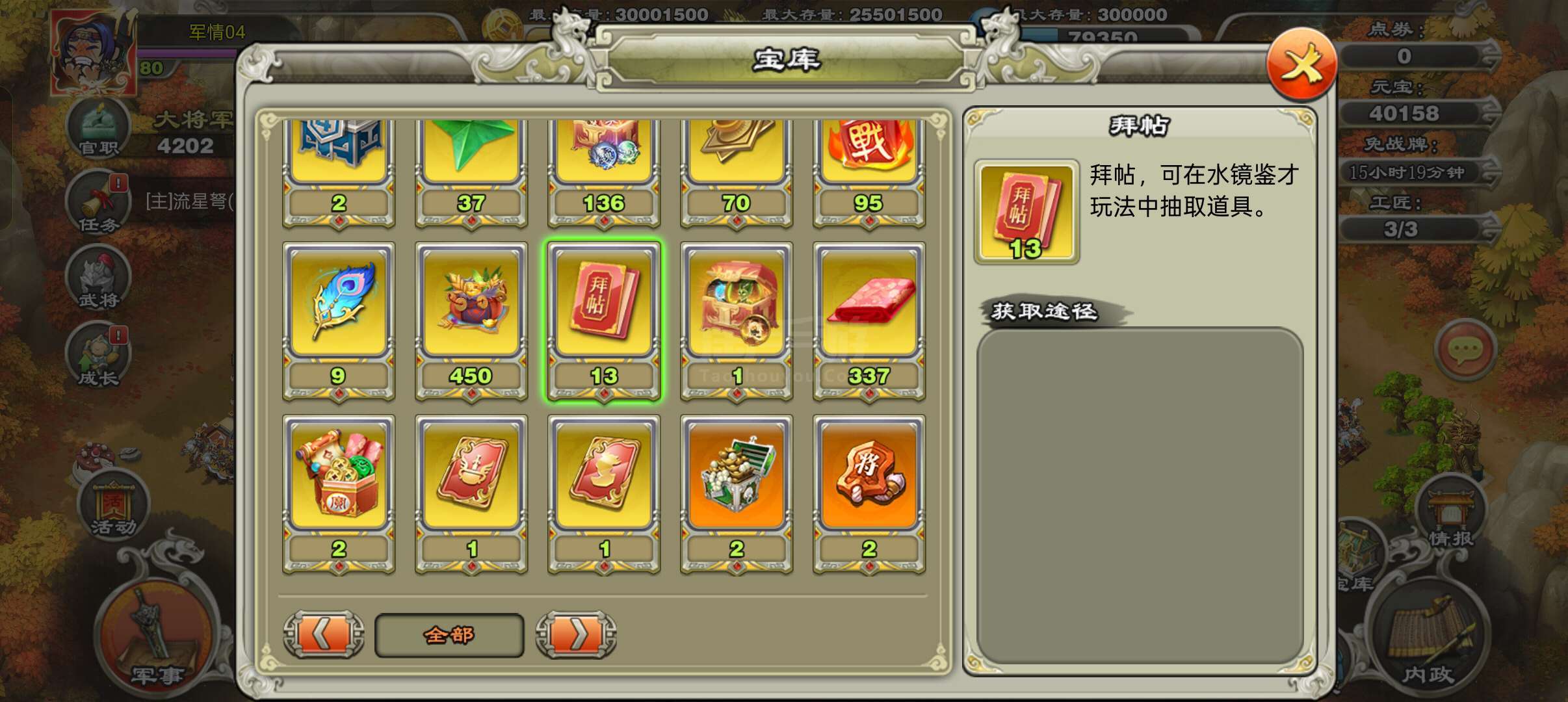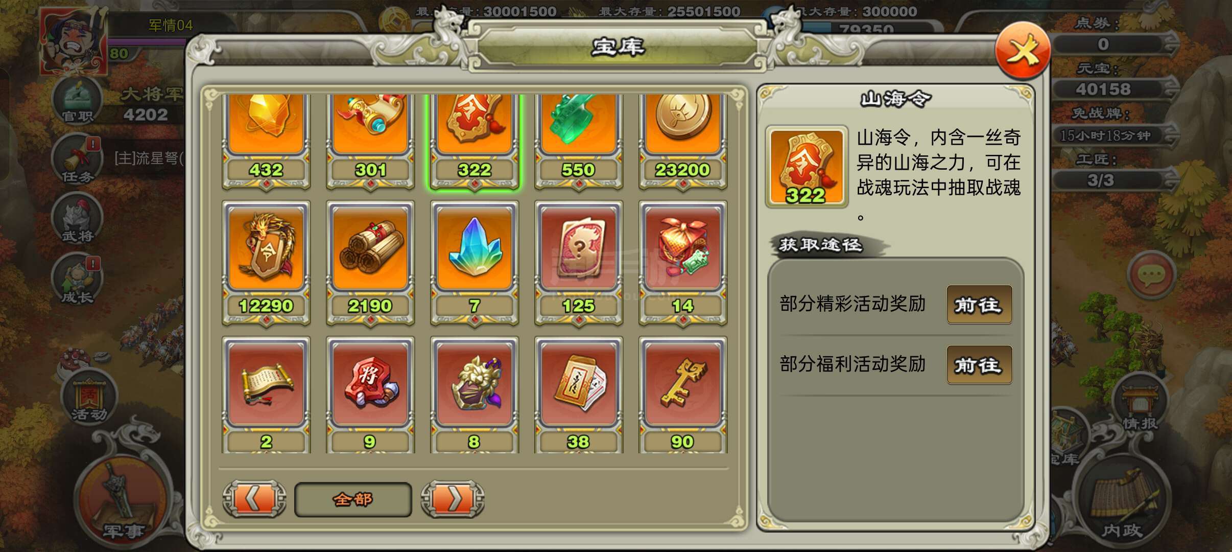 有ID,各种资源超多,元宝48000,吉签877,群雄宝箱380未开。大多数武将未点亮可领元宝,功绩
