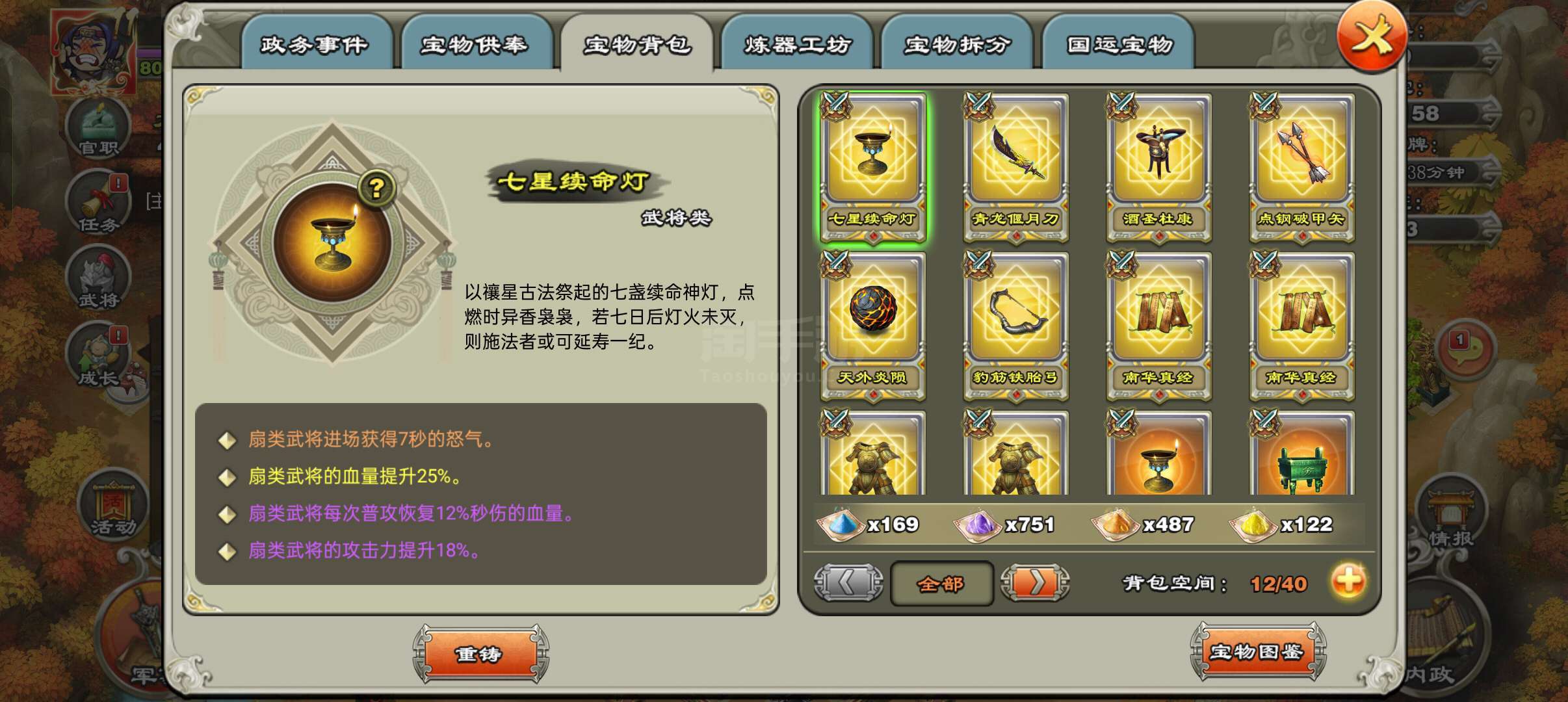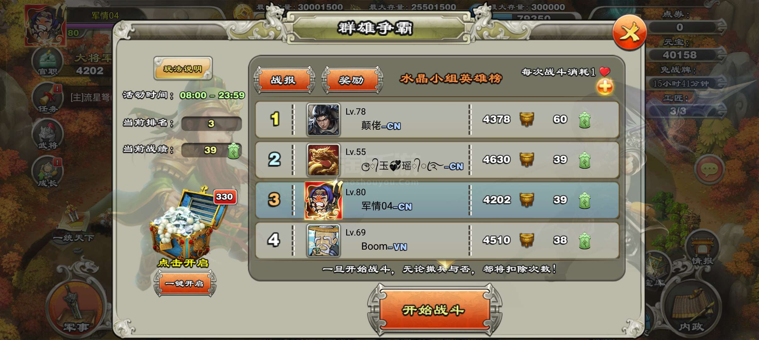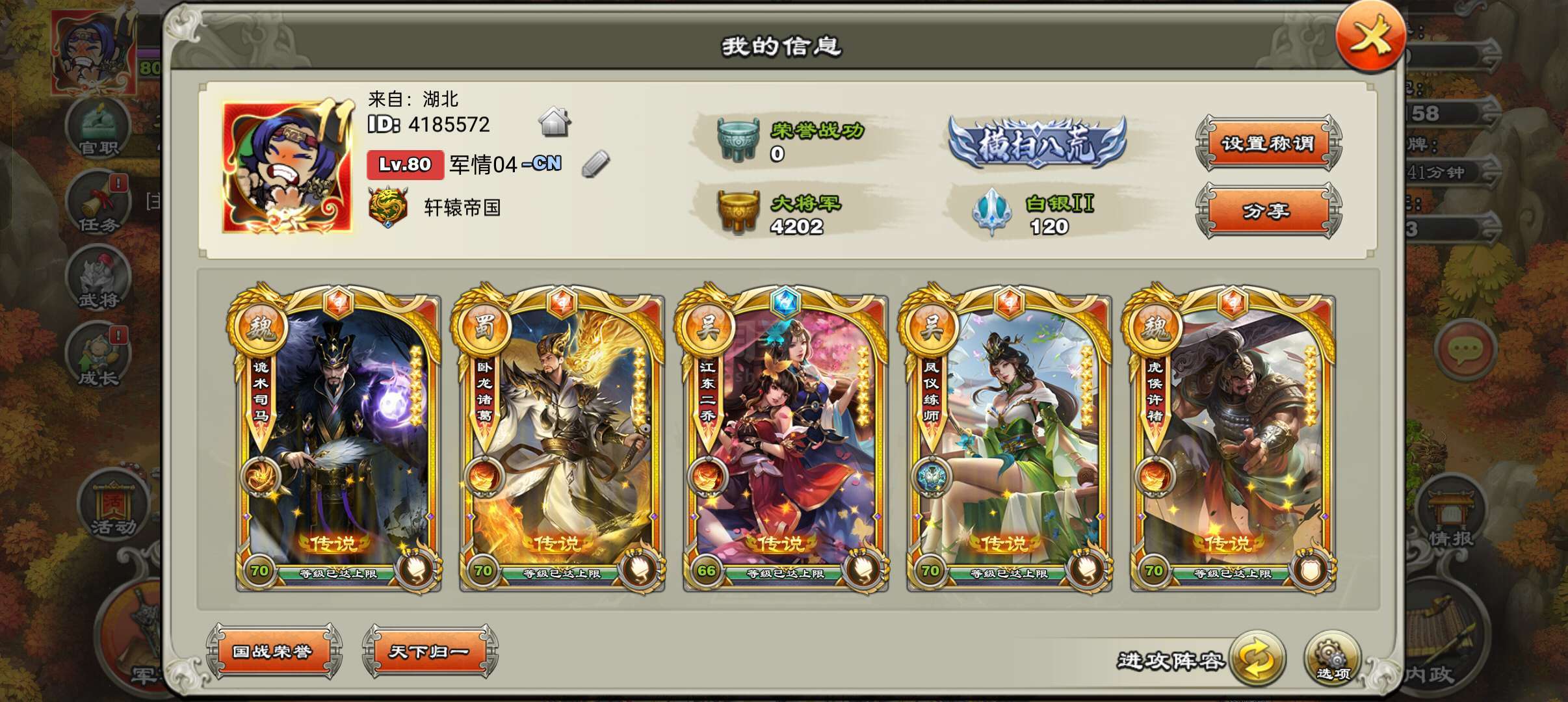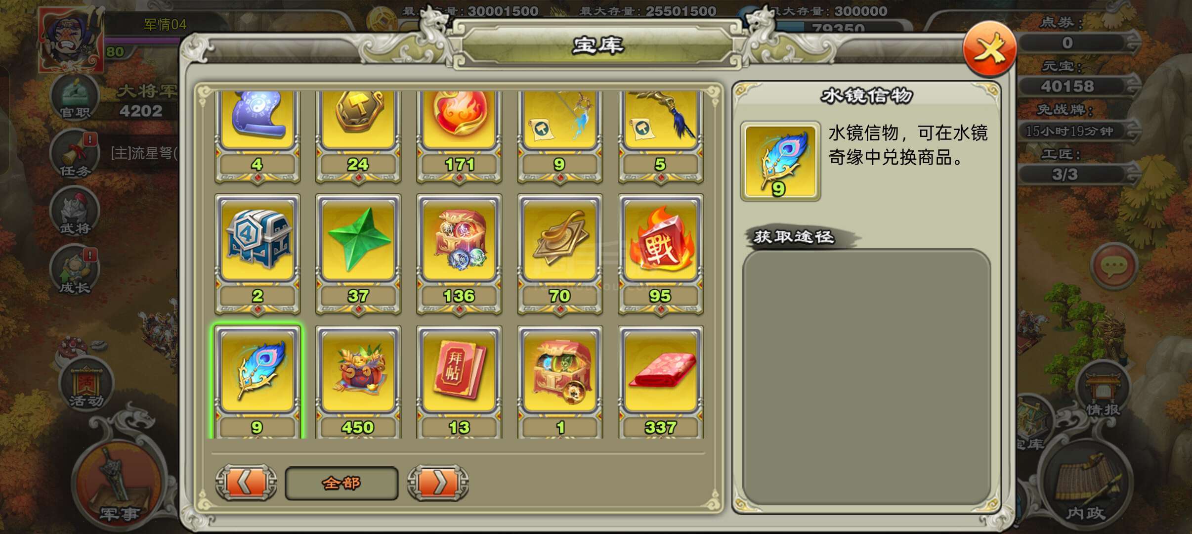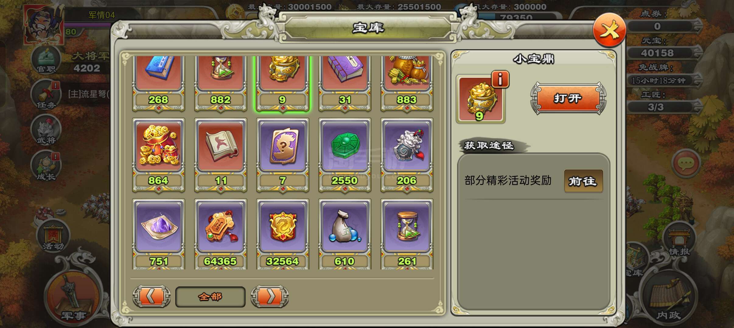 有ID,各种资源超多,元宝48000,吉签877,群雄宝箱380未开。大多数武将未点亮可领元宝,功绩