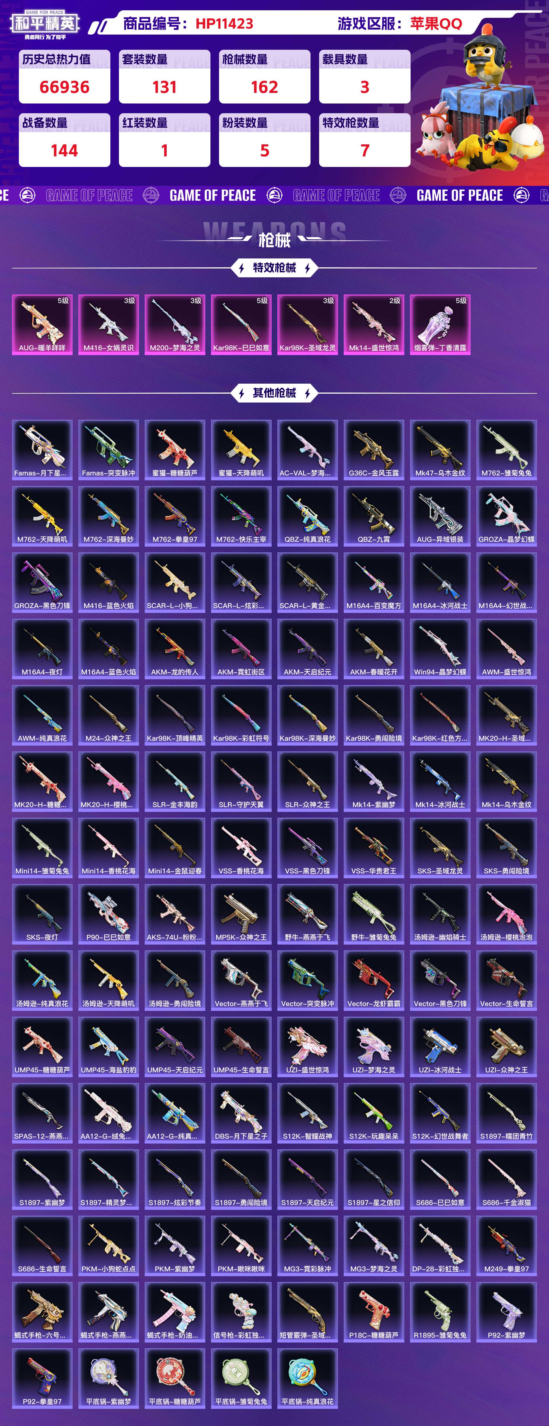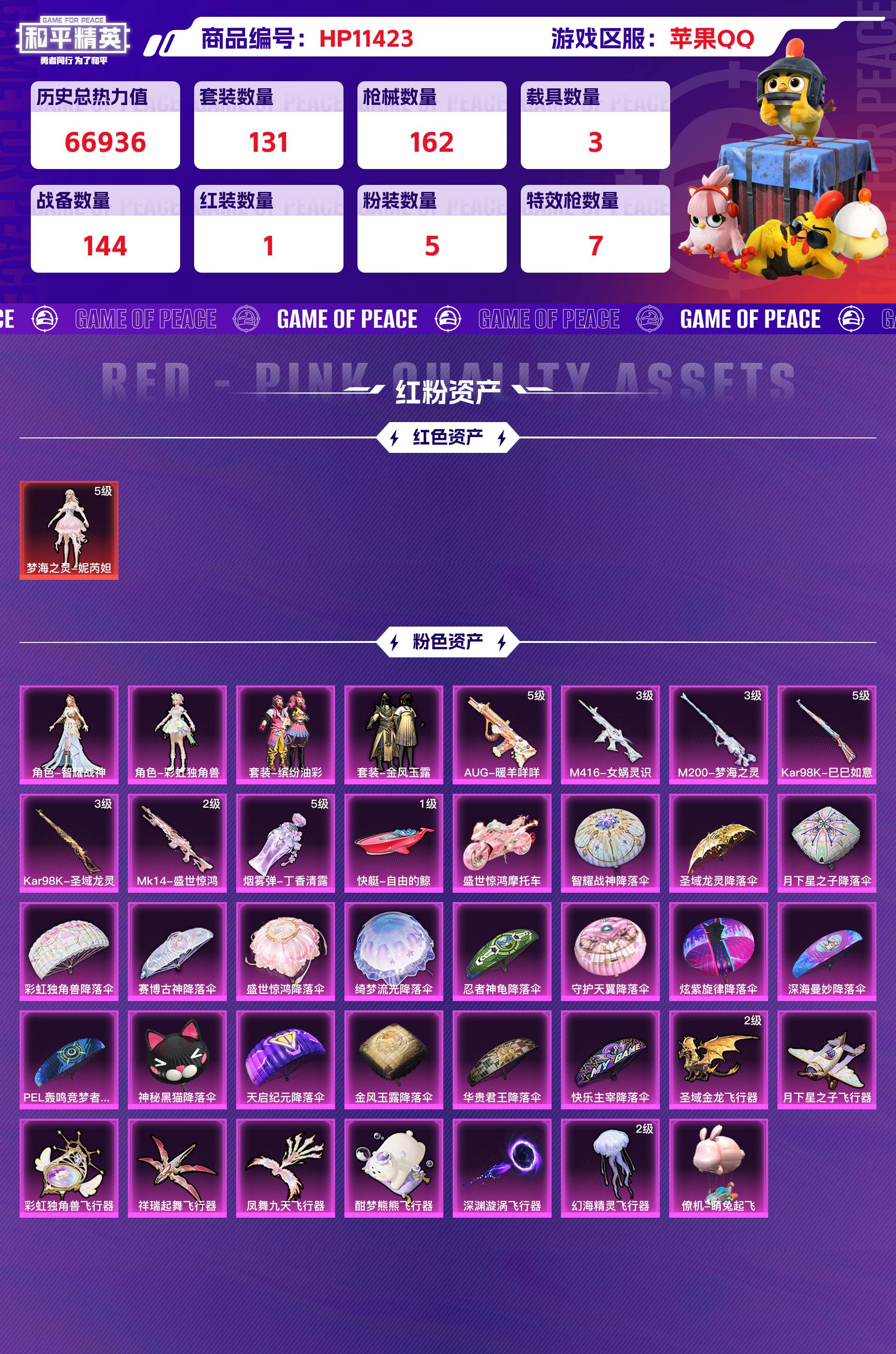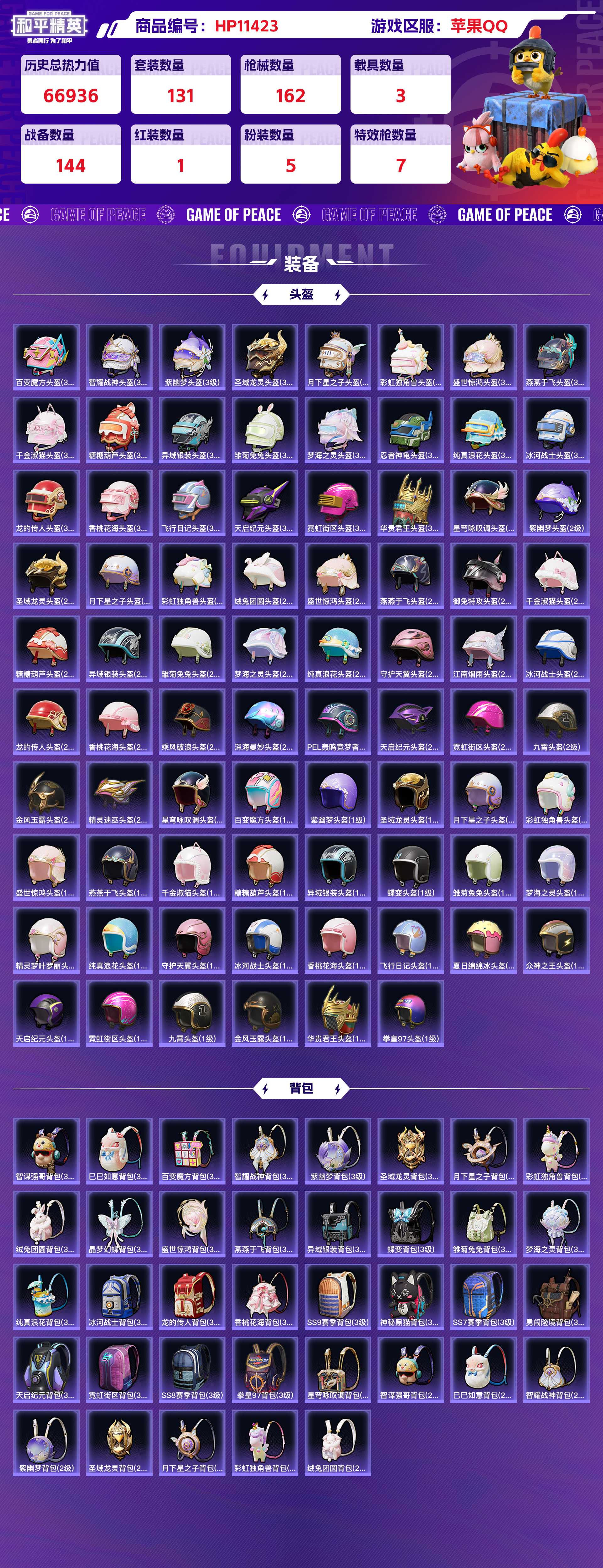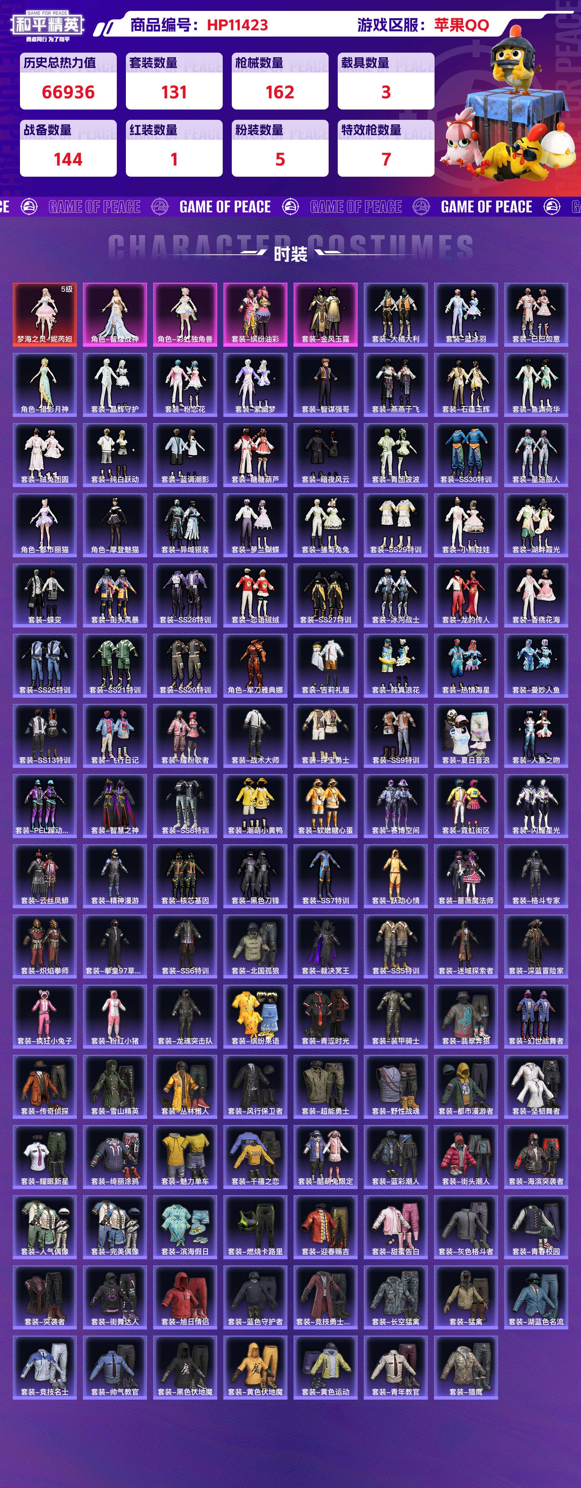 苹果QQ 历史总热力值:66936 红装数量:1 粉装数量:5 特效枪数量:7 载具数量:3 王牌印记:7 历史最高段位:绝世王牌11星 套装数量:131 时装数量:544 枪械数量:162 战备数量:144 装备数量:212 载具:盛世惊鸿摩托车,快艇-自由的鲸(1级),辉羽雀灵自行车 时装:梦海之灵-妮芮妲(5级),套装-缤纷油彩,套装-金风玉露,角色-彩虹独角兽,角色-智耀战神,角色-月下星之子,套装-PEL躁动竞梦者,套装-SS13特训,套装-SS20特训,套装-SS21特训,套装-SS