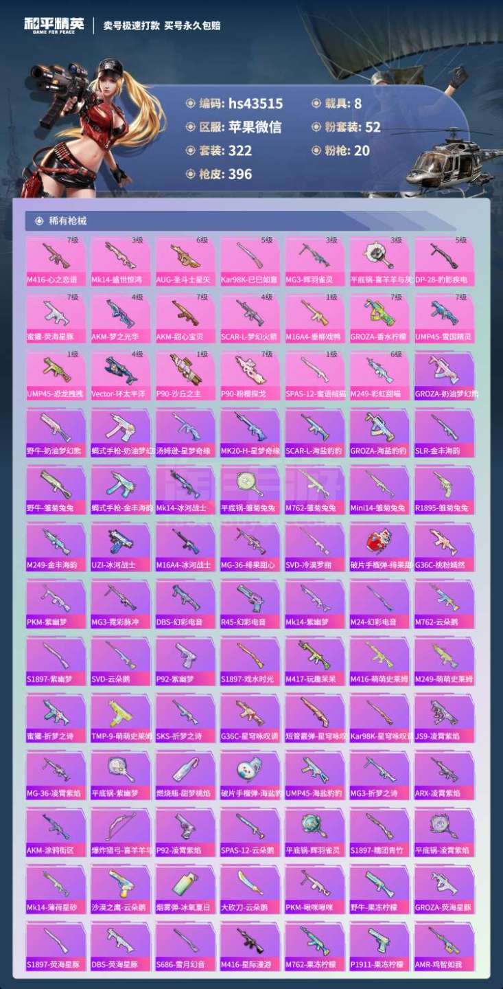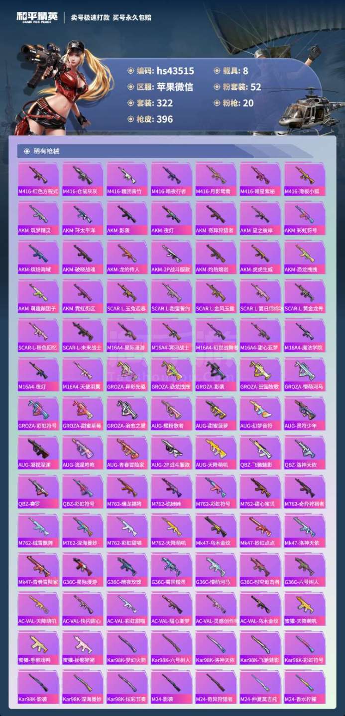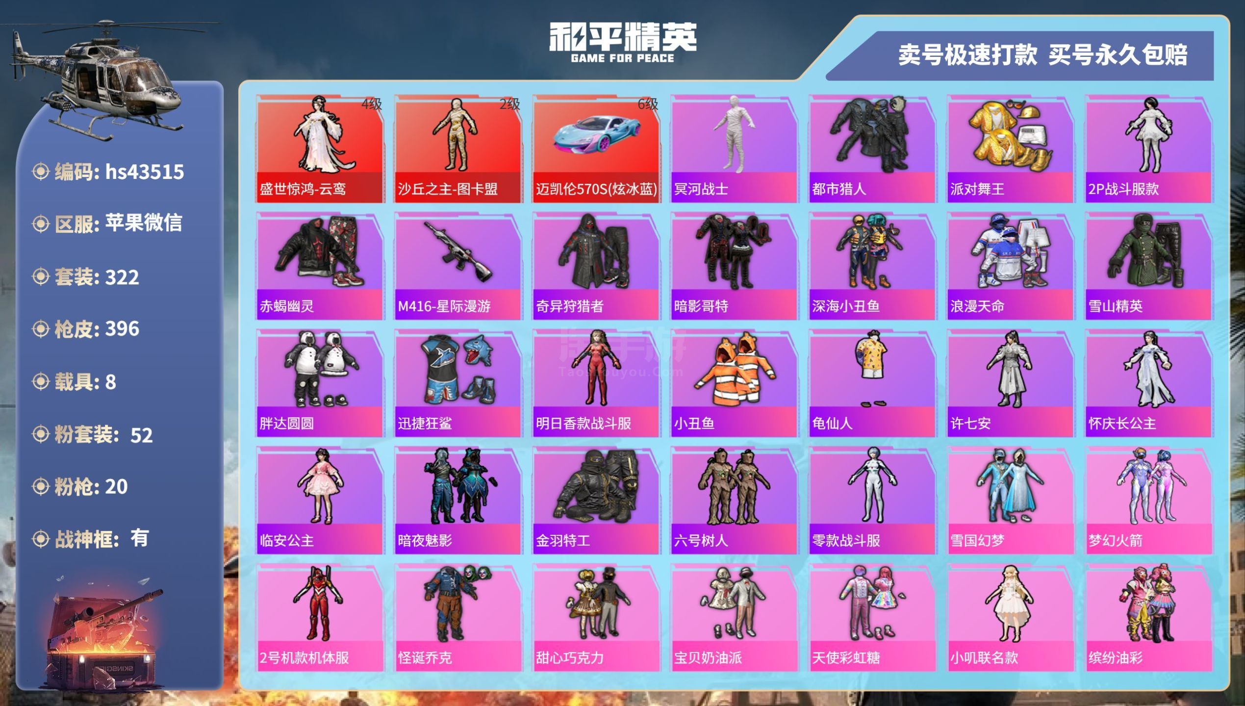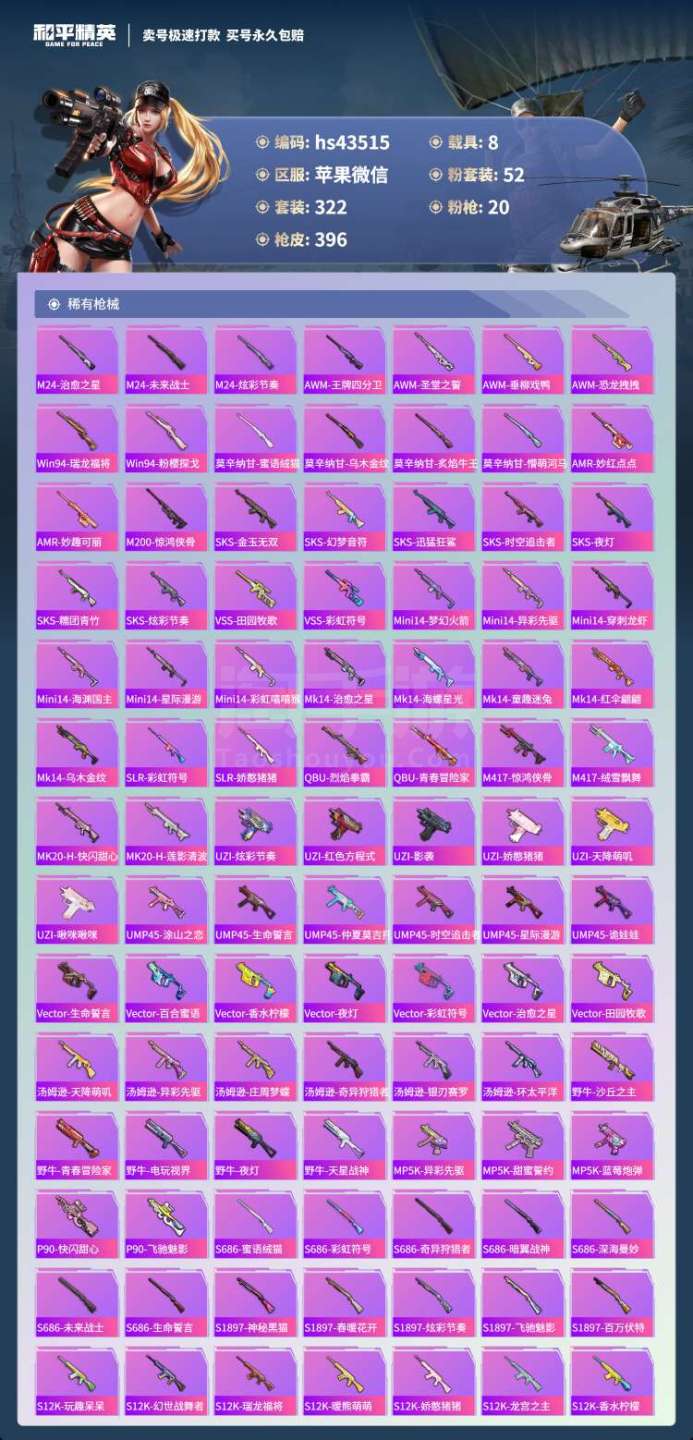 和平精英【苹果微信】hs43515 苹果微-20王牌印记-有战神框-52粉装-20特效枪-8载具-187010热力值-