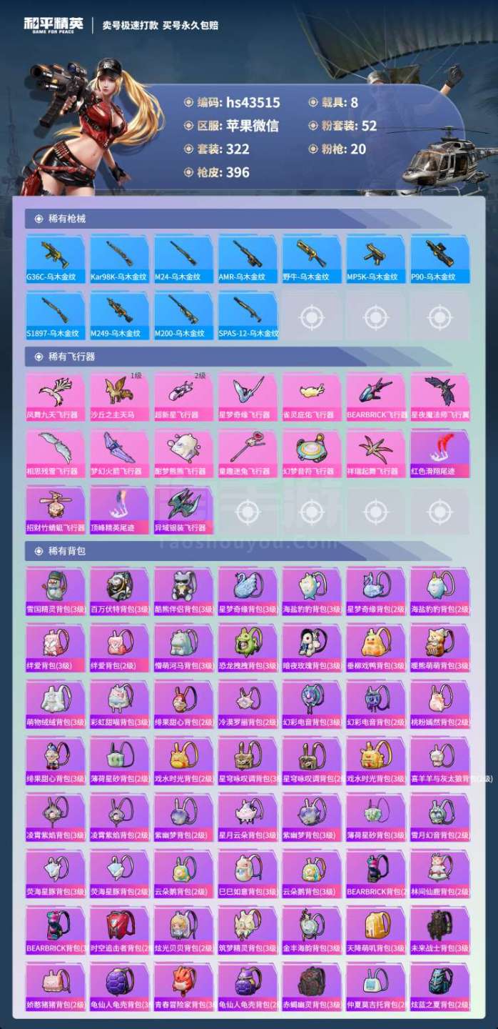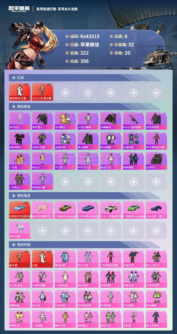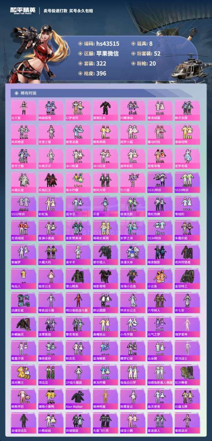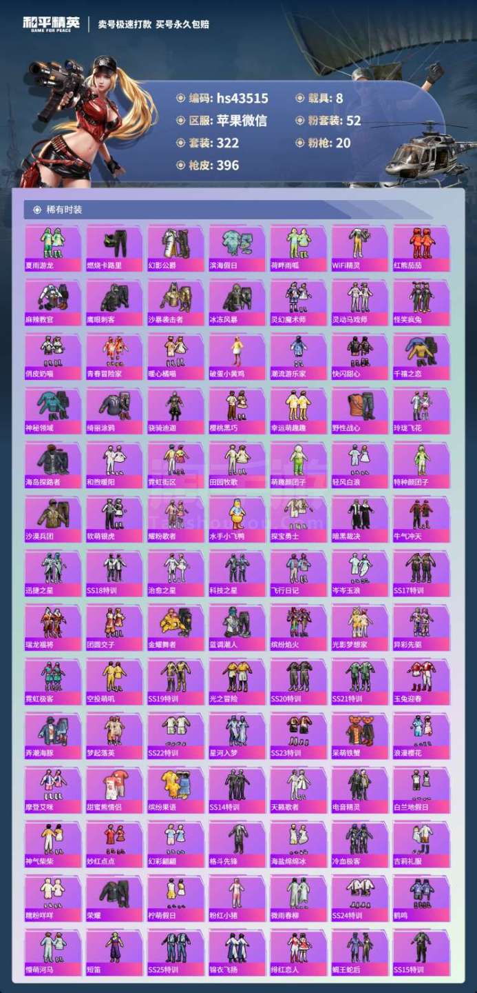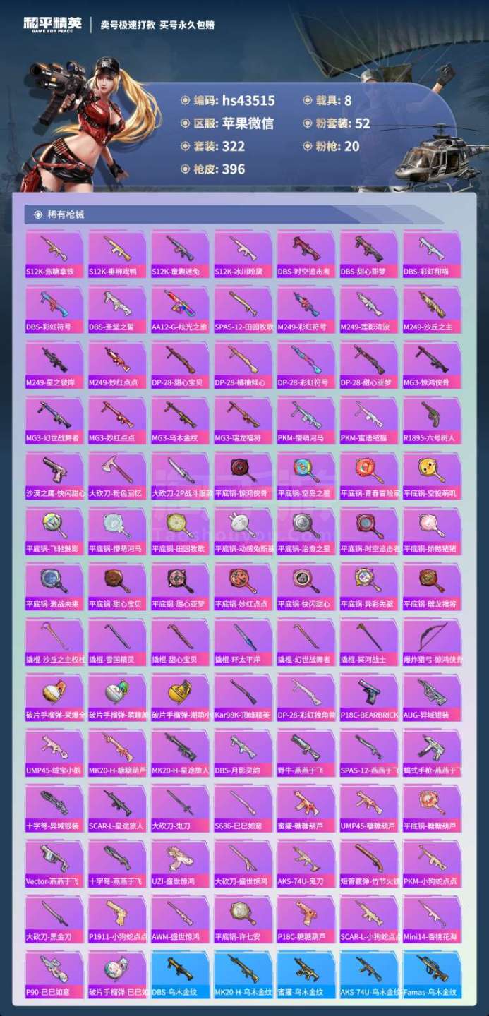 和平精英【苹果微信】hs43515 苹果微-20王牌印记-有战神框-52粉装-20特效枪-8载具-187010热力值-