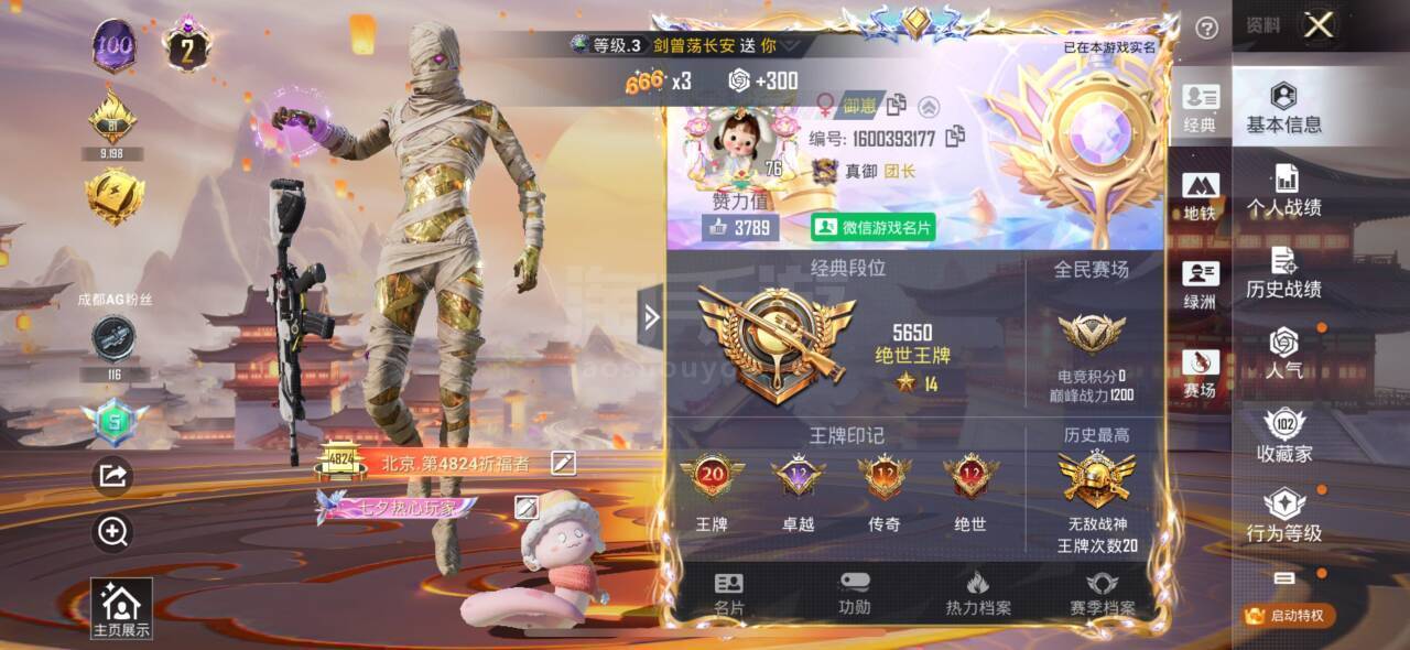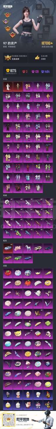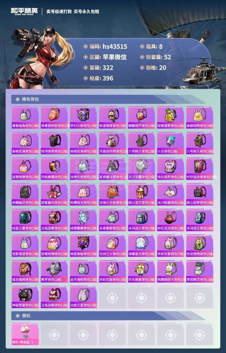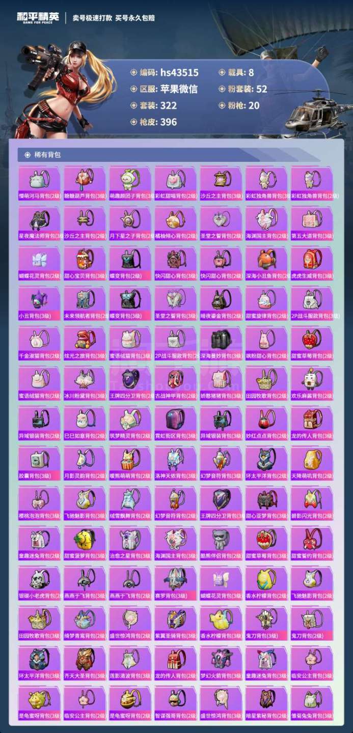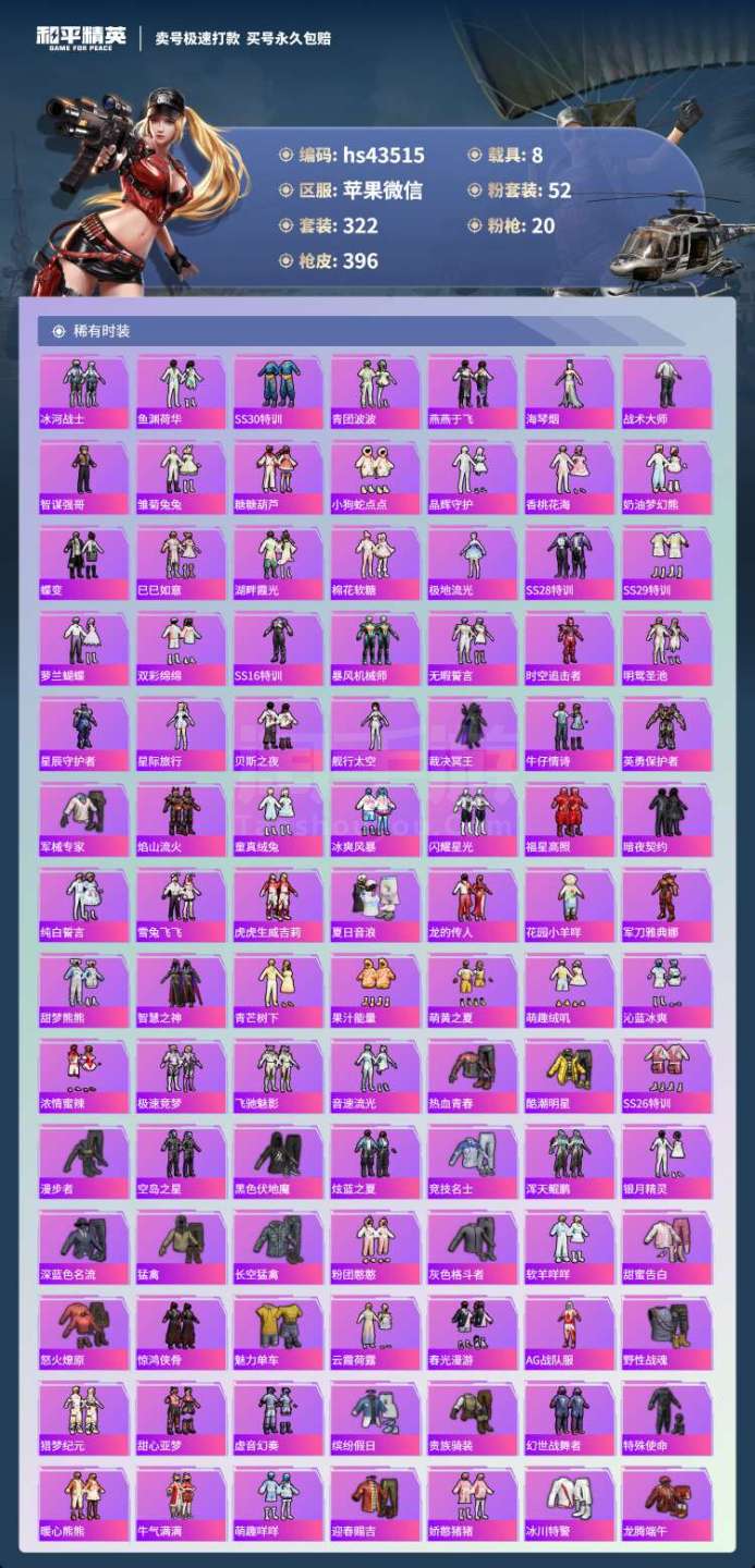 和平精英【苹果微信】hs43515 苹果微-20王牌印记-有战神框-52粉装-20特效枪-8载具-187010热力值-