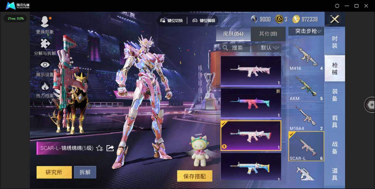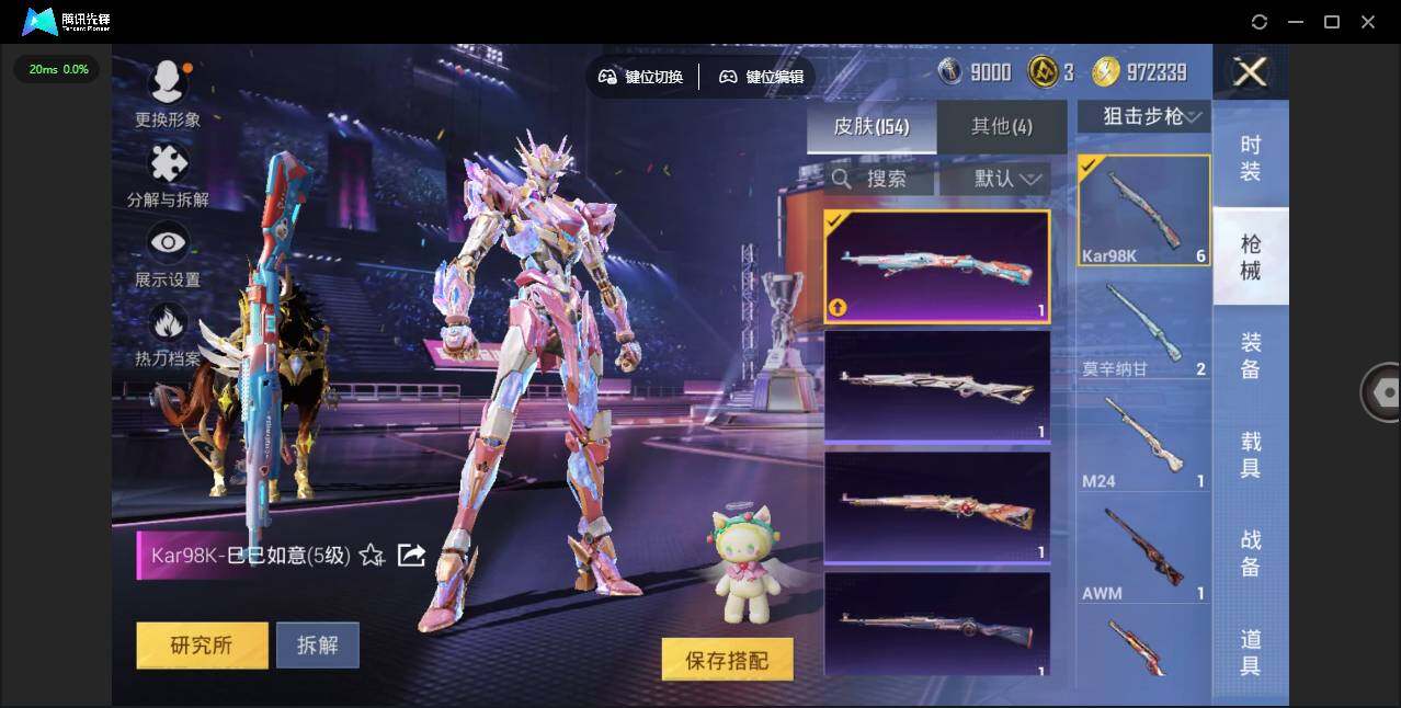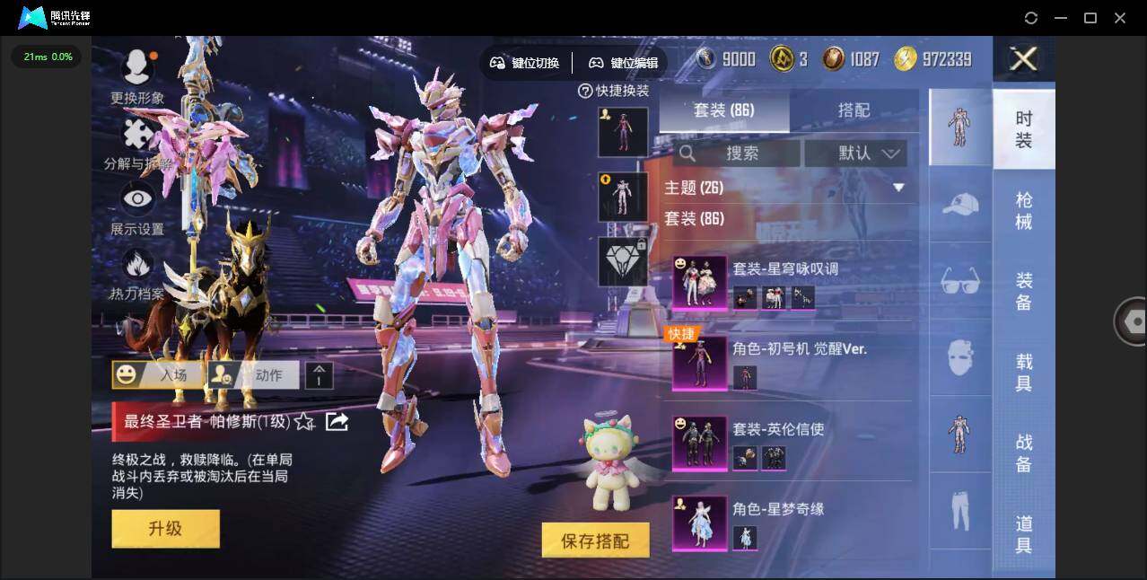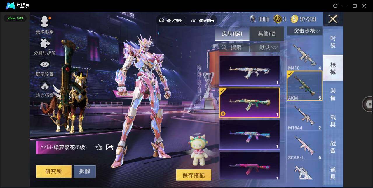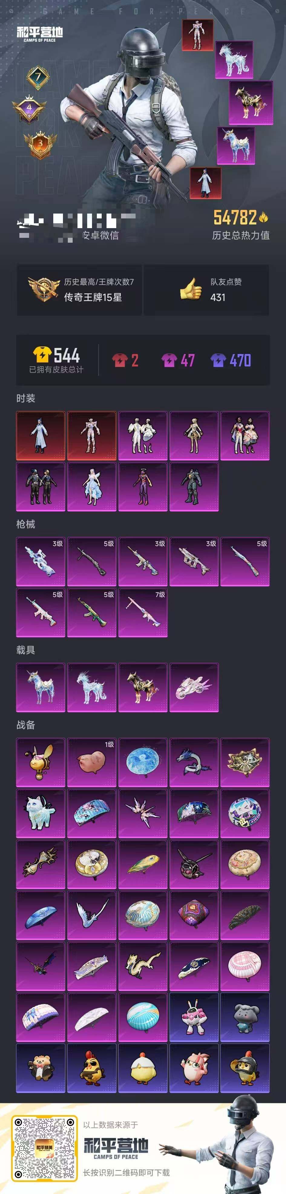 时装数: 86 载具数: 4 枪械数: 153 战备数: 113 热门装扮: 寒光使者,复仇流浪者,星梦奇缘,初号机 觉醒Ver.,英伦信使 载具: 星梦玉骢 稀有枪皮: 七级MG3-梦幻舞会 五级SCAR-L-锦绣绵绵,五级AKM-绿萝繁花,五级Kar98K-巳巳如意,五级DP-28-豹影疾电三级Vector-最终圣卫者,三级M416-灵猫魔法师,三级P90-魔童闹海 敖丙