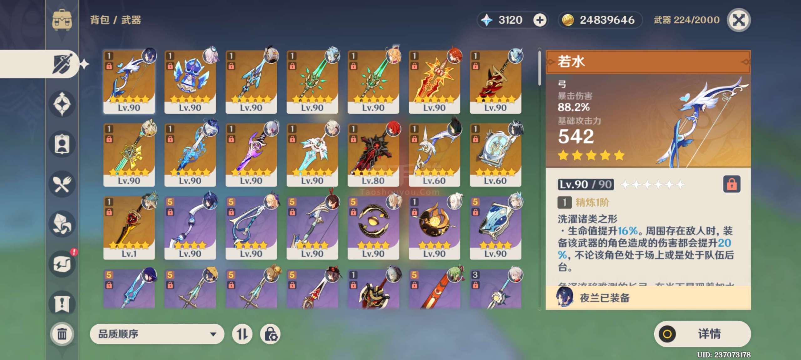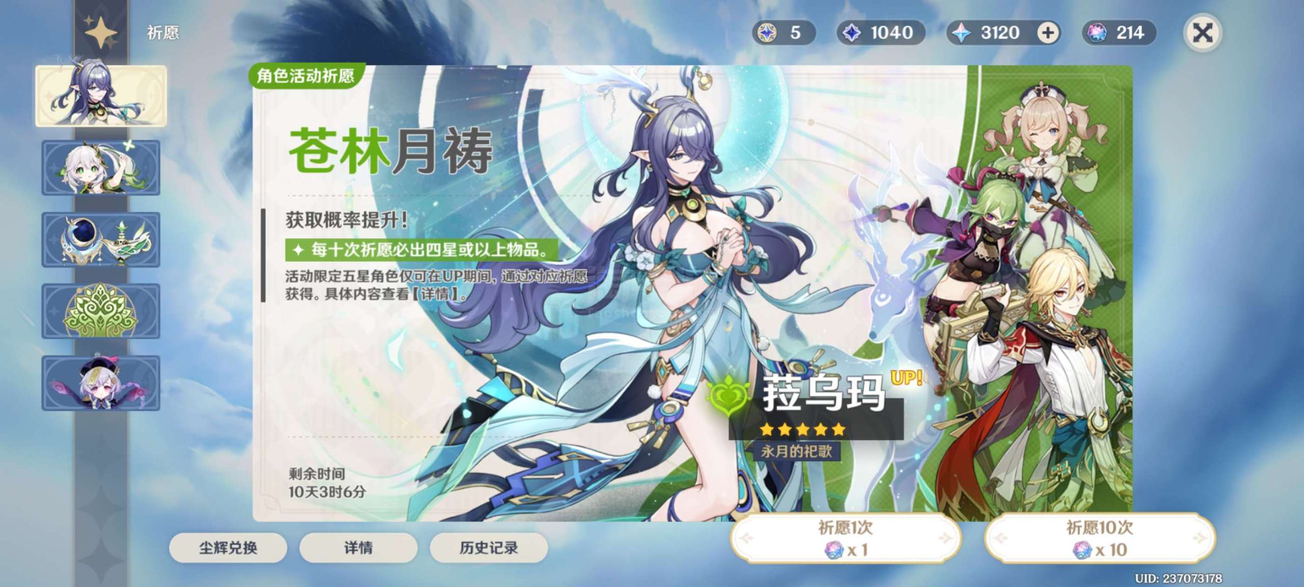 目前已经235抽,垫54,地图大概还能搞30活动也没做,伊涅芙也有,月感电万金油角色,火神都有专武武