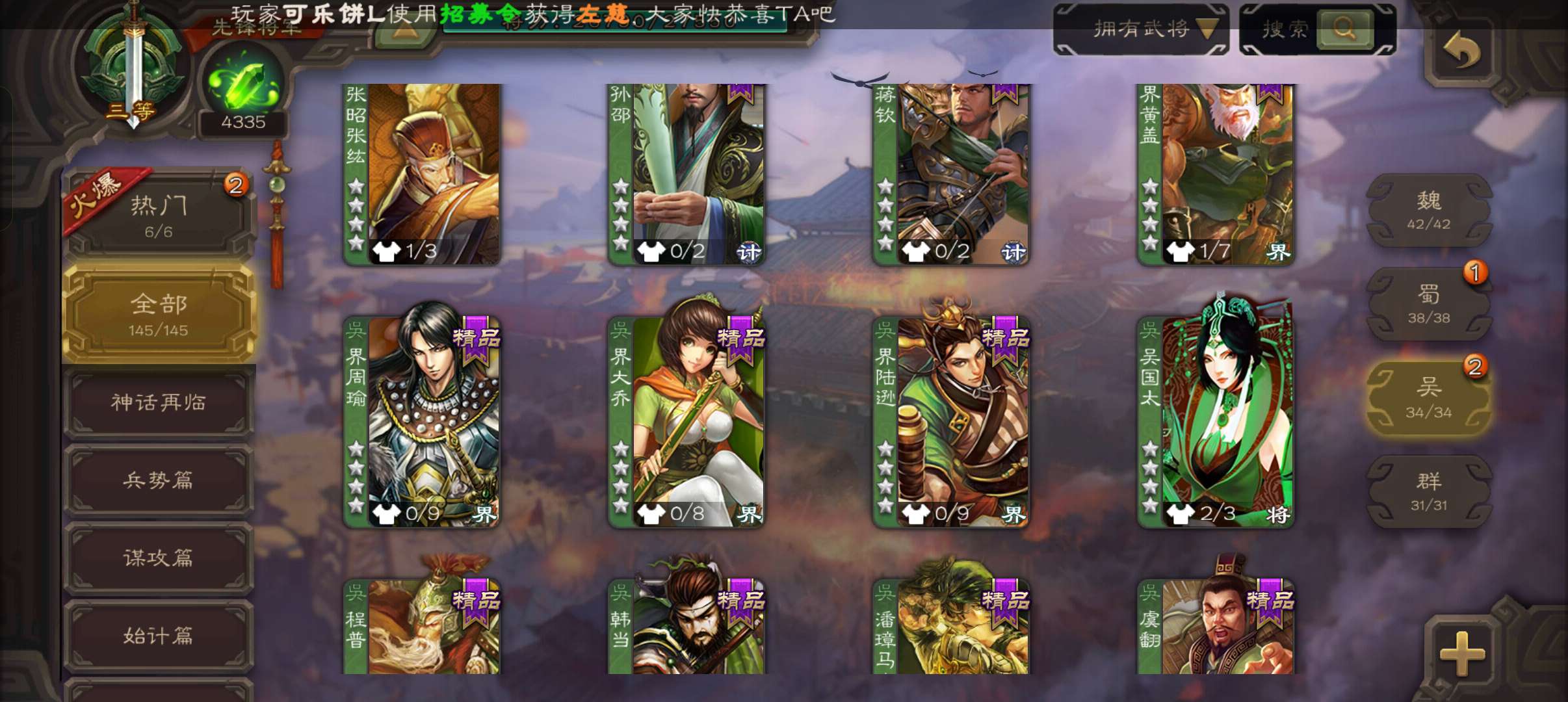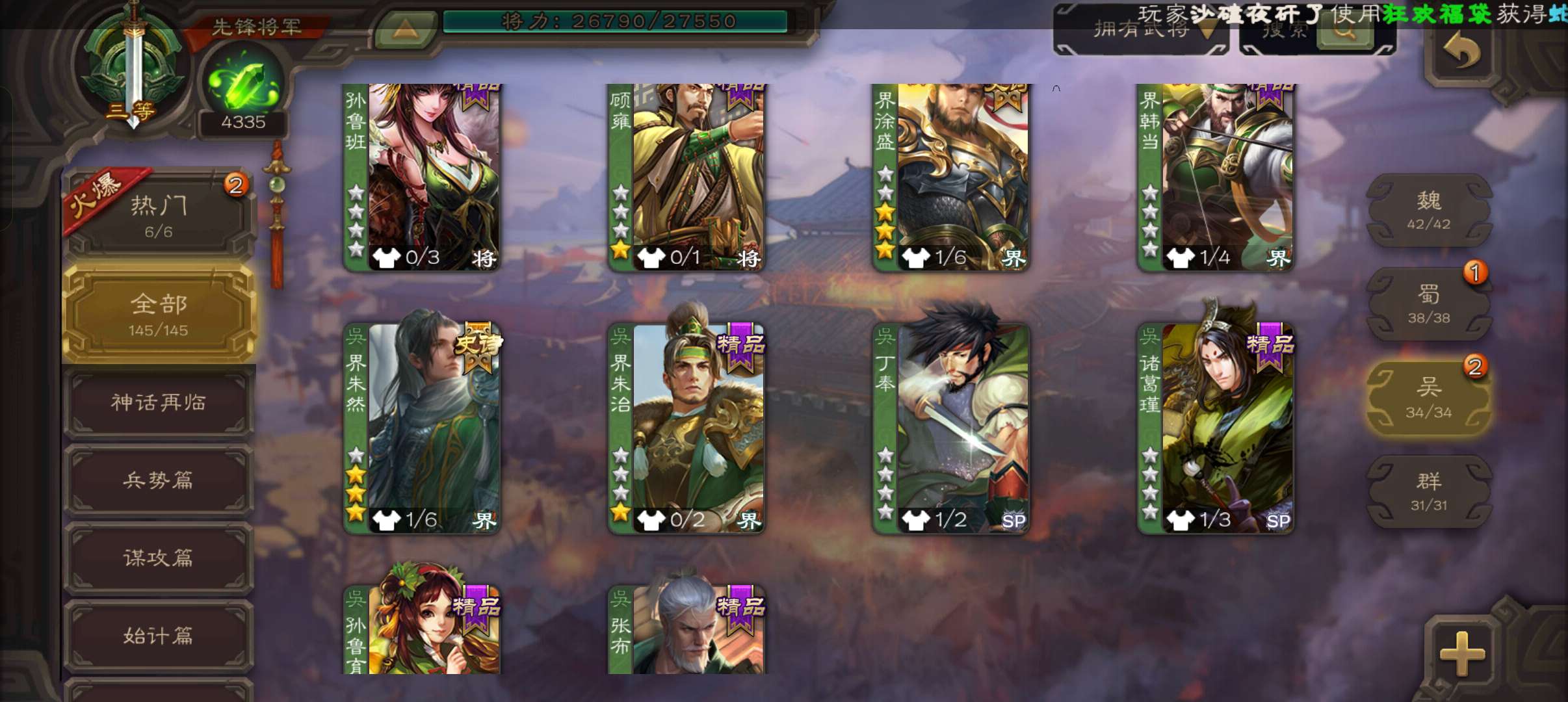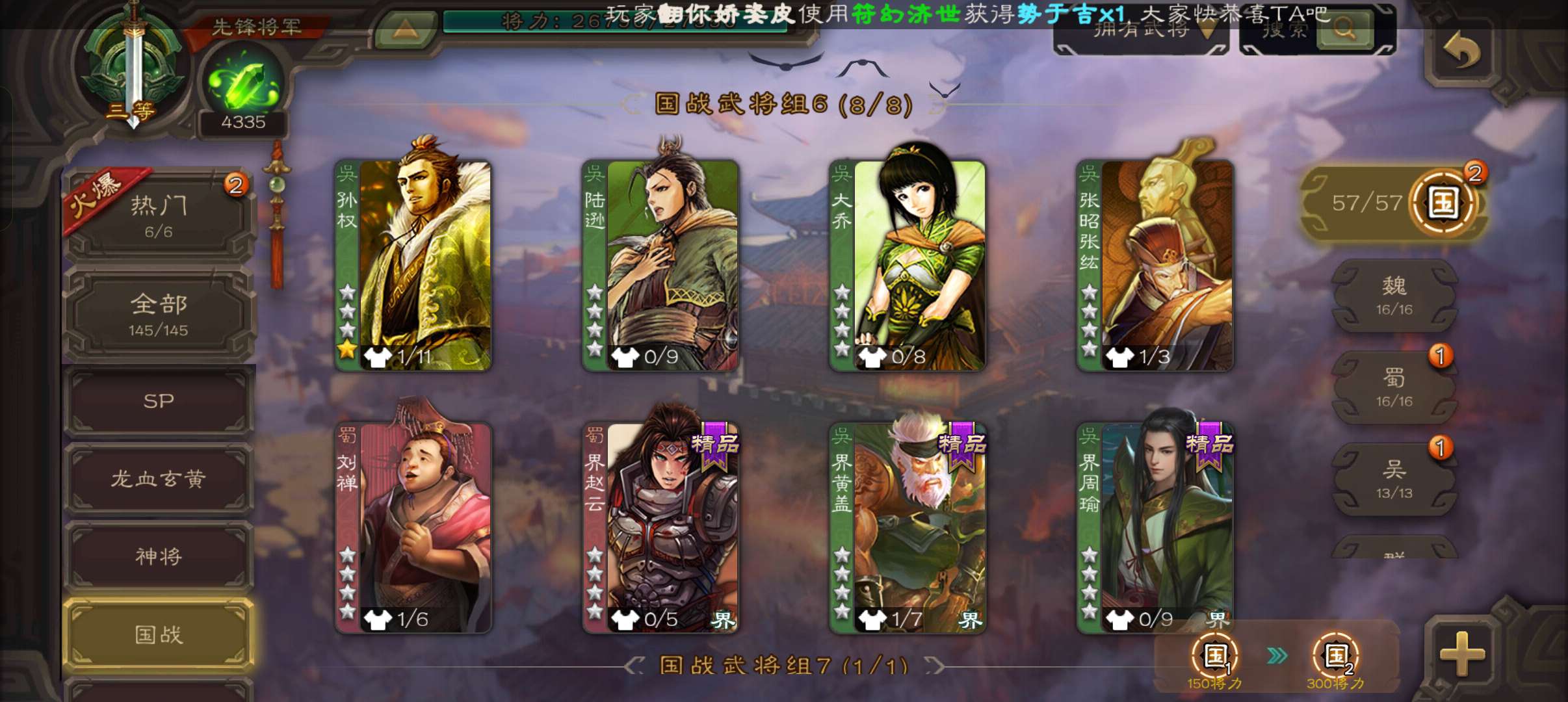 4300将魂,大宝界徐盛戏志才界朱然谯周4史诗先锋,谋高顺甘夫人张布彭恙145将