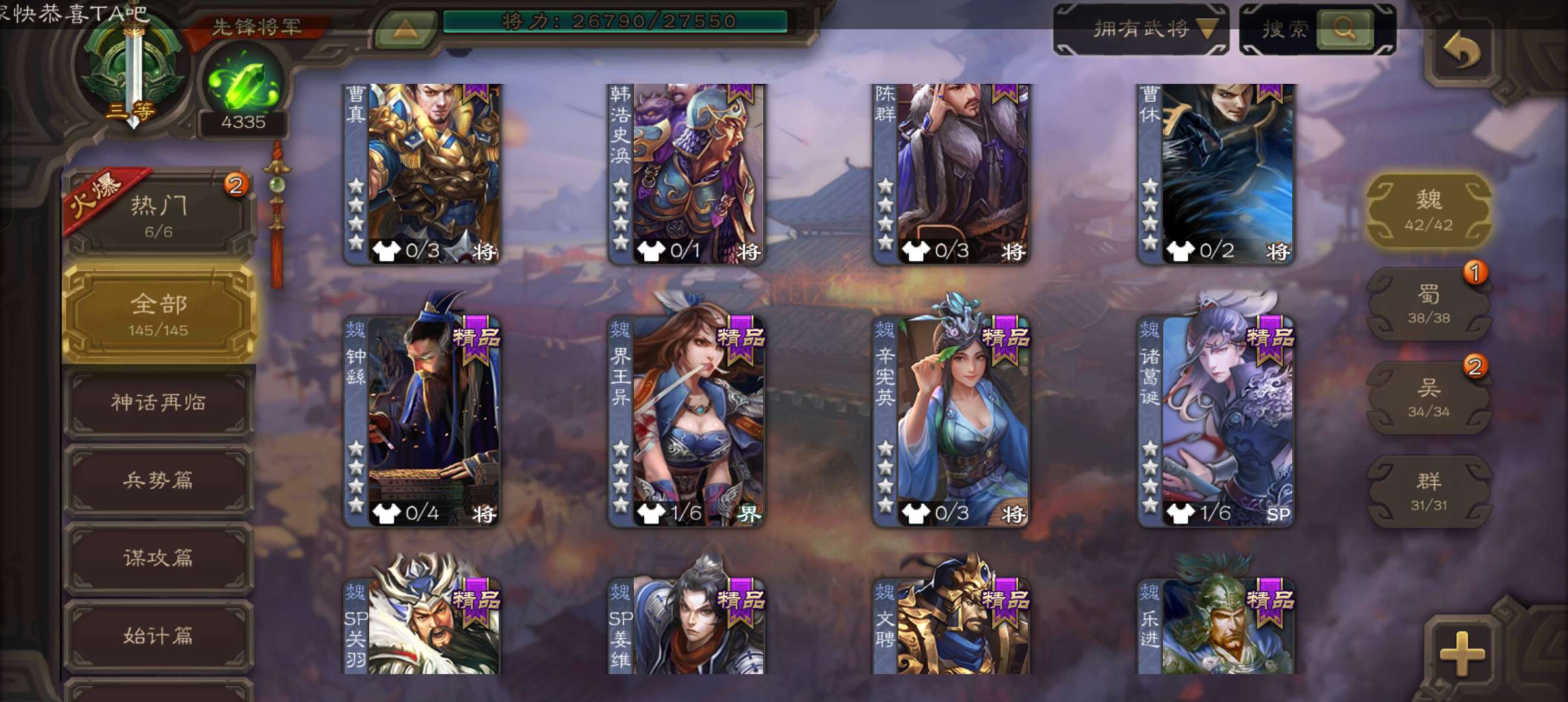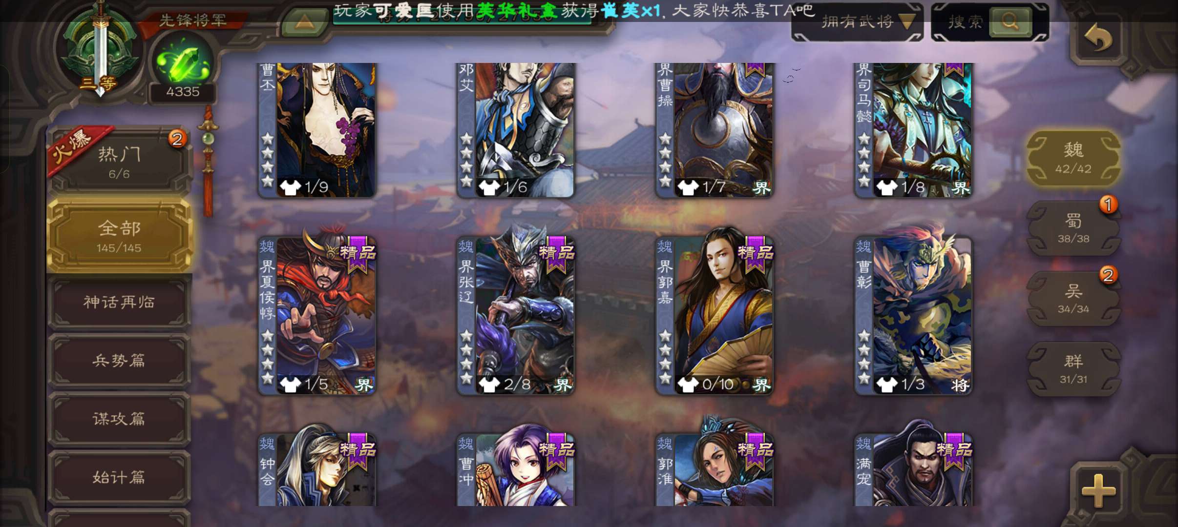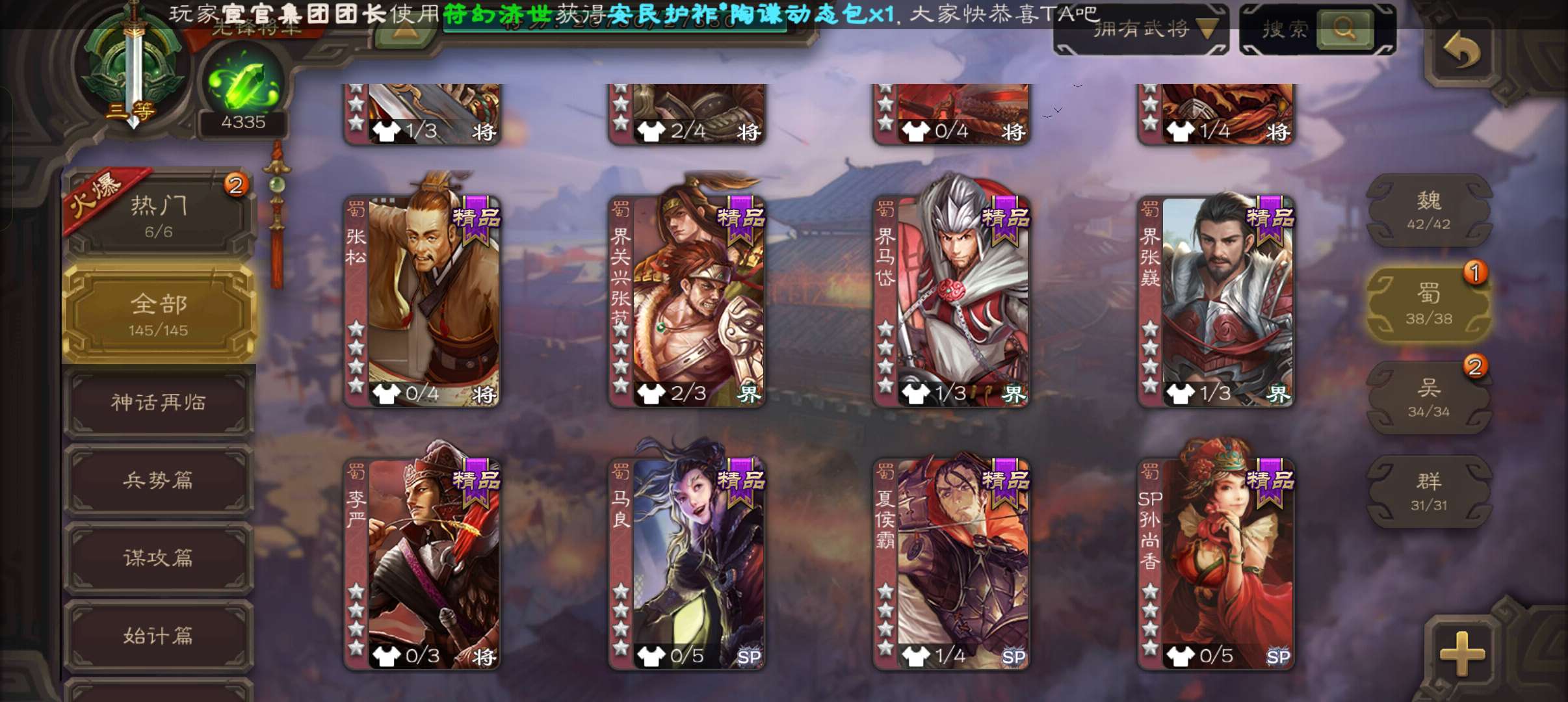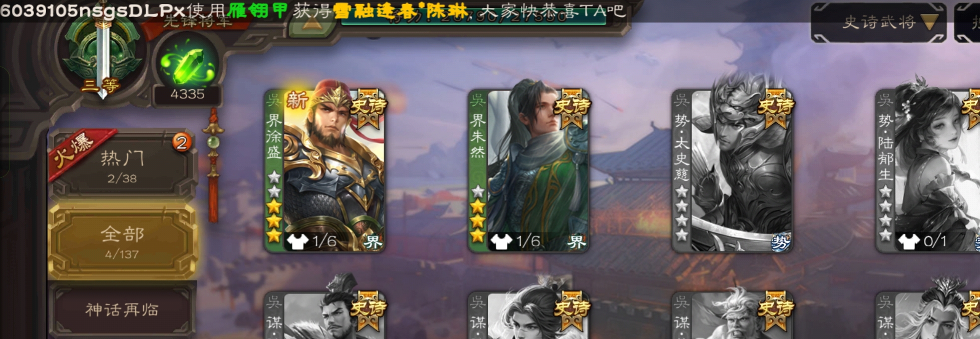4300将魂,大宝界徐盛戏志才界朱然谯周4史诗先锋,谋高顺甘夫人张布彭恙145将