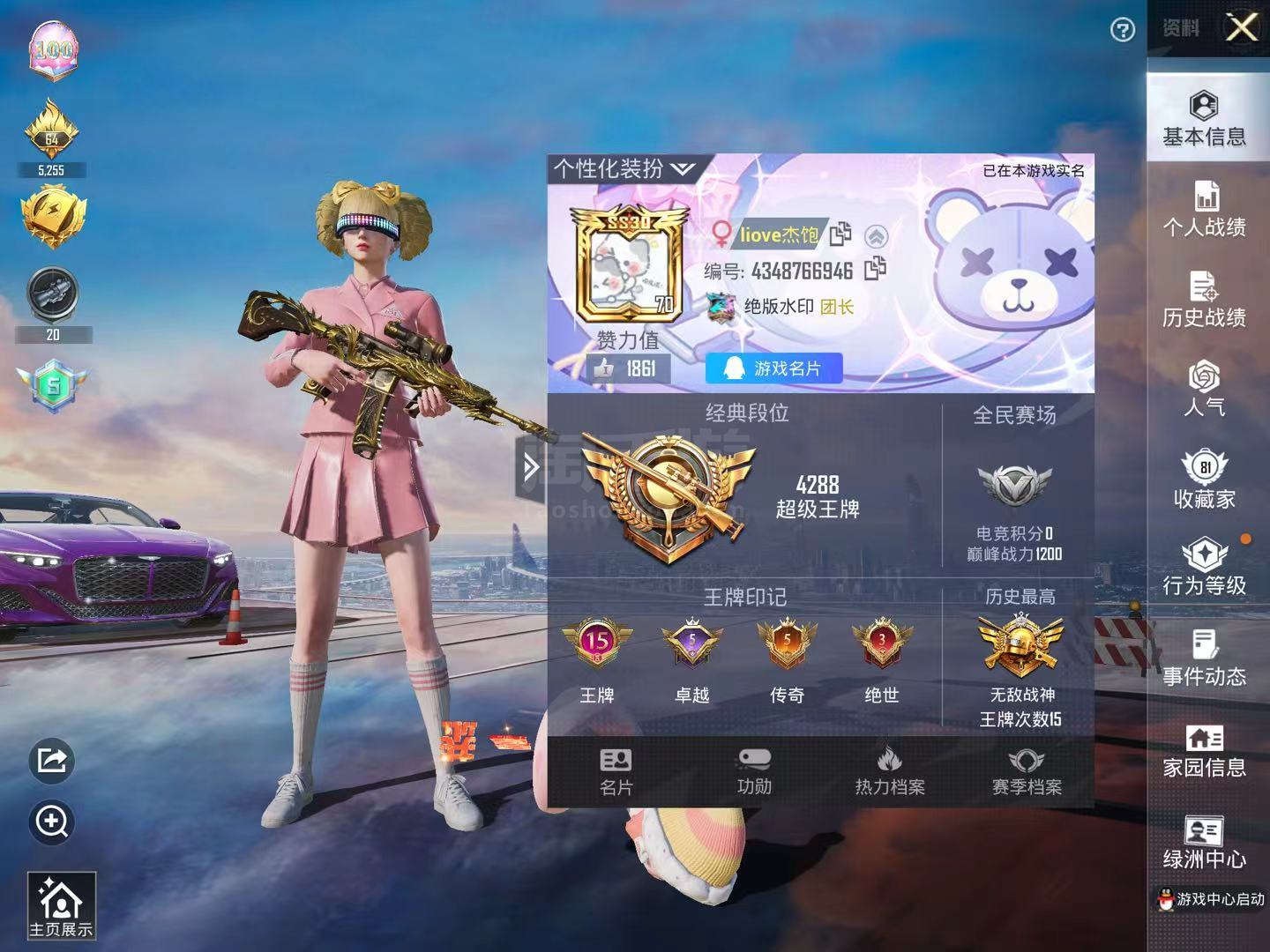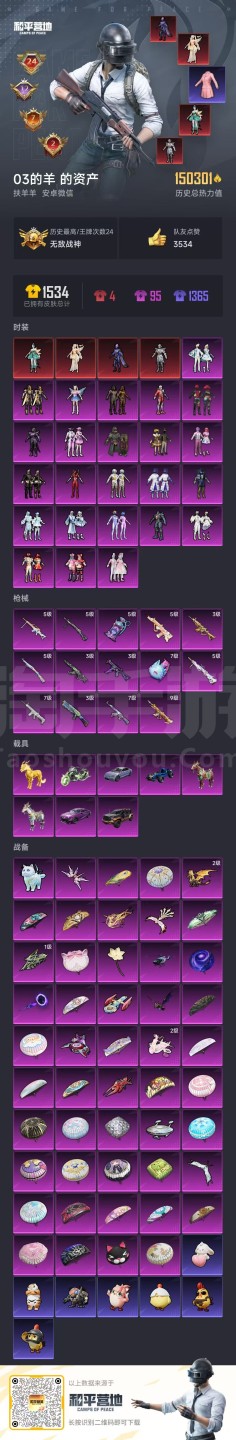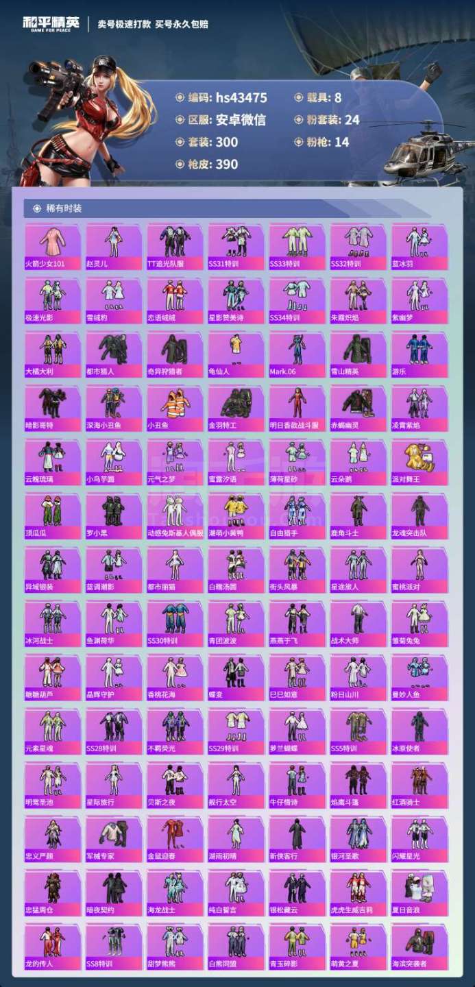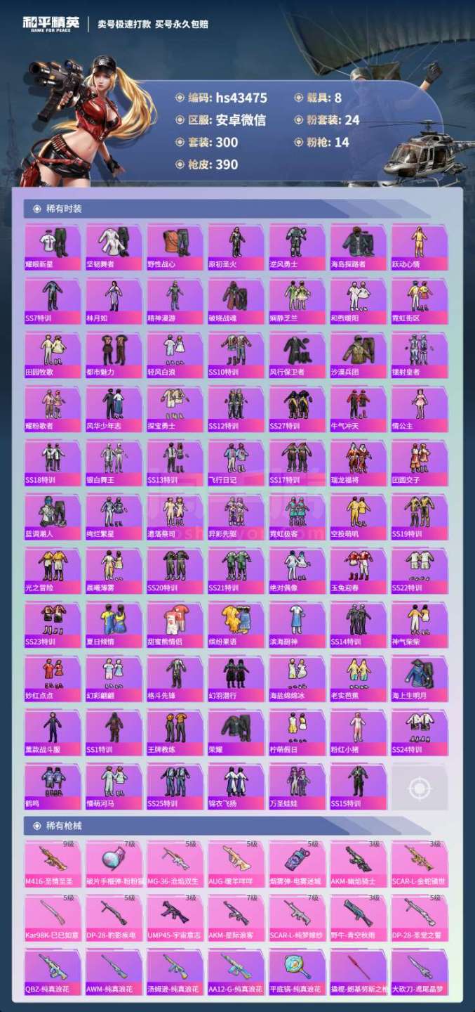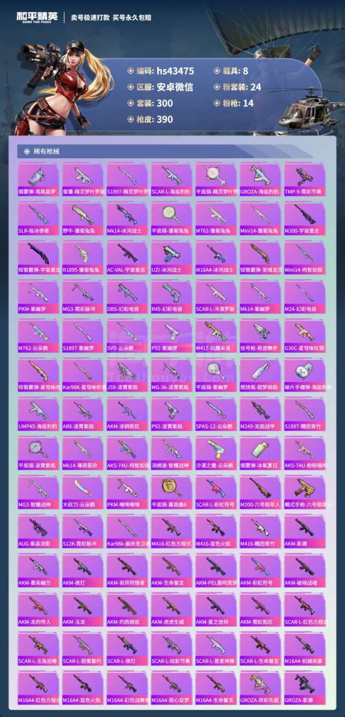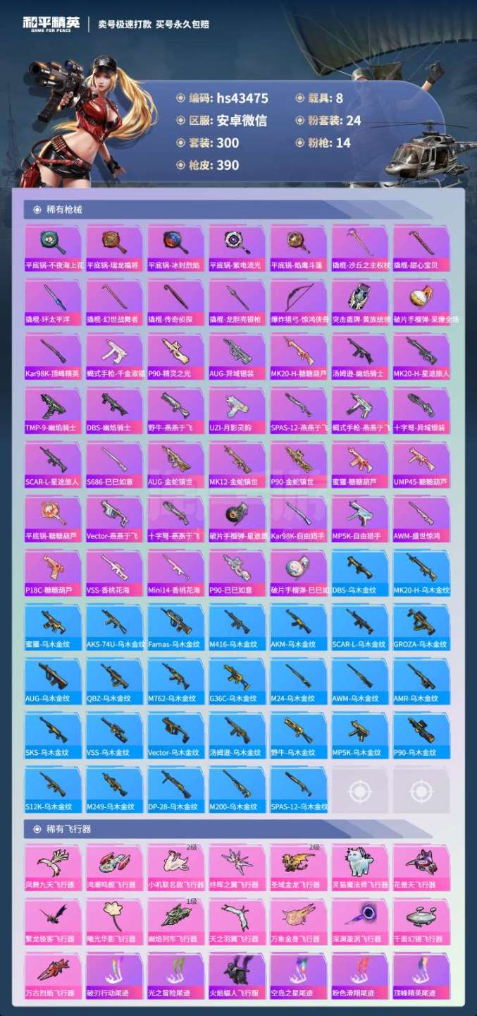 和平精英【安卓微信】hs43475 安卓微-24王牌印记-有战神框-24粉装-14特效枪-8载具-150301热力值-