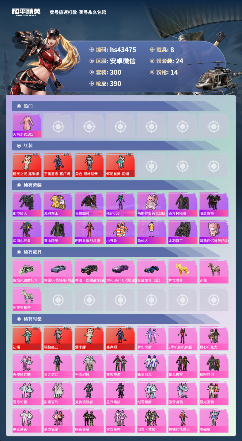 hs43475 安卓微-24王牌印记-有战神框-24粉装-14特效枪-8载具-150301热力值-