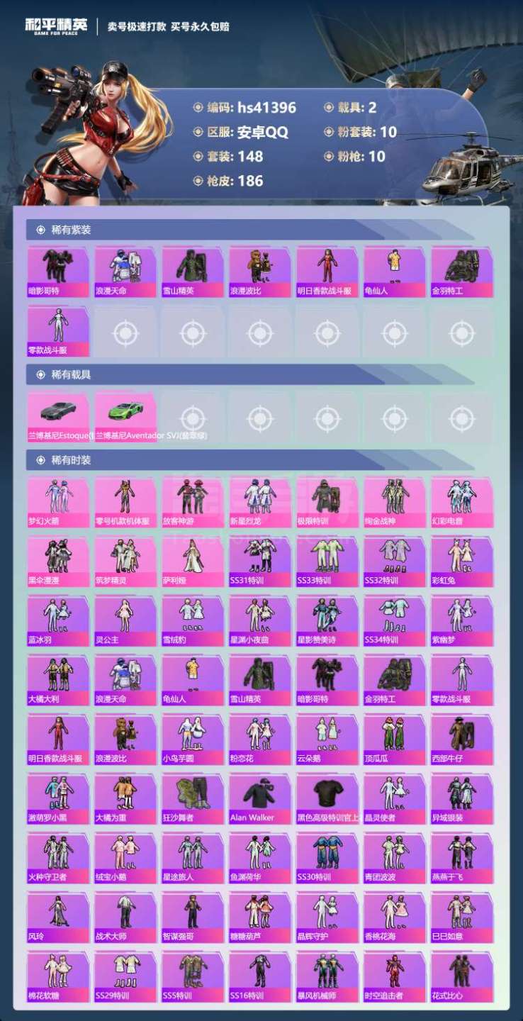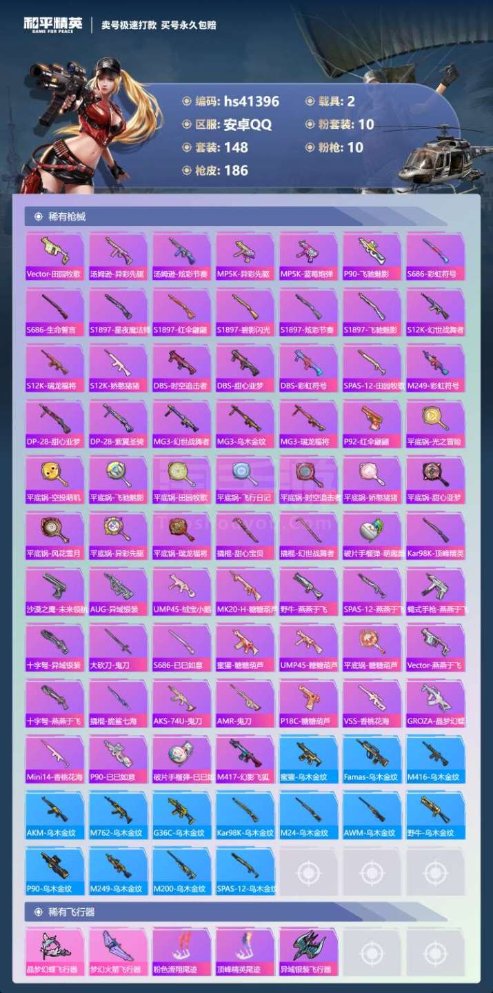 hs41396 安卓手Q-10王牌印记-10粉装-10特效枪-2载具-68477热力值-148套装-