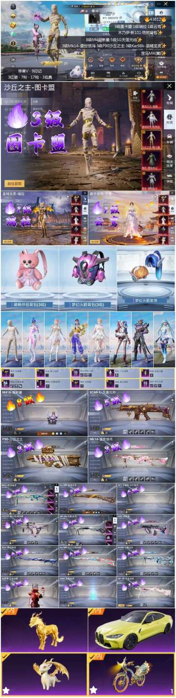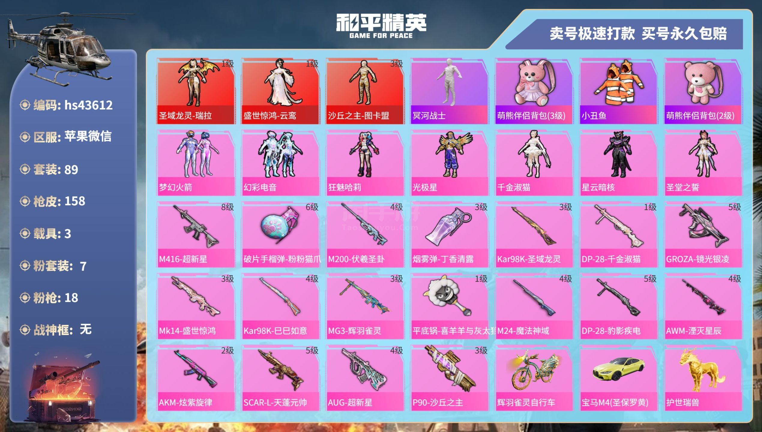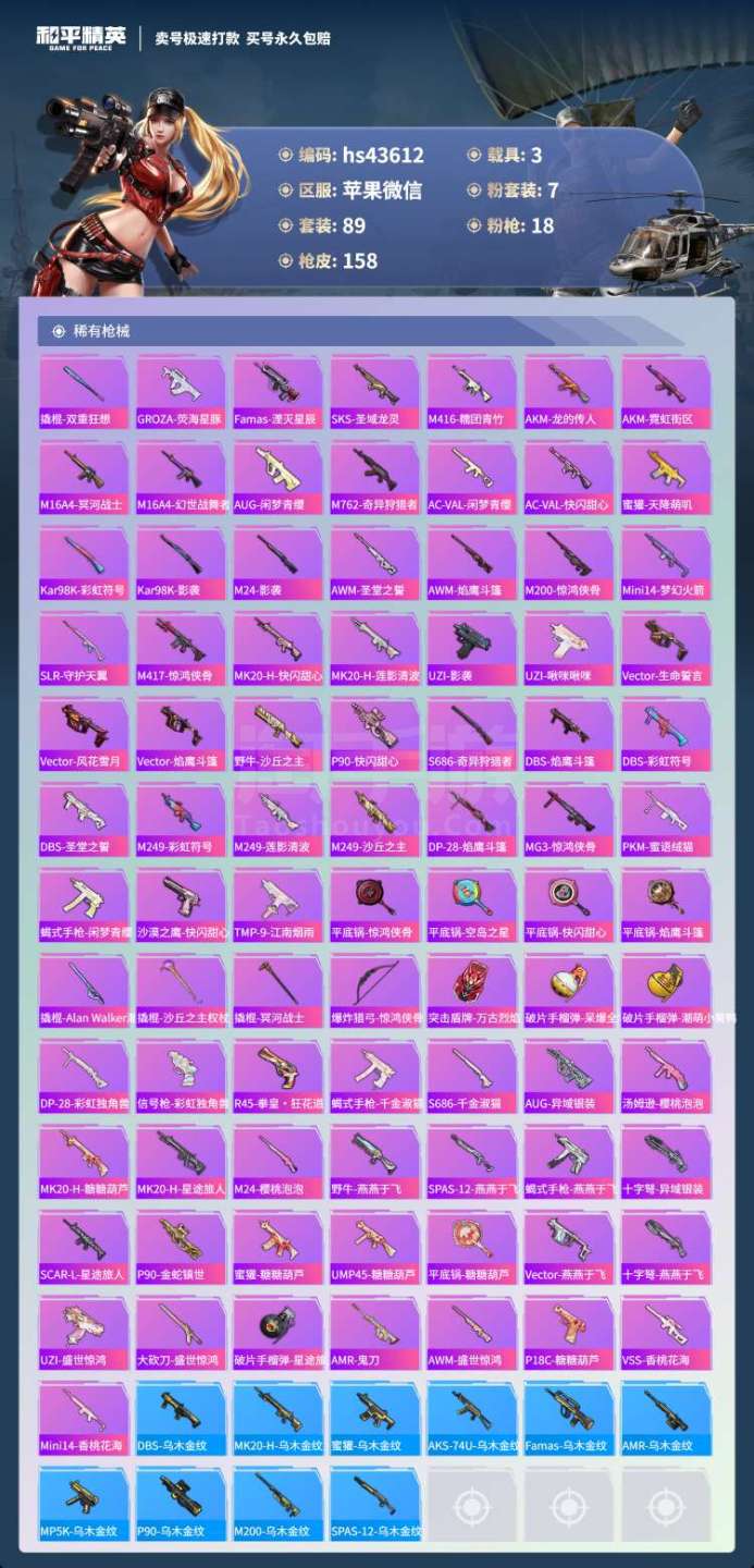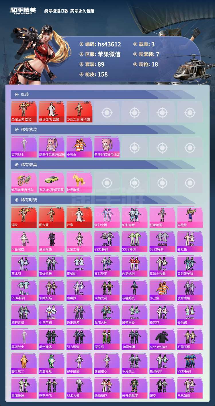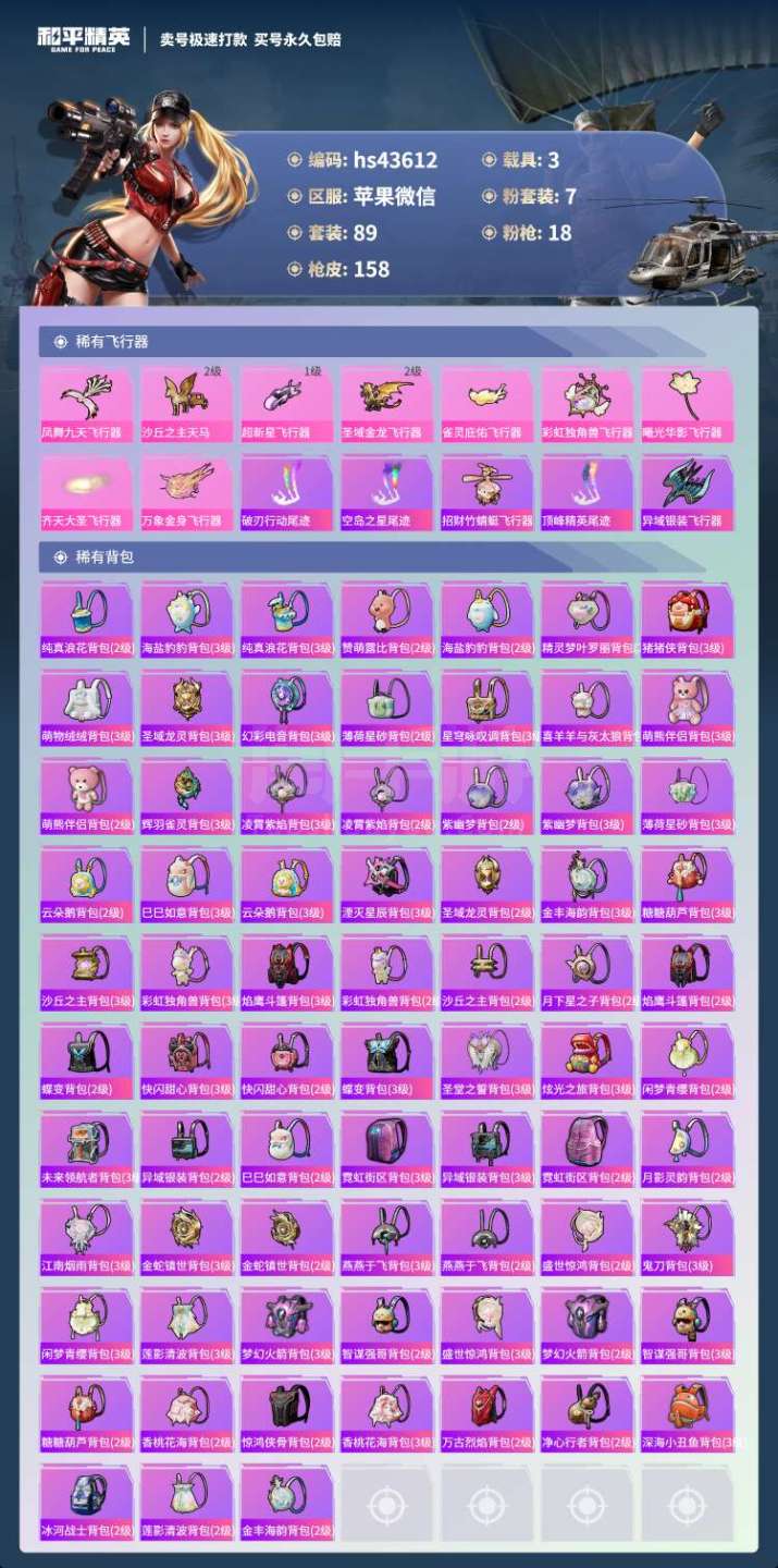 hs43612 苹果v-9王牌印记-7粉装-18特效枪-3载具-70384热力值-89套装-158